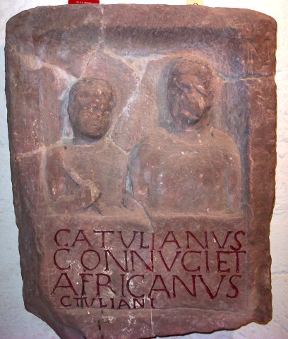 De Saverne, dans le mur d'enceinte gallo-romain. Grès rose. Hteur : 1,25 m; lgeur : 0,90 m. IIIe s. Le couple et leur enfant se tiennent debout et de face dans une niche. La femme, à gauche, est vêtue d'un manteau sur une robe longue. Elle tient une passoire dans la droite et un objet difficile à définir dans la gauche, peut-être un entonnoir. Son époux porte une tunique. Il tient un gobelet dans la main droite et, dans la gauche, un marteau de tonnelier. A gauche de l'homme, leur fils tient une grappe de raisin de la main droite et une galette de l'autre.