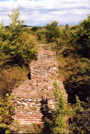Fig.3 : Plan général du site de Caricin Grad.Si l'on accepte, au moins provisoirement, d'identifier l'espace urbain avec l'aire entourée de remparts en dur, on peut dire que grâce aux fouilles menées depuis 1912, la structure urbaine de Caricin Grad est bien connue dans ses grandes lignes1 (fig.3). La ville occupe l'extrémité nord d'un plateau resserré entre deux petites rivières, qui culmine à une altitude de 397,50 m. Les murailles la partagent en trois entités distinctes, appelées traditionnellement Acropole, Ville Haute et Ville Basse.L'Acropole, établie au Nord-Ouest, au point le plus élevé, couvre une superficie d'environ 1ha. Elle est entourée d'un rempart de forme irrégulière, percé d'une seule porte à l'Est. De part et d'autre de la rue unique, bordée de portiques, prennent place au Sud la grande basilique épiscopale flanquée d'un baptistère, et au Nord un ensemble de trois bâtiments où l'on a voulu voir le « palais épiscopal ». La Ville Haute, qui englobe l'Acropole, est elle aussi entourée d'un rempart irrégulier, polygonal au Nord, avec un appendice trapézoïdal au Sud. La tour d'angle sud-ouest avait été aménagée en château d'eau. Deux portes ont été fouillées : celle de l'Est, en fer à cheval, et celle du Sud, flanquée de tours pentagonales. Les quelque 5ha de la Ville Haute sont divisés en quatre quartiers inégaux par deux grandes rues à portiques, non perpendiculaires. À leur intersection, une place circulaire de 22 m de diamètre marquait le centre monumental de la ville. Parmi les bâtiments fouillés à proximité de cette place, on remarque une rangée de boutiques le long de la rue est et, un peu plus au Nord, une petite basilique à atrium. Dans la partie sud de la Ville Haute, on connaît, du côté est de la rue principale, une église cruciforme2, et du côté ouest une série de bâtiments dont nous verrons qu'ils appartenaient sans doute à un même ensemble : au pied de l'Acropole, une petite basilique à piliers ; plus au Sud, une résidence incomplètement explorée, appelée « villa urbana », possédant une salle à manger à abside ; enfin, dans l'angle sud-ouest des remparts, un complexe que nous avons interprété comme le quartier général de la garnison3. La Ville Basse, dont les murs est et ouest prolongent ceux de la Ville Haute, a une forme allongée, nettement trapézoïdale, et une superficie d'environ 3ha. Elle disposait de deux portes, à l'Est et au Sud, flanquées l'une comme l'autre de tours carrées. L'axe principal était évidemment la grande rue Nord-Sud, qui était bordée de portiques à colonnes, et à laquelle se raccordait une autre rue conduisant à la porte orientale. De part et d'autre de cette dernière rue ont été fouillées deux églises : au Sud une vaste basilique à transept et atrium, au Nord une église double. En face de ces deux églises, à l'Ouest de la rue principale, se trouvait une grande citerne qui n'a été que repérée par un sondage mais qui, d'après la configuration du terrain, devait mesurer environ 50 x 40m. Elle alimentait en eau deux ensembles thermaux : l'un, non porté sur le plan, était près de la porte sud de la Ville Haute, l'autre hors les murs, devant la porte est de la Ville Basse. L'espace situé dans l'angle sud-ouest des remparts était occupé par un quartier d'habitation, qui a fait l'objet d'une fouille en extension ces dernières années4. Fouilles de la ville basse en 1998. Signalons enfin que douze piliers d'un aqueduc venant peut-être de la Petrova Gora ont été fouillés sur le plateau sud-ouest, et que deux églises ont été découvertes à l'extérieur des murailles : une église triconque à une centaine de mètres au Sud-Est de la Ville Basse, et une église à nef unique à 350 m au Sud-Ouest5. L'aqueduc dans la campagne. La brève description qui précède permet de voir que l'urbanisme de Caricin Grad est un curieux mélange de traditions classiques et d'innovations protobyzantines. Les éléments relevant de l'urbanisme hellénistico-romain sont l'irrégularité du tracé des remparts, qui s'adaptent au plus près au profil du terrain, la structuration de l'espace urbain par de grandes rues rectilignes, bordées de portiques donnant accès à la plupart des bâtiments publics, et l'accent mis sur le carrefour principal. Caractéristiques du VIe siècle en revanche sont la taille réduite de l'espace fortifié en dur (8 ha au total, alors que bien des villes moyennes des IVe-Ve siècles couvraient de 20 à 50 ha), son fractionnement en plusieurs entités étagées, dotées chacune d'un rempart propre, et la renonciation à tout dégagement mettant les monuments en perspective. Il en est ainsi de la basilique épiscopale (fig.4 et 5) : le visiteur ne peut l'apercevoir tant qu'il n'a pas passé la porte de l'Acropole ; il doit ensuite la contourner par le Nord, et même de l'Ouest ne peut en avoir une vue d'ensemble qu'au travers d'un portique, puisque tout le centre de l'atrium est occupé par une piscine découverte. La reproduction des thèmes classiques à petite échelle et dans un cadre étroit devait entraîner une impression générale d'exiguïté et de resserrement. Ainsi la rue de l'Acropole débouchait sur le rempart, la place circulaire devait paraître comme une sorte de puits, et partout les portiques faisaient écran à la vue. Cette structure urbaine a-t-elle été mise en place en une seule fois, selon un plan préconçu, ou est-elle le résultat d'ajouts et d'adaptations ? La ville n'ayant vécu que 80 à 90 ans, soit trois ou quatre générations, il est évidemment difficile de discerner une évolution dans un laps de temps aussi court. On a pourtant longtemps admis que l'Acropole et la Ville Haute étaient strictement contemporaines, et que la Ville Basse était un ajout, opéré toutefois avant la fin du règne de Justinien6. Or, les recherches récentes ont remis en question cette conception traditionn