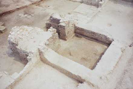 • 13. Ce bâtiment n'a pas été dégagé jusqu'à son extrémité nord, mais le fait que trois des quatre pièces fouillées ne donnent pas sur le portique montre bien qu'il ne s'agit pas de boutiques.