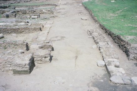 L'orientation de la rue étant ainsi bien établie, on a pu remarquer que le mur de fond de son portique oriental se dirige vers l'angle sud-ouest de l'atrium de la basilique à transept3, et le stylobate de ce même portique vers l'angle nord-ouest de cet atrium. Quant à la rue elle-même, il est maintenant clair que sa partie sud correspond à un tracé reliant en droite ligne la porte sud de la Ville Haute à la porte sud de la Ville Basse. Le changement de direction de cette rue n'est donc pas un simple coude, mais revêt, au moins pour le mur de fond de son portique est, la forme d'un décrochement « en baïonnette ». La rue se compose ainsi de trois segments : un segment nord prolongeant la rue sud de la Ville Haute ; un segment sud dans l'axe des portes de la Ville Haute et de la Ville Basse ; un court segment intermédiaire correspondant à la largeur de la basilique à transept.