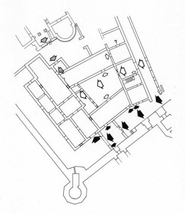 - 3. Disparition de la cour aux armamentaria, réorientation de la basilique transversale dans le sens longitudinal, développement de la chapelle aux signa qui finit par se confondre avec la basilique.