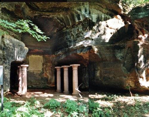 La voûte naturelle s'effondra et l'on tailla celle que l'on voit de nos jours. Au dessus des parois supérieures de la nef centrale, désormais surélevées, on plaça une solide architrave, qui fut fortement détériorée lors d'effondrements ultérieurs.4. Des trous, creusés dans le rocher au dessus de l'architrave, servaient à caler des poutres de soutènement. Il semble ainsi qu'on doive restituer un étage au dessus de la partie centrale de l'édifice5.Une pièce devait précéder les salles cultuelles, et sa façade masquait les deux niveaux. Aucune trace ne subsiste de cette avancée6, mais tous les mithraea comprennent un vestibule. Aujourd'hui, une large surface plane, composée d'humus et de décombres, s'étend devant la grotte. À l'époque romaine, au contraire, le sol s'inclinait vers l'entrée du sanctuaire, auquel on accédait par deux degrés taillées dans le rocher (C)7. Immédiatement au nord de ces marches se trouve une grande cavité, également taillée dans le grès (D). Elle est profonde de la hauteur d'un homme et fait entre 5 et 6m de diamètre. Une partie en est retaillée pour obtenir une plus grande profondeur. Un canal d'écoulement déversait le surplus d'eau vers l'ouest. Ces aménagements servaient peut-être aux ablutions et les bains qu'imposait le rituel8.Il subsiste peu de traces de la décoration du sanctuaire car il fut saccagé dès la fin de l'époque romaine, sans doute par les chrétiens de la région9. Les vestiges se réduisent à des éléments de sculptures de grès qui portent des traces de destruction délibérée10. Deux têtes11, au visage fracassé, appartiennent à des statues isolées, peut-être celles des porteurs de torches Cautes et Cautopates12. Comme dans tous les mithraea, le relief cultuel représentait le dieu solaire égorgeant un taureau ; il devait se dresser sur un socle, devant le mur du fond de la nef centrale. Il n'en reste que les parties génitales de l'animal.