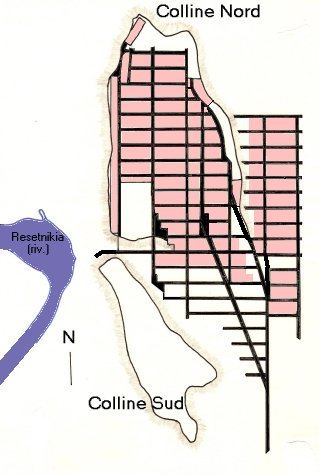 - 1. Les rangées au Sud des insulae auraient été bâties avant celles du Nord. Dans l'insula VII, par exemple, certaines salles des maisons 3 et 5 rompent avec l'orientation générale. D.M. Robinson attribue leurs murs obliques à des constructions antérieures aux maisons elles-mêmes, qui les auraient inclus plus tard.