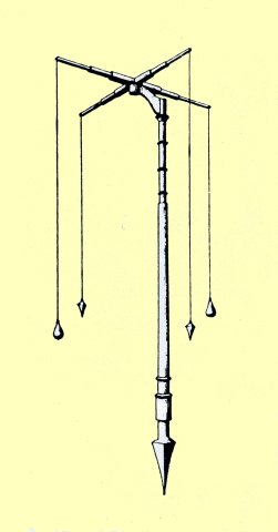 • 3. Le chorobate est composé d'une règle supérieure large et de deux tringles inférieures. Sur l'épaisseur de la règle et sur les tringles sont tracées des lignes verticales perpendiculaires au plan de la règle. Des fils à plomb pendent des deux côtés de la règle et à ses deux extrémités, soit quatre fils à plomb en tout. On est à niveau lorsque les fils à plomb correspondent aux marques verticales. Afin d'éviter l'action du vent sur les fils à plomb, la surface de la règle est creusée d'une cavité remplie d'eau qui permet une vérification.