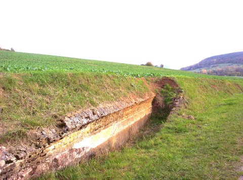 Le mur de bas de pente a 0,35 m de large. L'autre est plus épais car il doit résister à la poussée des terres. On l'avait même renforcé par endroits16. A Ancy, au lieu-dit Mottes où la conduite est à flanc de coteau, ce bouclier est une maçonnerie de pierres sèches. Ce dispositif se retrouve plus loin : on a pu l'observer à Augny, des deux côtés de la conduite cette fois, avec une épaisseur de 0,75 m.