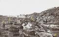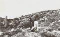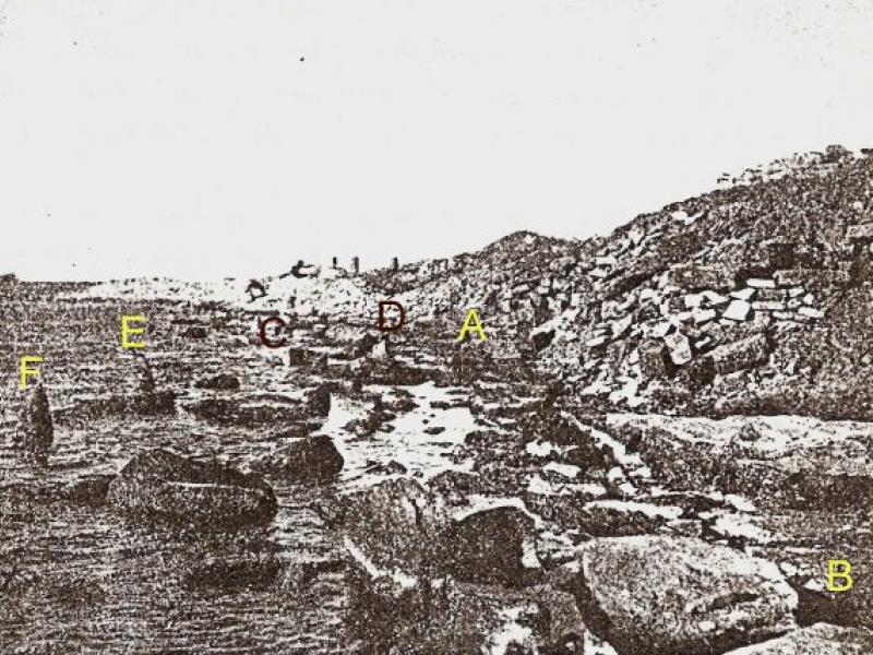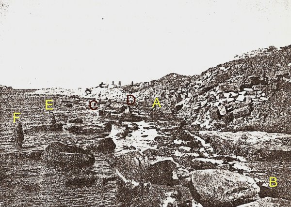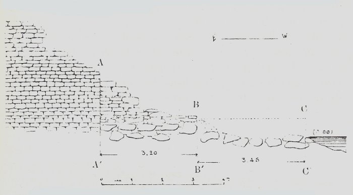 Fig. 36 : Le quai au fond uquatrième bassin. Vu du sud. (A, B : rebord du premier quai. Les bornes C, D, E, F marquent le bord du deuxième quai. On ne voit pas, en avant, les enrochements du troisième état).