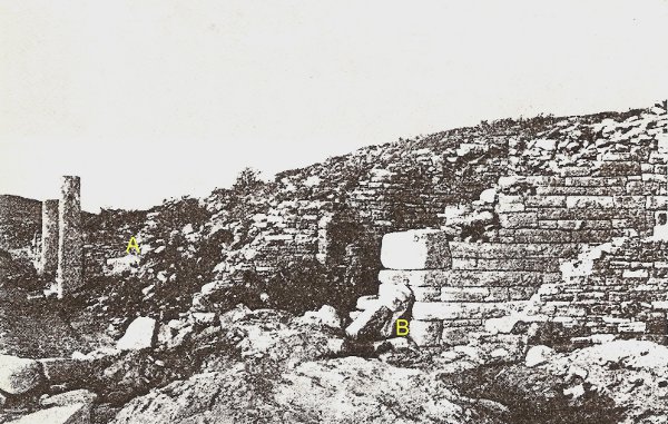 Fig. 38 : Magasins, au fond du troisième bassin. (A, b : façade primitive. Les deux pilastres, au second plan, à gauche, appartiennent à une façade d'époque postérieure ; l'appareil du mur latéral en est plus négligé).