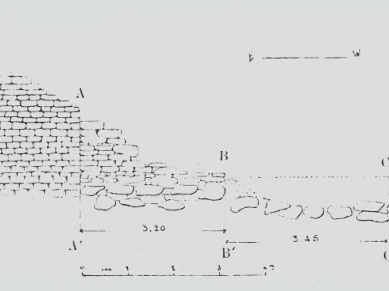 Précisément, en face de cet ouvrage, sur le bord de la mer, on a retrouvé une très ancienne bourgade11 ; le port en était le centre et sa présence avait déterminé le choix de cet emplacement. Les trouvailles de céramique permettent de faire remonter cet établissement au moins jusqu'à l'époque géométrique. Il y a tout lieu de croire que, dès ces temps reculés, le grand môle existait déjà. L'appareil de l'ouvrage, simple amas de blocs tout-à-fait bruts, entassés par de faibles profondeurs, est d'accord avec cette hypothèse. Il se peut qu'il ait subi des réfections postérieures, mais, sous sa forme originelle, il est certainement très ancien.