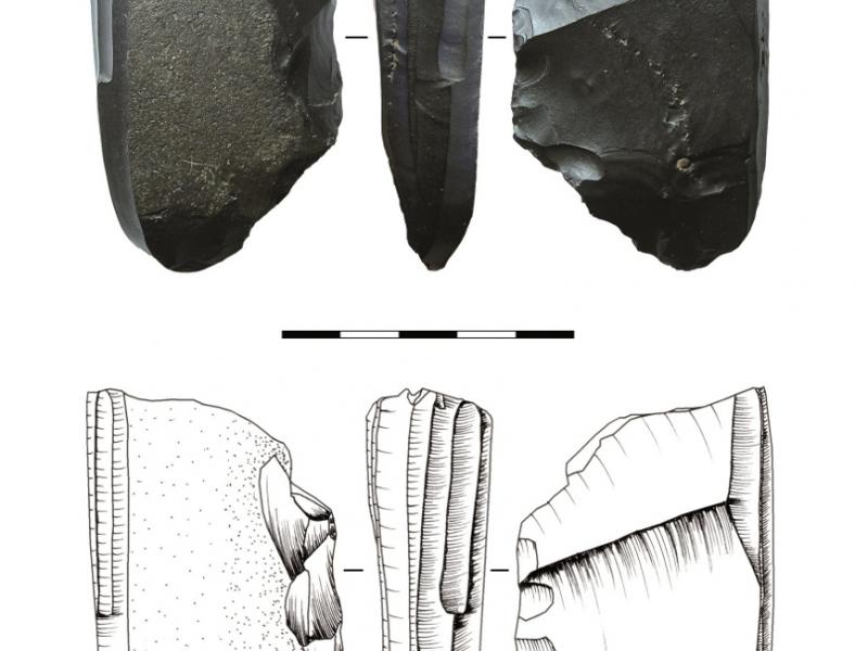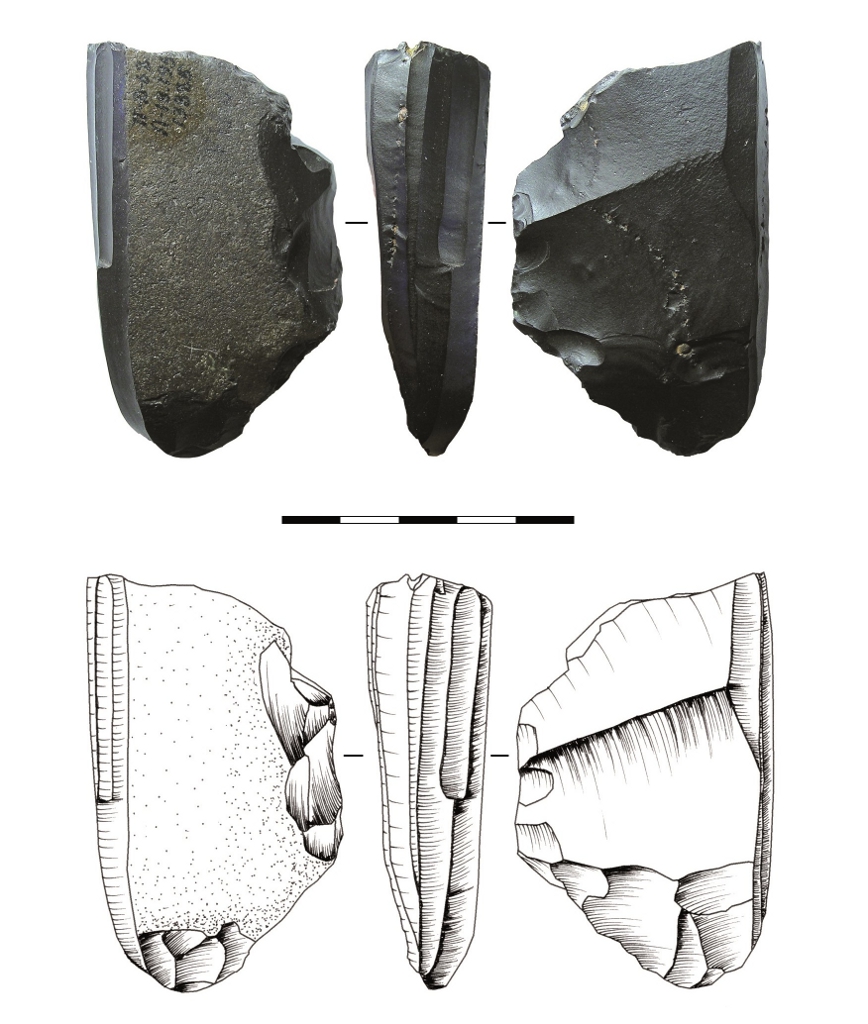 Fig. 1 : Nucléus à lamelles (microlames) de la grotte de Dyuktai. Centre d’Archéologie Arctique et de Paléoécologie Humaine, Académie Russe des Sciences, Iakoutsk, Russie. Photo et dessin : Gomez Coutouly 2011b (fig. 6.4).