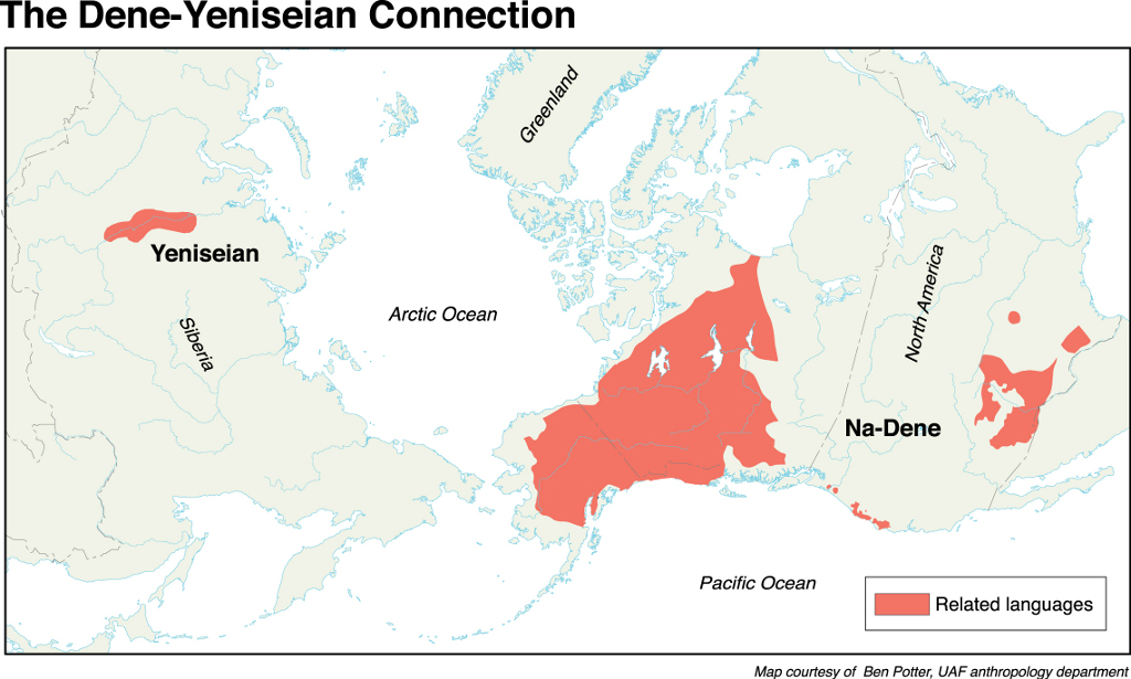Plus récemment, Edward Vajda3 a présenté des preuves convaincantes d’une relation génétique entre les langues na-dené et ienisseïennes. La datation de la séparation des deux familles de langues demeure problématique, mais il semblerait que les premiers locuteurs na-dené soient venus en Amérique il y a au moins 6000 ans. Notons que la plupart des linguistes sont sceptiques quant à la possibilité de retracer l’histoire des langues au-delà de 10 000 cal BP.