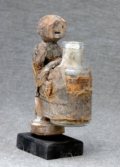 Ce type d’objets ne sert pas directement au culte des divinités vodoues mais il en contient le principe actif, au sens où l’on associe un vodou à l’objet, de la même manière que l’on dédie une prière à un saint. On ne les trouve donc pas sur les autels des temples, mais plutôt chez les gens ou en « pension » chez un charlatan1 ; ce dernier en prendra soin de manière convenable, en réalisant les libations requises. Si ces objets savaient parler, c'est-à-dire si l’on en retrouvait les commanditaires, ils évoqueraient les aléas d’une vie sociale mouvementée, entre espoirs fous et désillusions tragiques, dont la somme dresserait la chronique d’une époque complexe.