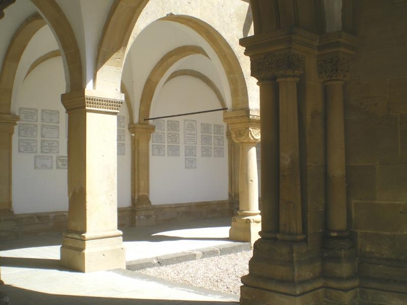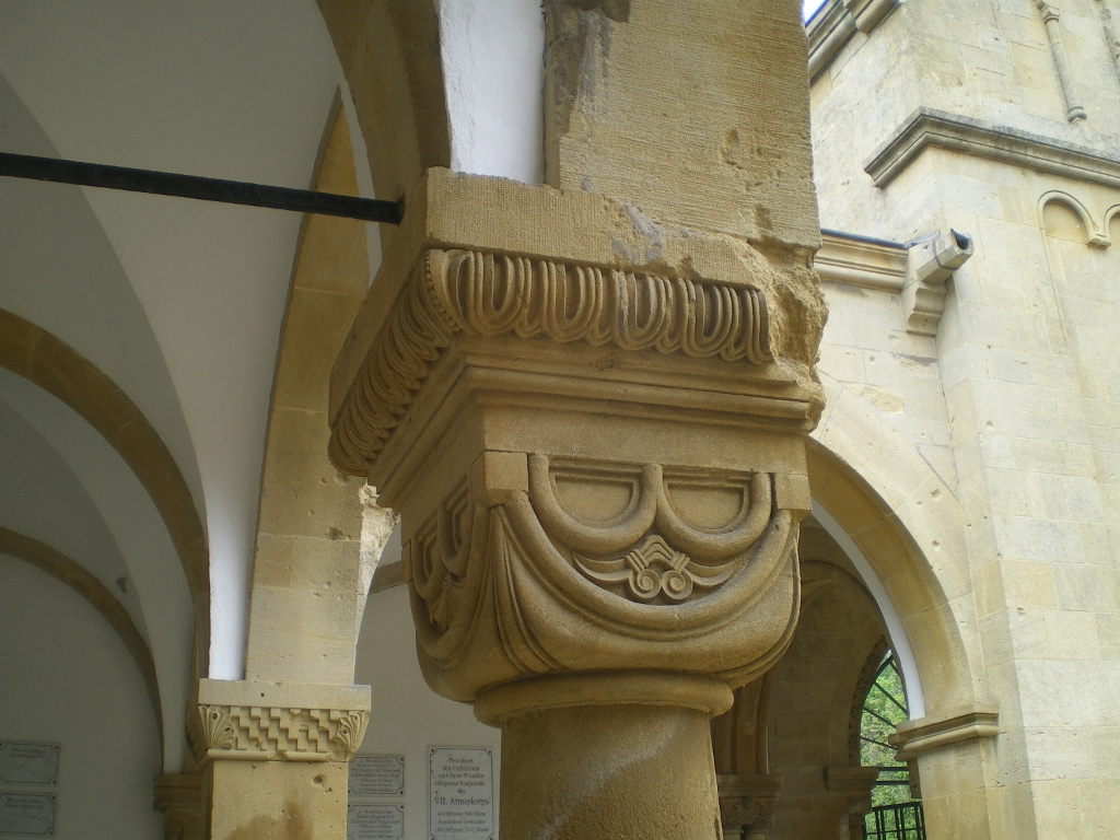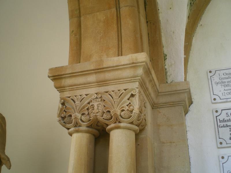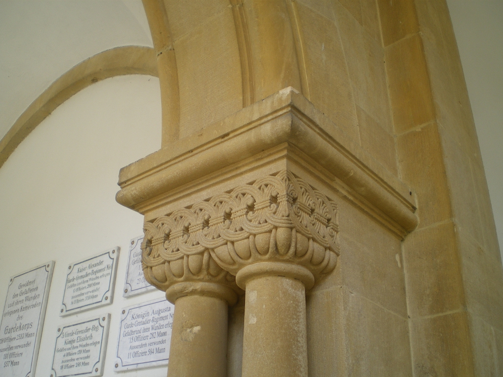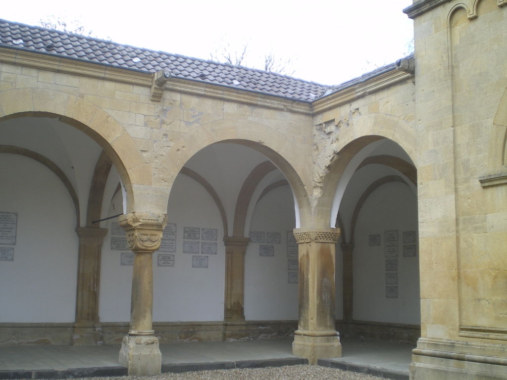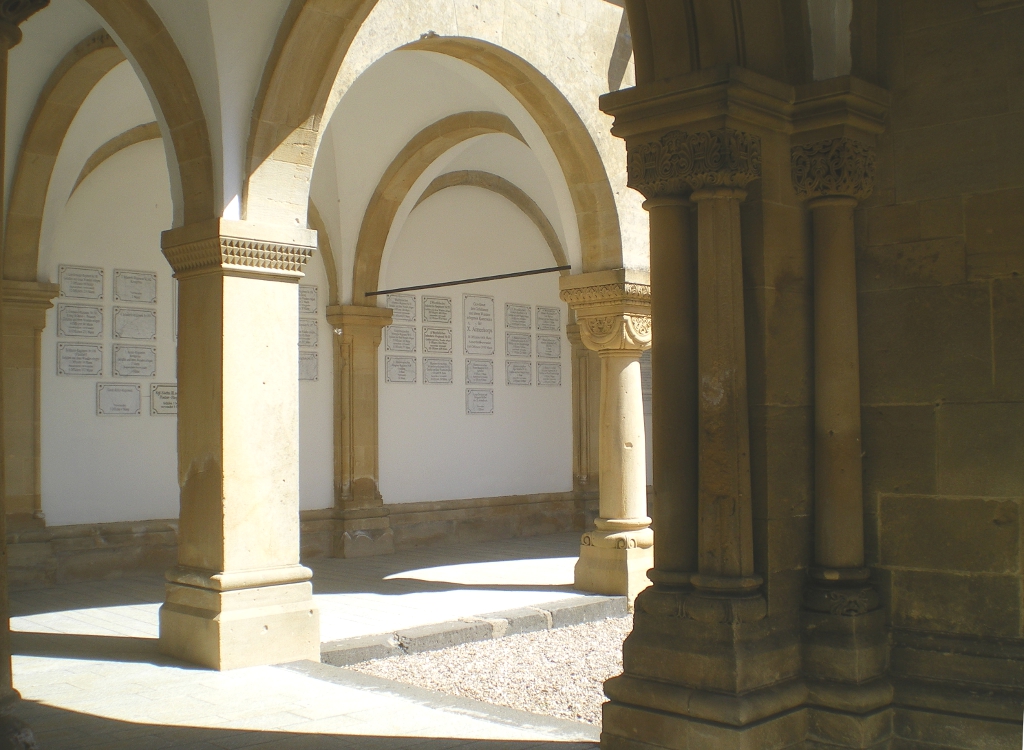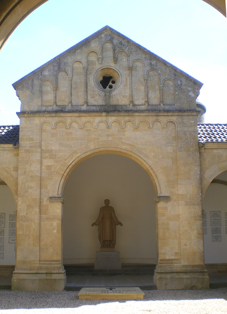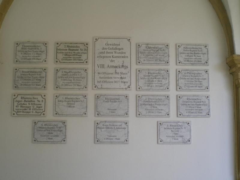Cauer avait aussi réalisé le buste de l'Empereur Guillaume Ier qui se trouvait dans la cour ; le socle donnait au souverain le titre de Guillaume le Grand. Sous les arcades du cloître, de grands médaillons de bronze représentaient en bas-relief les chefs militaires : le Feldmarschall Steinmetz et le Prince Frédéric-Charles, qui commandaient respectivement la Ière et la IIe Armée, Bismarck, Moltke, Roon et d’autres. Ces portraits, œuvre du sculpteur messin Knittel, provenaient de la tour du Point-du-Jour ; ils ont disparu mais le Musée de Gravelotte expose les modèles de plâtre qui ont servi à les réaliser. De grandes plaques de marbre noir portaient en lettres dorées le nom des corps d’armée et le nombre de leurs officiers et soldats tombés à Gravelotte ; des plaques plus petites, en marbre blanc, donnaient le détail des régiments. Les noms de tous les soldats, avec leur grade et le nom de leur corps d’armée, figuraient sur des feuillets de parchemin inclus dans la dernière pierre du monument, qui fut posée le 25 avril 1905 derrière l’ange4.