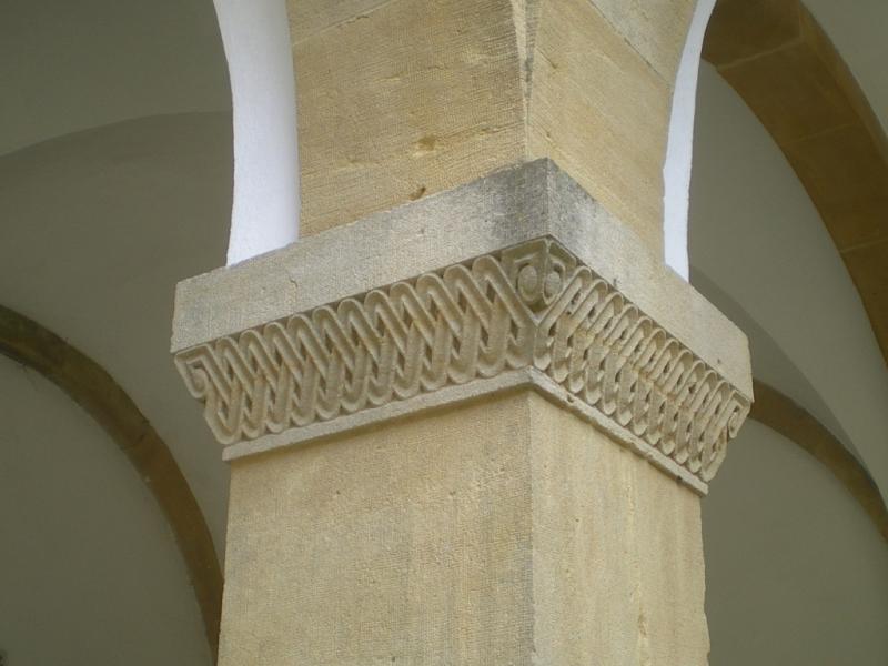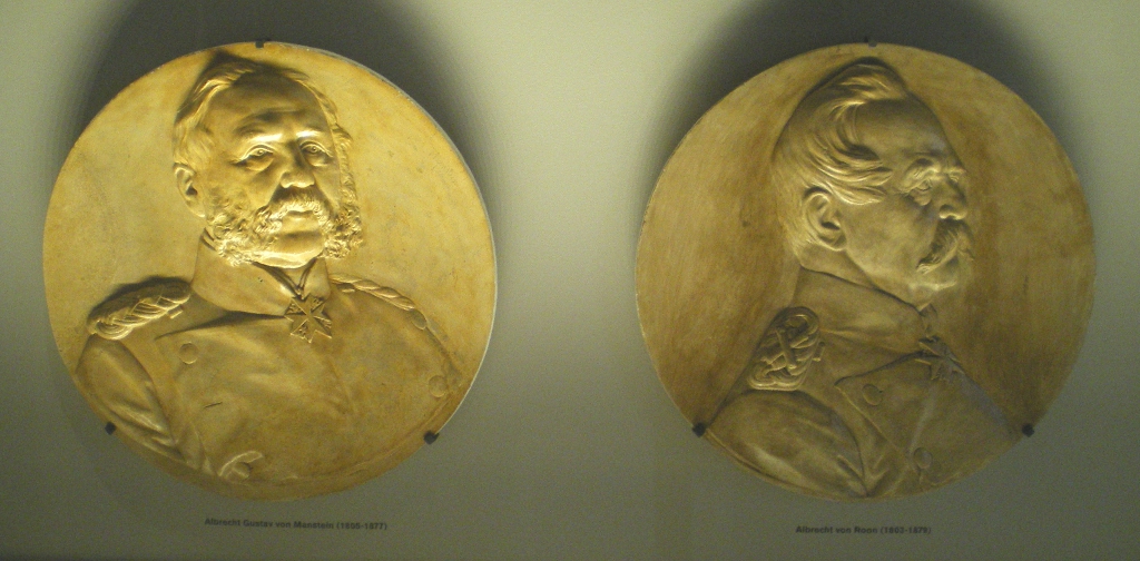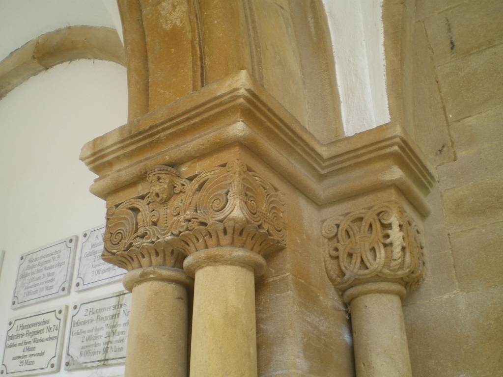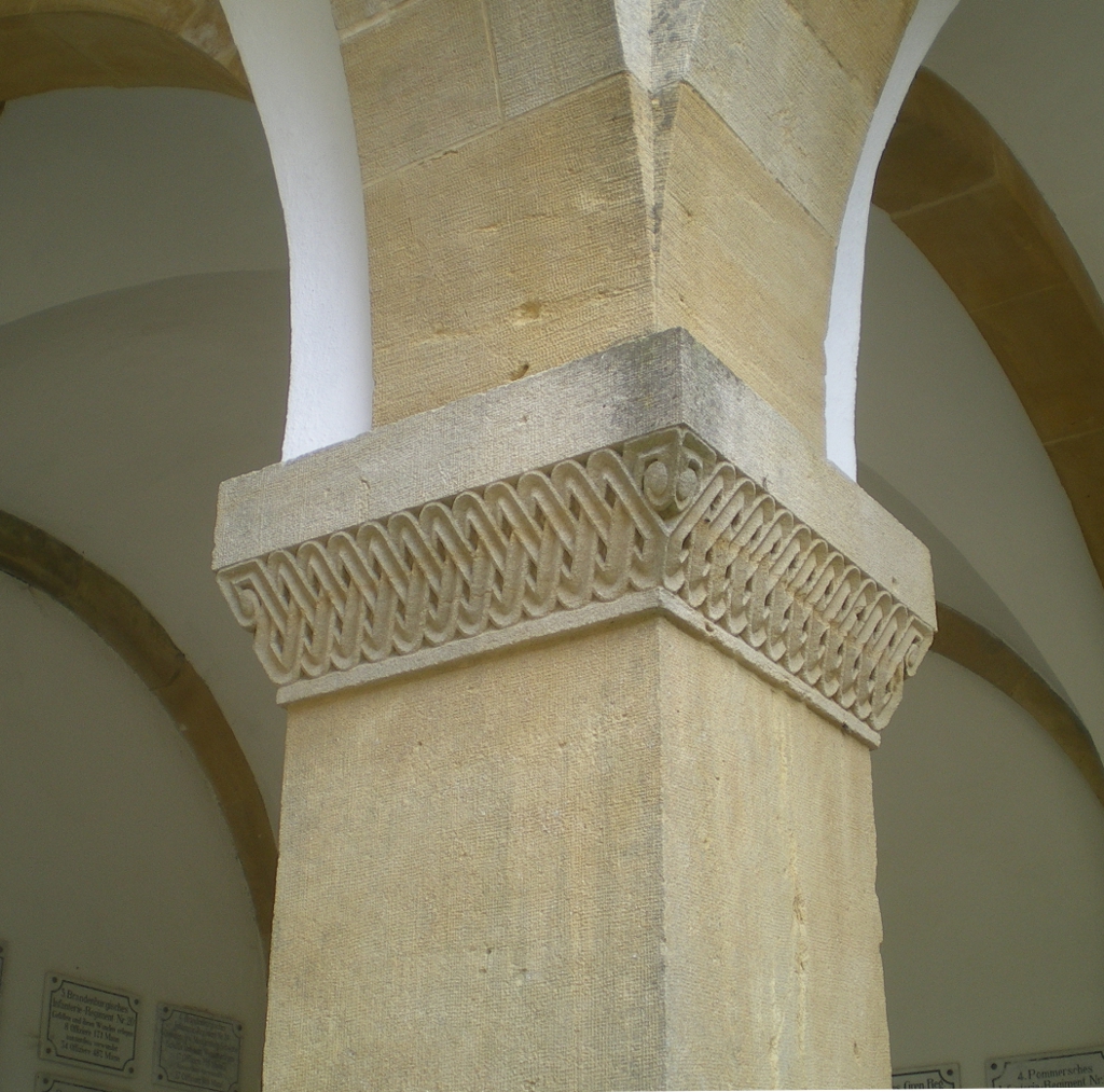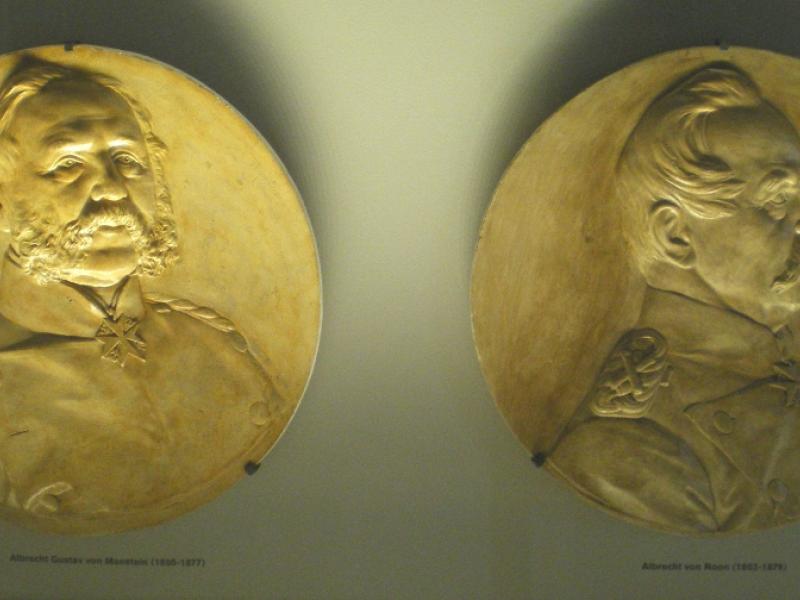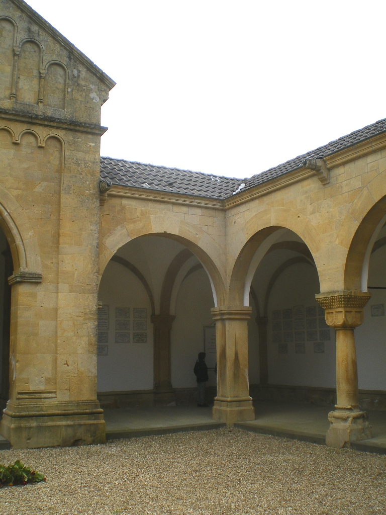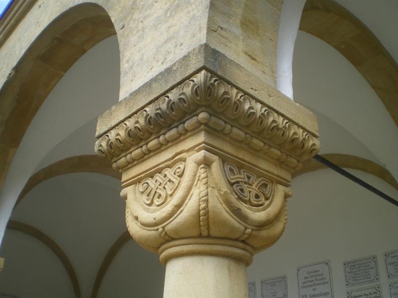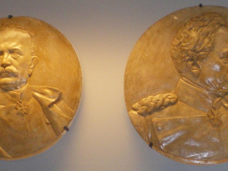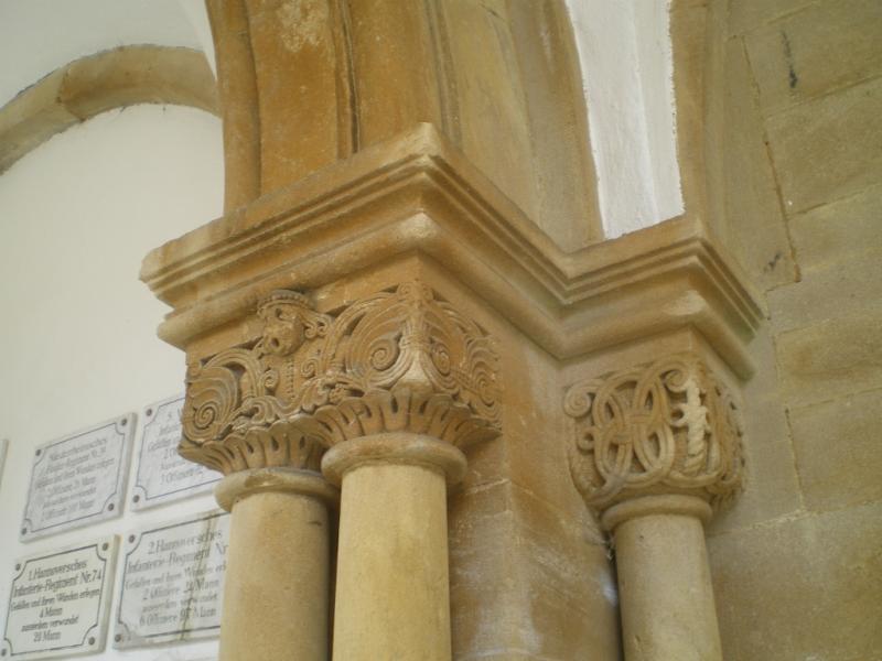 Cauer avait aussi réalisé le buste de l'Empereur Guillaume Ier qui se trouvait dans la cour ; le socle donnait au souverain le titre de Guillaume le Grand. Sous les arcades du cloître, de grands médaillons de bronze représentaient en bas-relief les chefs militaires : le Feldmarschall Steinmetz et le Prince Frédéric-Charles, qui commandaient respectivement la Ière et la IIe Armée, Bismarck, Moltke, Roon et d’autres. Ces portraits, œuvre du sculpteur messin Knittel, provenaient de la tour du Point-du-Jour ; ils ont disparu mais le Musée de Gravelotte expose les modèles de plâtre qui ont servi à les réaliser. De grandes plaques de marbre noir portaient en lettres dorées le nom des corps d’armée et le nombre de leurs officiers et soldats tombés à Gravelotte ; des plaques plus petites, en marbre blanc, donnaient le détail des régiments. Les noms de tous les soldats, avec leur grade et le nom de leur corps d’armée, figuraient sur des feuillets de parchemin inclus dans la dernière pierre du monument, qui fut posée le 25 avril 1905 derrière l’ange4.