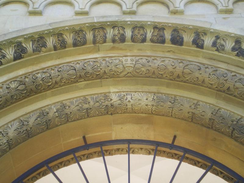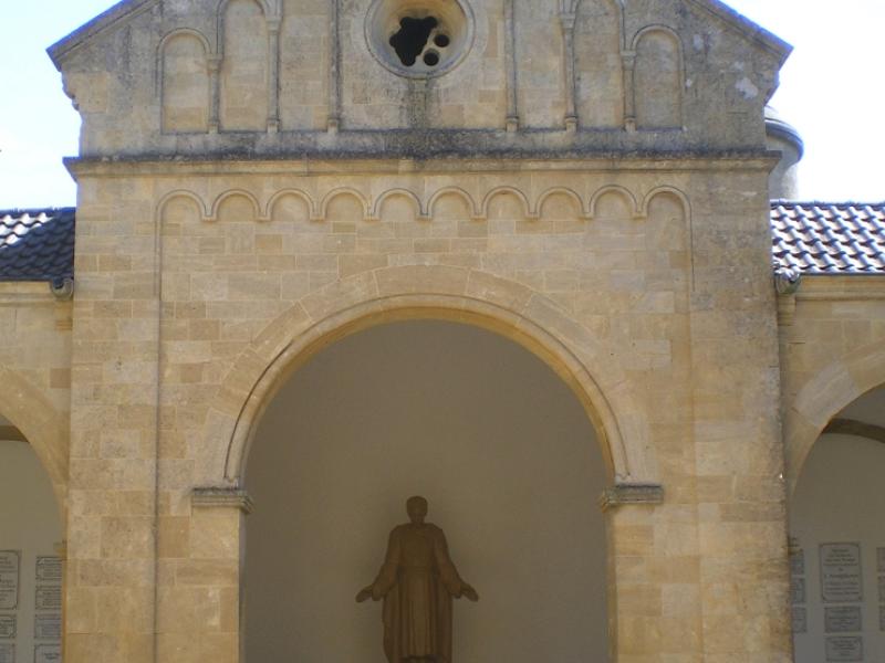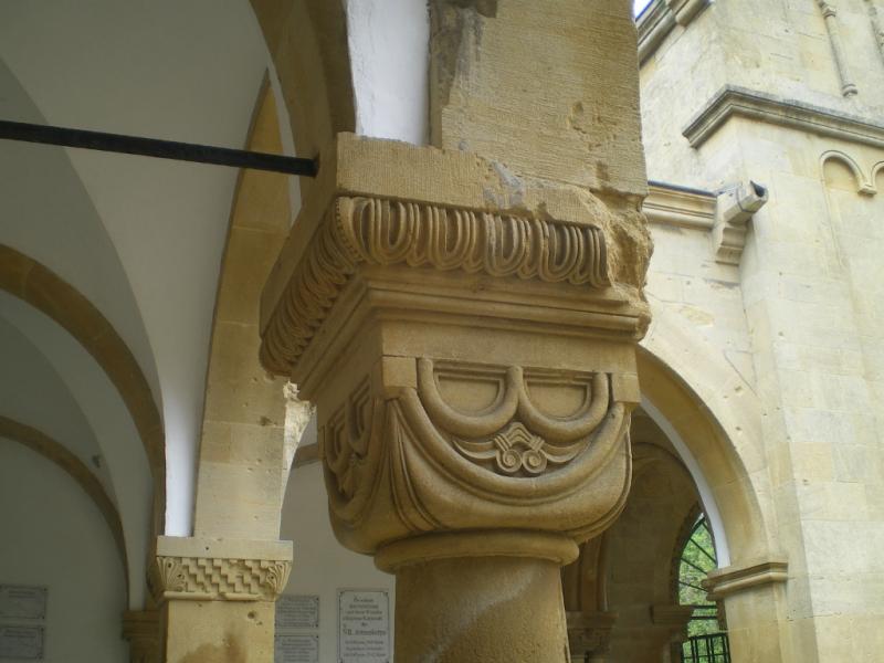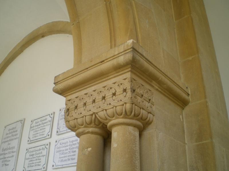 Construit avec le calcaire local, dont la couleur dorée rappelle la pierre de Jaumont, cet édifice de style néo-roman reprend la forme d’un cloître ; il est l'œuvre de l'architecte Albrecht, avec la participation de Blumhardt et de Tornow, et fut inauguré par Guillaume II le 11 mai 1905. L'ensemble est sobre, avec pour seuls ornements le portail richement orné et les chapiteaux des colonnettes. L'Empereur avait offert une grande statue d'ange en bronze doré à la feuille, exécutée par Ludwig Cauer, sculpteur renommé de Berlin ; elle occupait l’abside en face de l’entrée. G. Fischer, dans le guide du mausolée qu’il fait paraître à Metz en 1905, en donne une description détaillée3. « L’ange, écrit-il, à l’allure énergique, produit un effet particulièrement émouvant ici, au milieu d’un grand cimetière. Il semble attendre un signe pour appeler, de sa trompette, les morts à la résurrection. Visible depuis l’entrée du cimetière, l’ange à la trompette, dominant l’ensemble, se dresse sur un socle de granit de Belgique semblable au marbre. De la tête aux pieds, il mesure trois mètres. La coulée de bronze a été réalisée par la firme Martin et Piltzing à Berlin, et la statue a reçu une double feuille d’or. Les yeux, sertis, sont en agate blanche et en grenat. La bordure du vêtement est ornée d’agates vertes. »