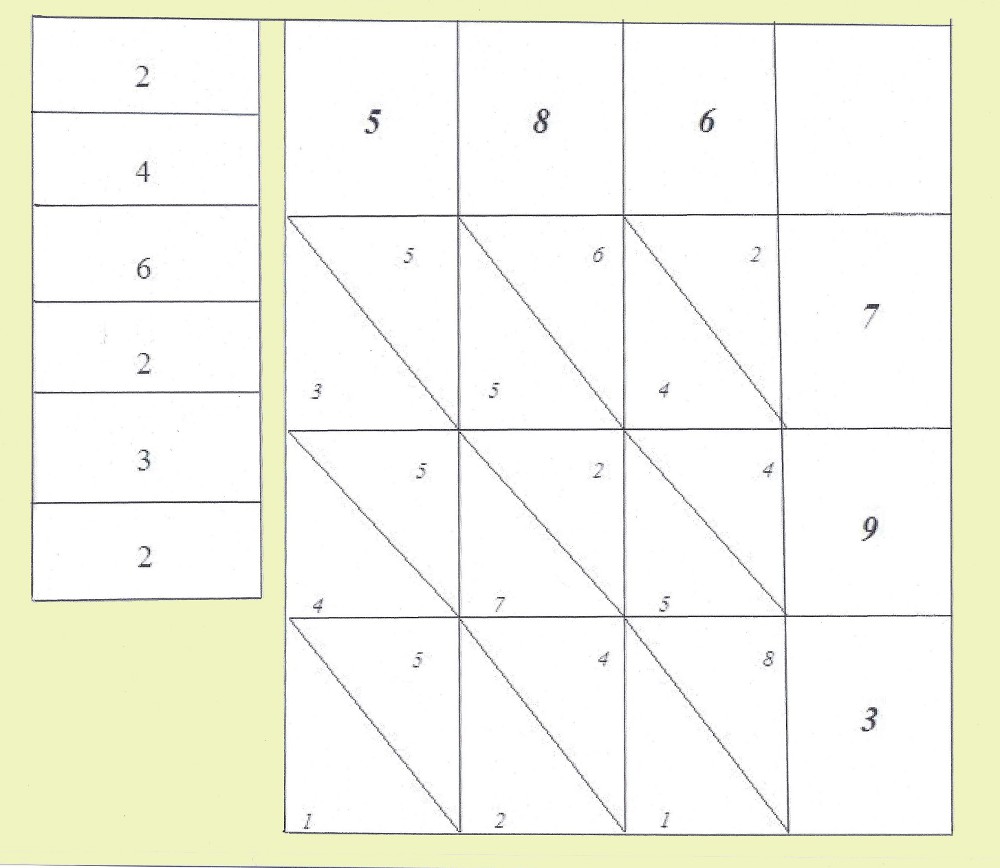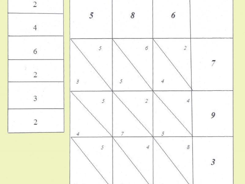Soit à multiplier 586 par 397. On place le multiplicande 586 dans cet ordre, dans la ligne du haut du tableau. Puis 397 dans la colonne de droite, dans l’ordre 7, 9, 3 en commençant par le haut. Puis on effectue 7x6 = 42 et on place le résultat dans la première case de la 2ème colonne de droite dans l’ordre 2, 4. On poursuit 7x8 en disposant le résultat dans la 2ème case de la 3ème colonne de droite, etc. Il suffit ensuite de sommer les résultats dans les colonnes obliques en commençant par la colonne oblique la plus à droite en effectuant les reports si nécessaire1, et d’inscrire les résultats (les unités seulement) dans la dernière colonne de gauche. Le résultat de la multiplication se lit de bas en haut dans celle-ci : 586x397 = 232642.