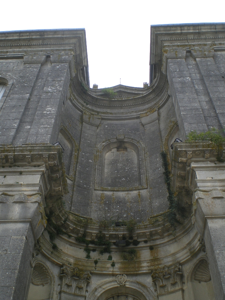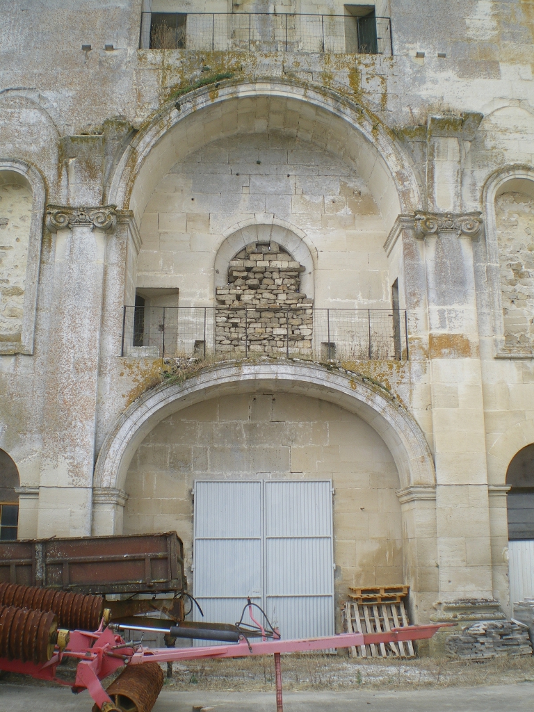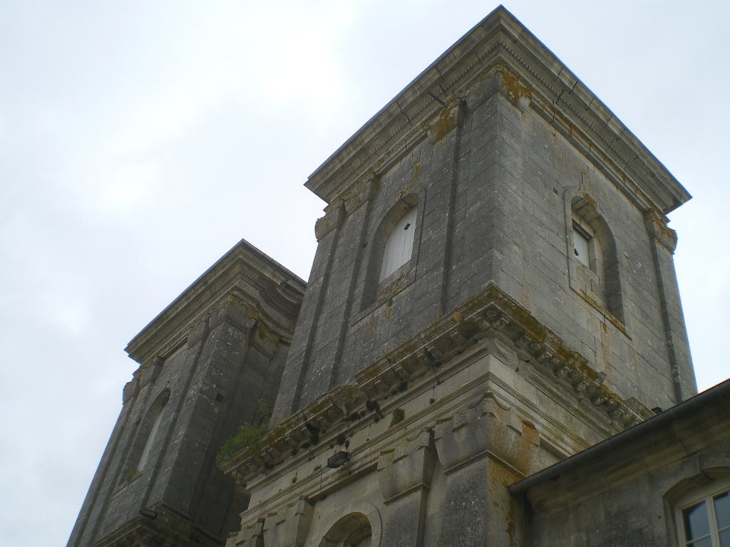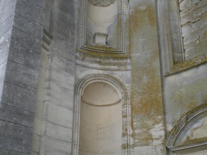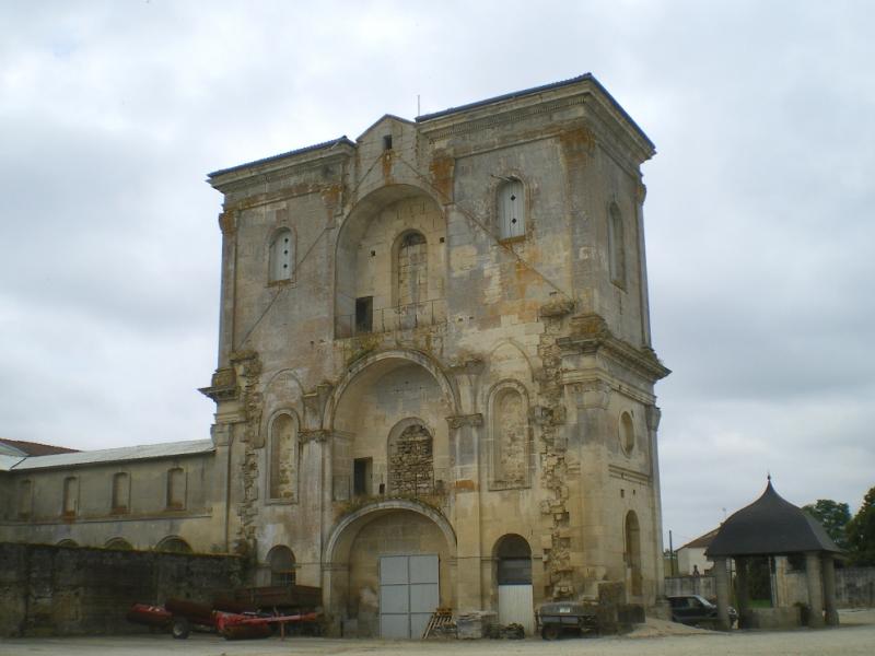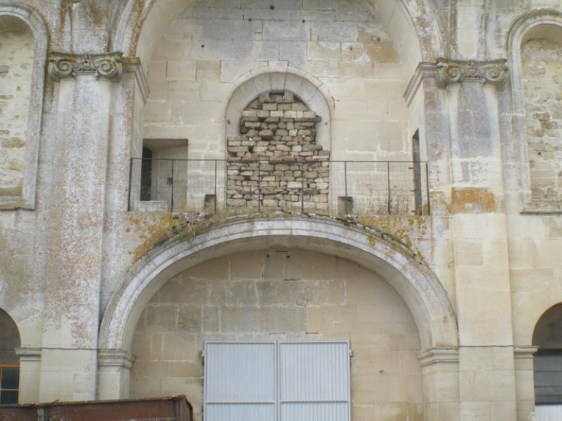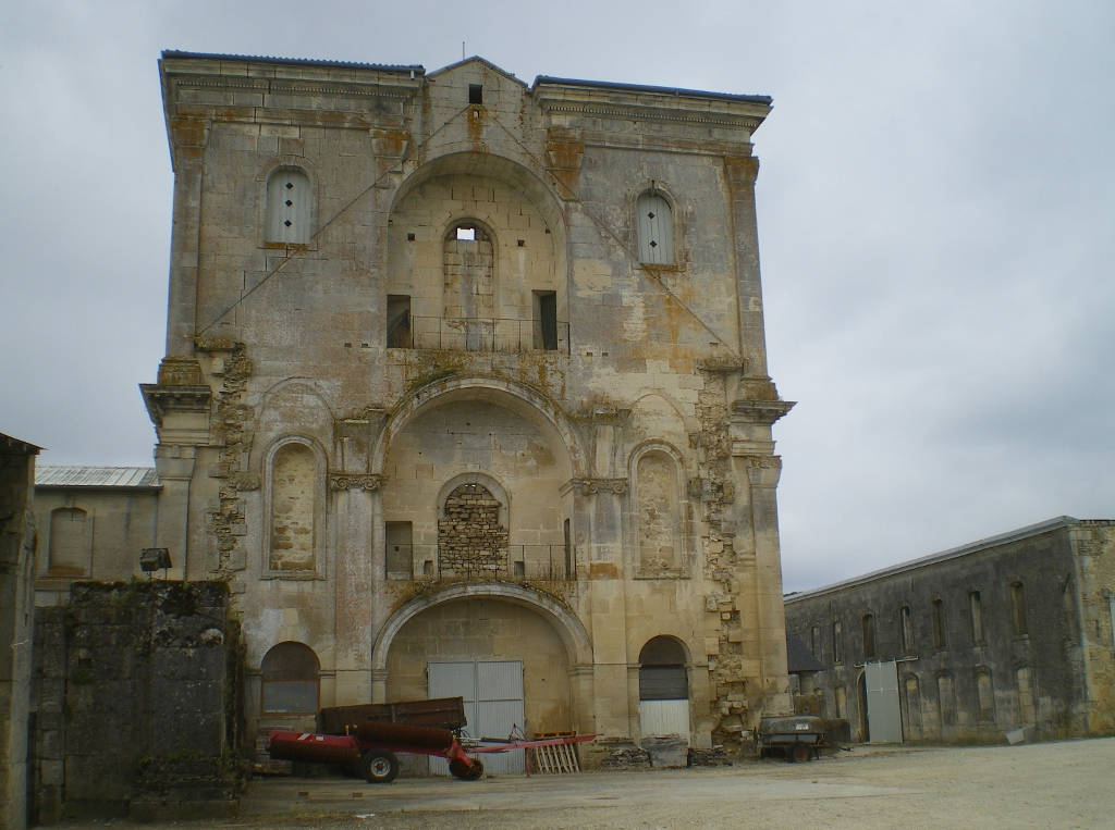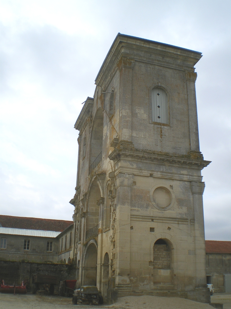La Révolution démantela la propriété, qui fut vendue par lots à des exploitants agricoles. Les bâtiments furent pillés et en partie démolis au cours du XIXe s. L'église servit de carrière, si bien qu'il n'en reste aujourd'hui que l'imposante façade. Sa composition surprenante comprend deux tours reliées par une partie centrale concave ; l'ensemble fait deux niveaux que sépare un entablement mouluré. L'aspect quelque peu massif est heureusement tempéré par des niches et des pilastres corinthiens2. Autant qu’on puisse en juger, puisque tout a disparu, l’église comprenait une nef et deux bas-côtés. Les supports étaient ornés de chapiteaux ioniques.