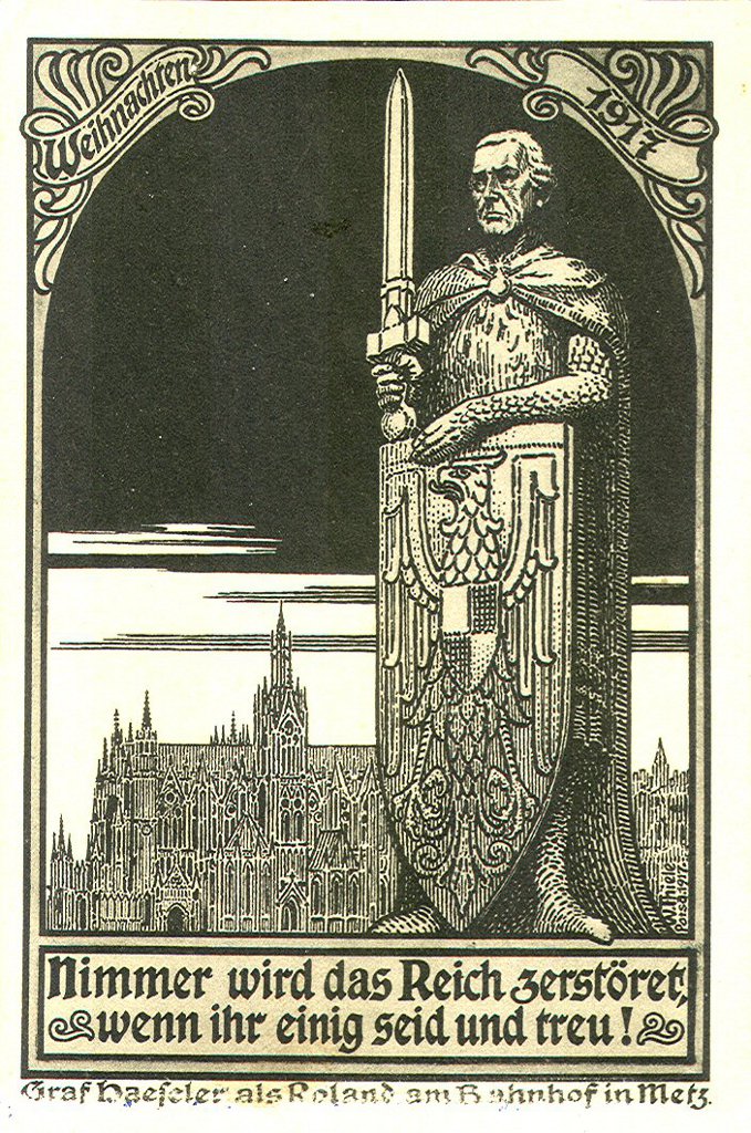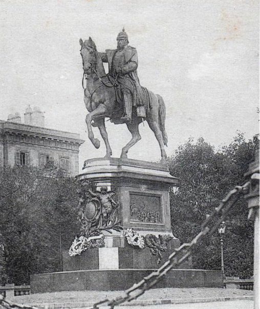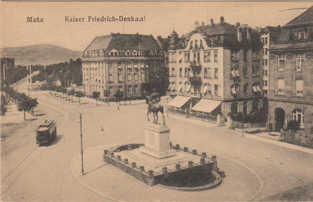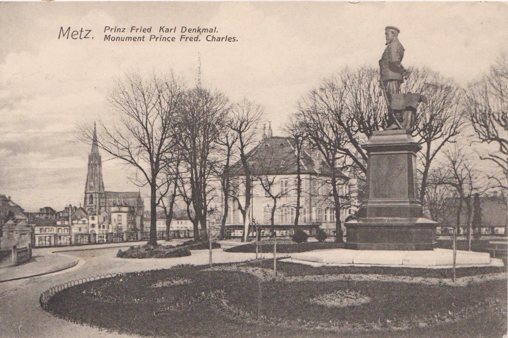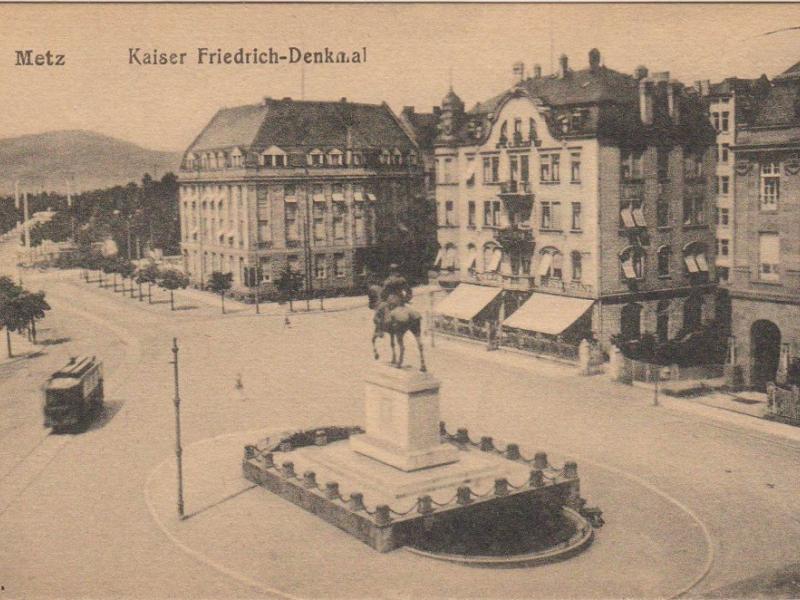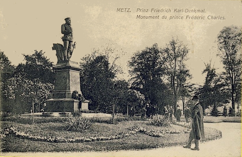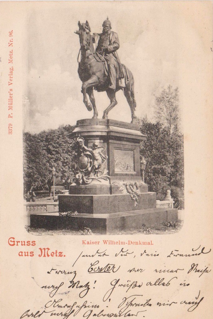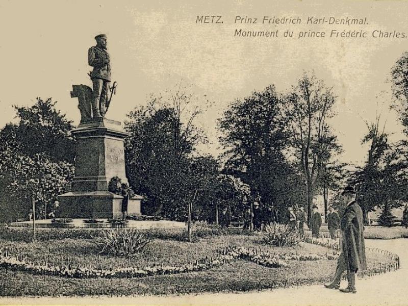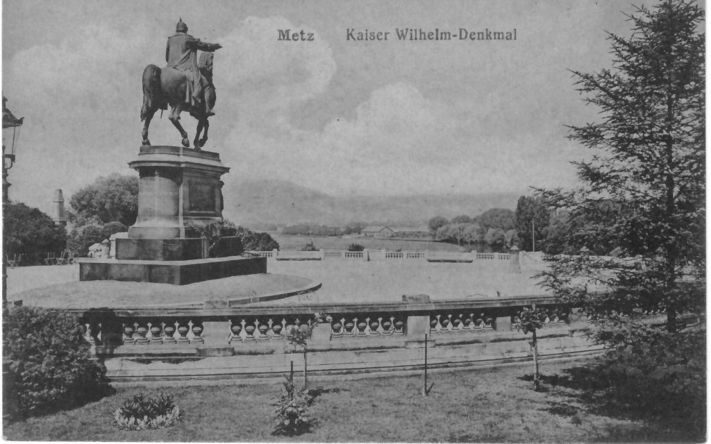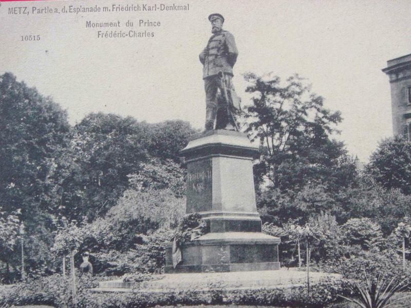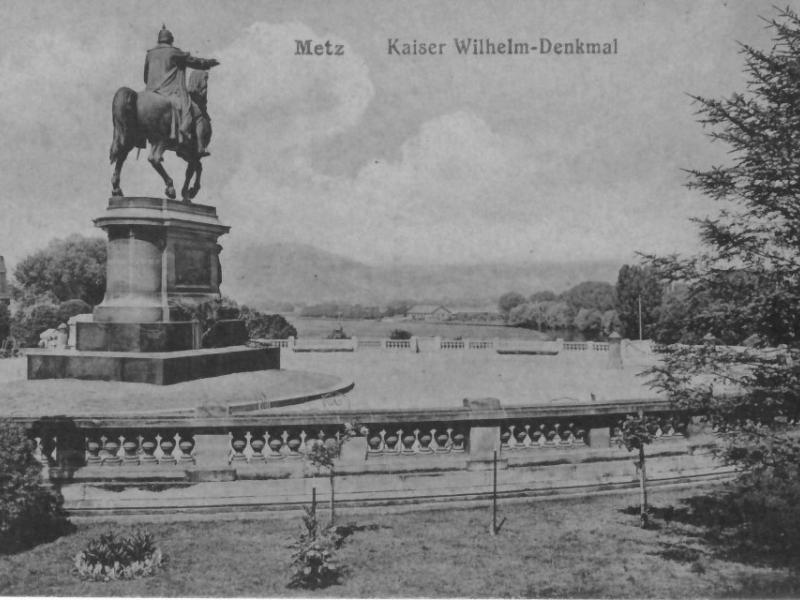 L'aménagement urbain comprenait aussi les statues monumentales des représentants du nouveau pouvoir, notamment les statues équestres de Frédéric III, place Raymond Mondon, et de Guillaume Ier, à l’extrémité de l’Esplanade. Cette dernière faisait face au Mont Saint-Quentin et à ses forts, qu’elle semblait défier7. À côté, dans le Jardin Boufflers qui s'étend à l'arrière du Palais de Justice, on avait dressé la statue en pied du Prince Frédéric-Charles : celui qui avait conduit le siège de la ville, en 1870, portait lui aussi ses regards sur le mont. L'Empereur Guillaume II, quant à lui, avait son effigie sur le nouveau portail de la cathédrale car il prêtait ses traits - et ses célèbres moustaches ! - au prophète Daniel. La statue monumentale du comte von Haeseler, sur la tour de la gare, servit même à illustrer des images de propagande8.