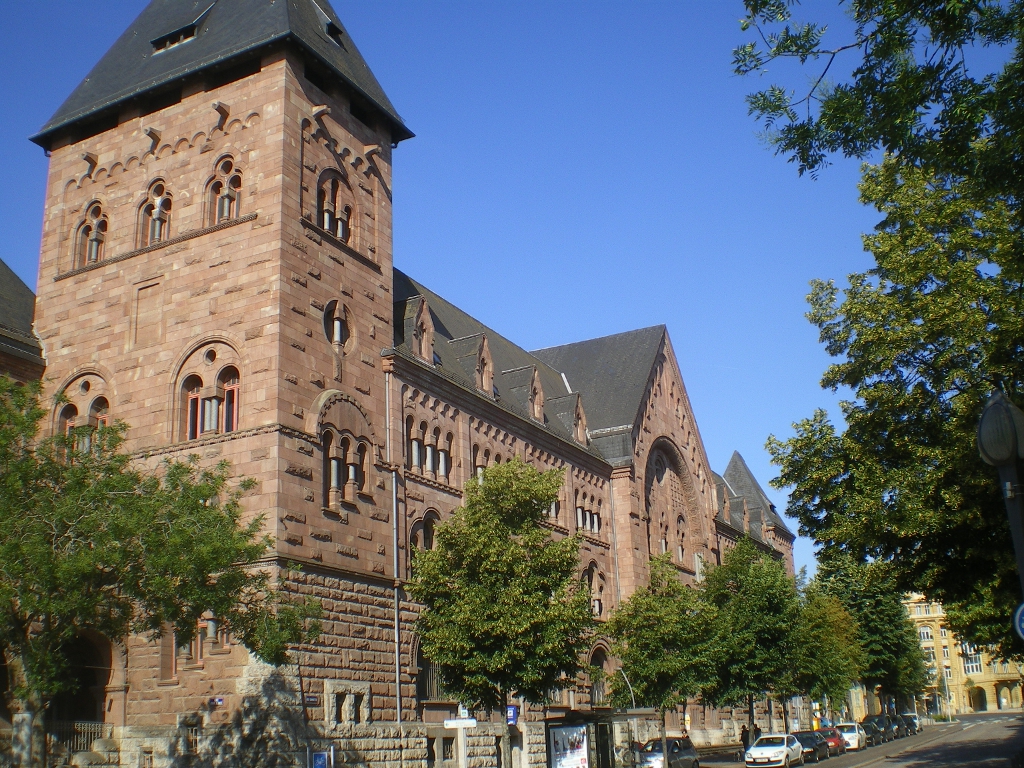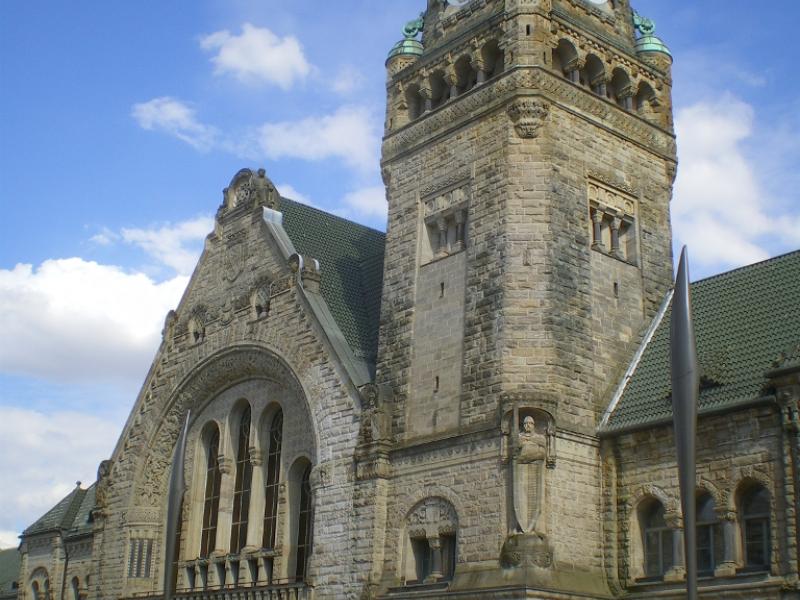 La nouvelle gare de Metz, mise en chantier à partir de 1905 et inaugurée en 1908, remplace la gare construite sous Guillaume Ier. Nous ne reviendrons pas sur le rôle qu’elle tenait dans la stratégie du Reich car cette fonction, occultée en quelque sorte par l’extraordinaire bâtiment dévolu aux voyageurs1, n’apparaissait guère aux citadins. Il est composé d’un hall de départ et d’un hall d’arrivée réunis par un couloir qui sert de salle des pas-perdus ; cette unité est prolongée de part et d’autre par des locaux administratifs.