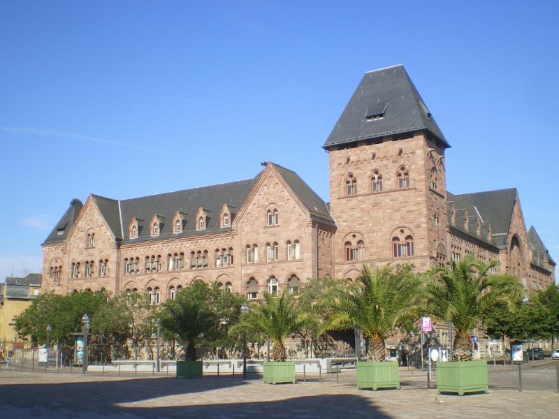 Construit en grès rose des Vosges dans le style néo-roman rhénan, l'Hôtel des Postes, quoique moins ostentatoire que la gare, en est comme le reflet. L'édifice est de proportions harmonieuses et l'architecte a joué du traitement, poli ou à bossages, qu'il a donné à la pierre. La teinte du grès est agréablement relevée par des colonnettes d'un granit clair. Quant au décor, il rappelle celui de la gare par les arcs en plein-cintre des fenêtres et les arcatures lombardes des façades, et plus encore par le grand arc de l'entrée principale orné d'élégants rinceaux romans.