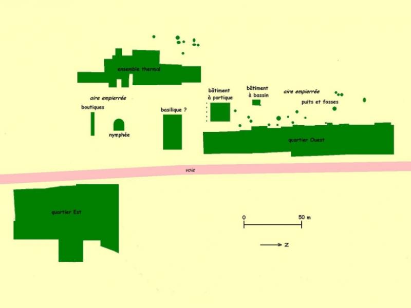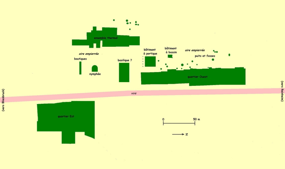 Le site gallo-romain débute vers 30/40 ap. J.-C., et se développe jusqu'à atteindre sa plus grande extension dans la première moitié du IIIe s. C'est ce dernier état que découvre le visiteur. Sur la rive de la Blies, un affluent de la Sarre, le vicus2 avait l'aspect d'un gros village, traversé par une route rectiligne. Cette voie constituait le véritable cœur de l'agglomération, qui s'étendit tout naturellement de part et d'autre. La proximité d'un domaine agricole, dont subsiste une imposante villa, ajoutait à la prospérité du lieu3. Il n'est pas si fréquent qu'on puisse observer, à un même endroit et pour une même période, l'évolution d'un vicus et d'une villa, les deux éléments principaux de la campagne gallo-romaine.