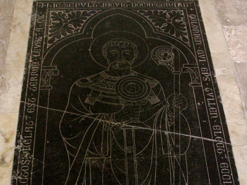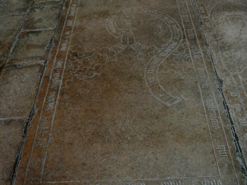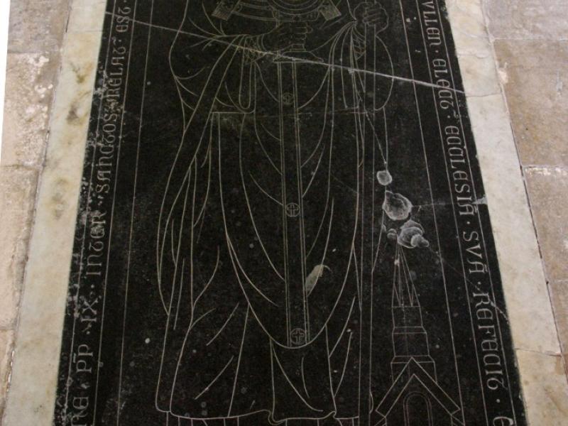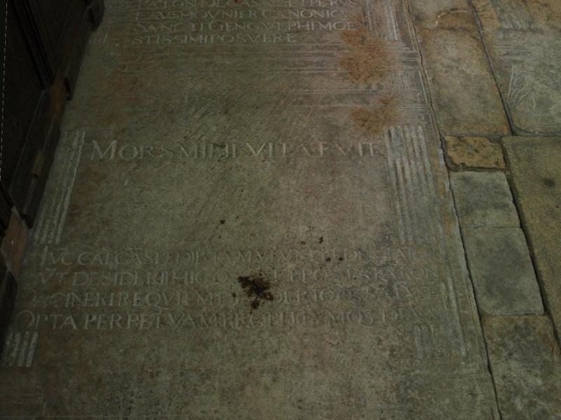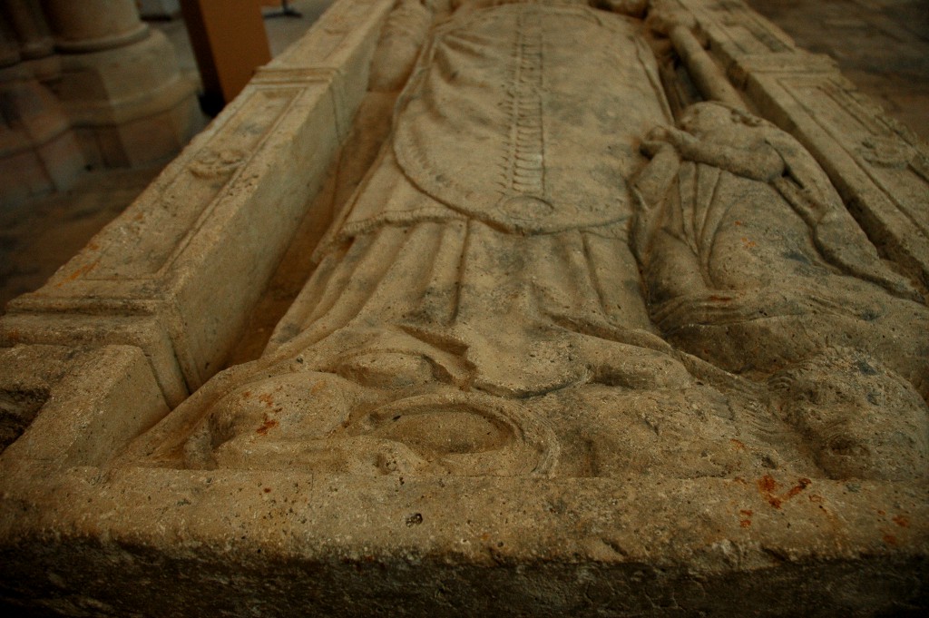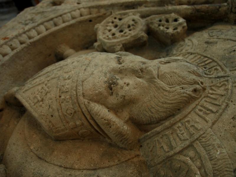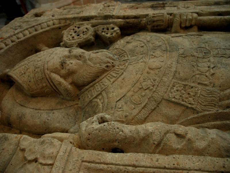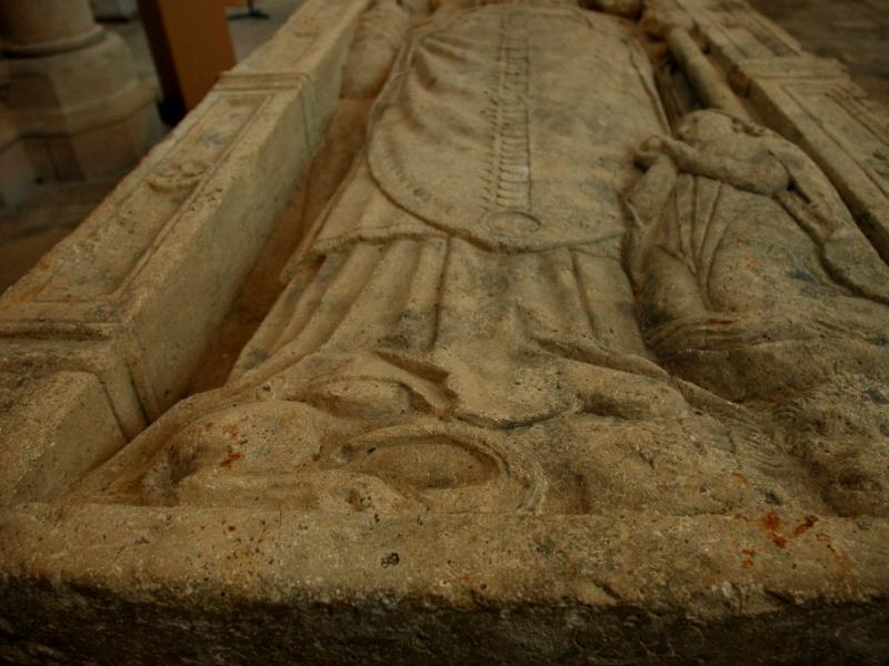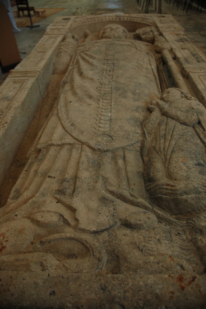 • 3. Les dalles funéraires constituent une grande partie du sol du transept et du cloître, où l’on en voit aussi encastrées dans les murs. Seules quelques-unes sont des épitaphes d’évêques ; la plupart sont celles de personnes dont la position justifiait qu’ils soient enterrés à cet emplacement prestigieux mais qui ont aujourd’hui disparu des mémoires.