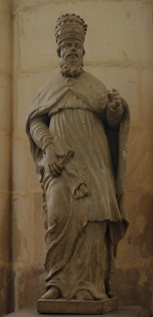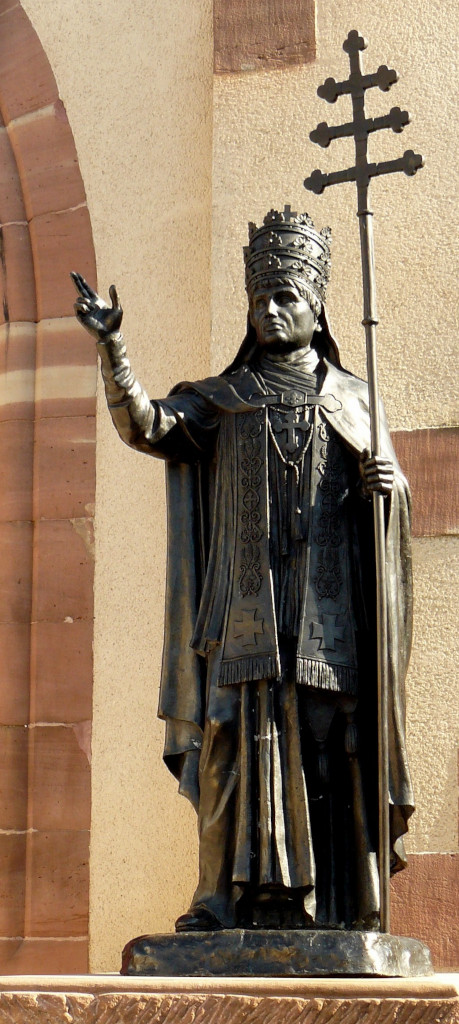 Saint Léon IX, né Bruno d'Eguisheim-Dagsbourg en 1002, fut évêque de Toul avant de coiffer la tiare en 1049. Sa famille appartient à la très haute noblesse10. Son éducation, confiée à l’évêque de Toul Berthold, se déroule si brillamment qu’il entre très jeune encore au chapitre de la cathédrale. Il est alors séduit par la réforme de Gorze11, que soutient aussi son cousin l’empereur Conrad II. À la mort de l'évêque Hermann en 1026, Bruno, appuyé l’empereur, est proposé par le clergé pour lui succéder sur le siège épiscopal de Toul ; il est consacré par l’archevêque de Trèves la même année.