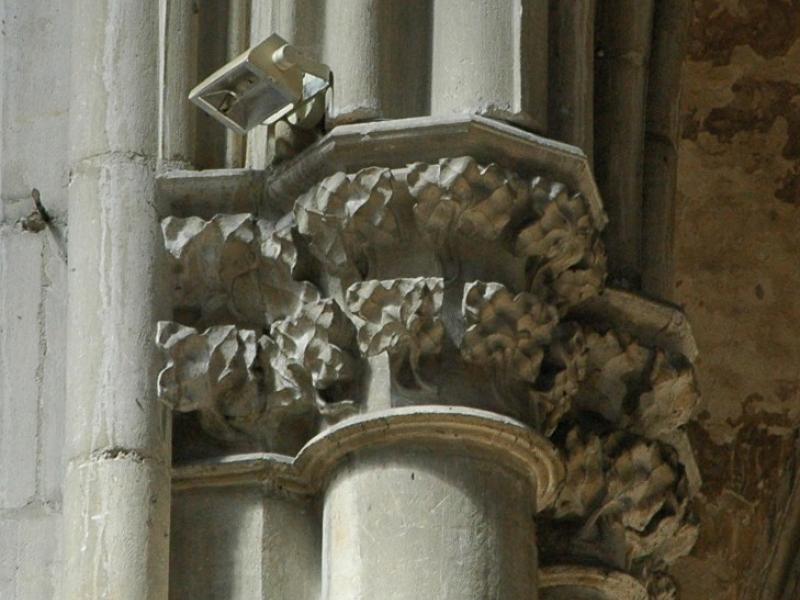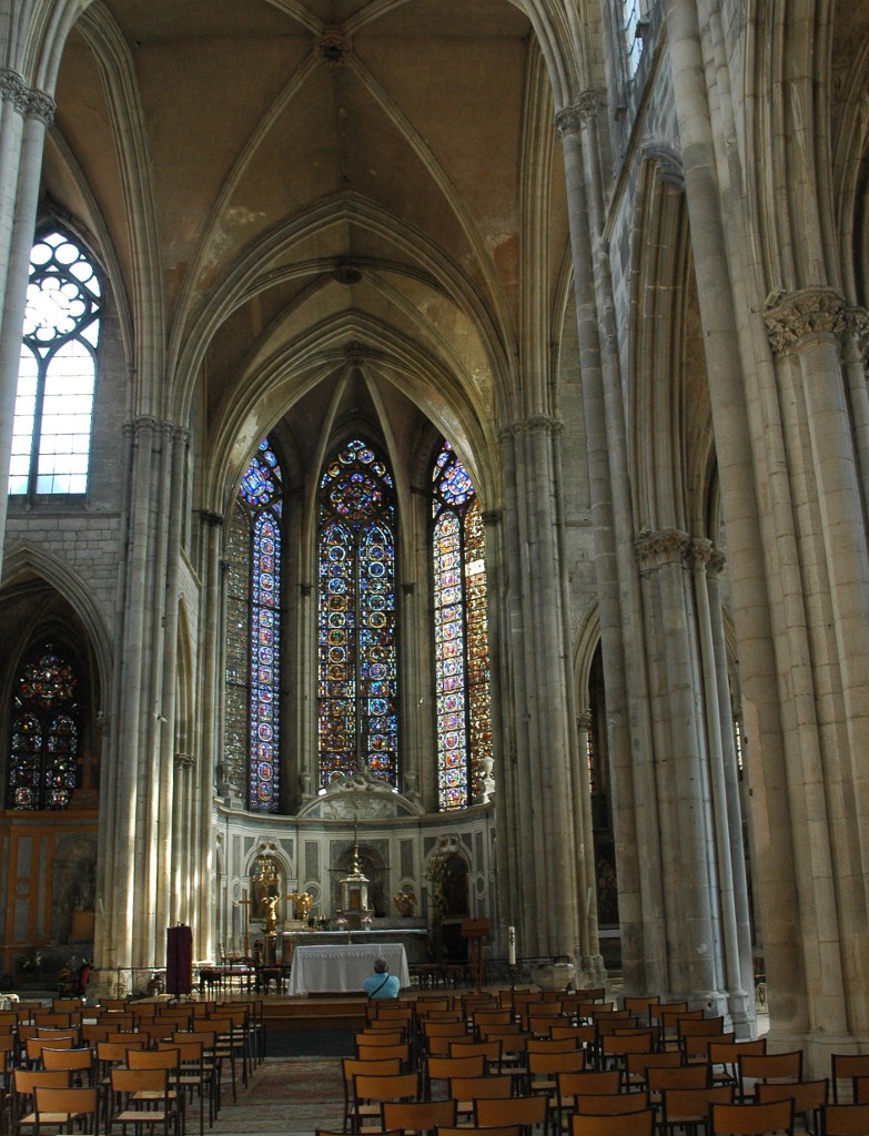 Toutefois, le meilleur élément de comparaison se trouve à Toul-même. L’église collégiale St-Gengoult est reconstruite dans le premier quart du XIIIe s., à la même époque que la cathédrale St-Étienne, dont elle s’inspire1. On peut en effet remarquer certaines similitudes. Comme la cathédrale, l’église St-Gengoult est un édifice lumineux. Elle le doit d’une part à la reprise, en moins complexe, du dispositif des chapelles du transept, adjacentes au chœur, surmontées de fenêtres et non detribunes et, d’autre part, aux grandes verrières du transept, ici aussi moins audacieuses qu’à la cathédrale2.
