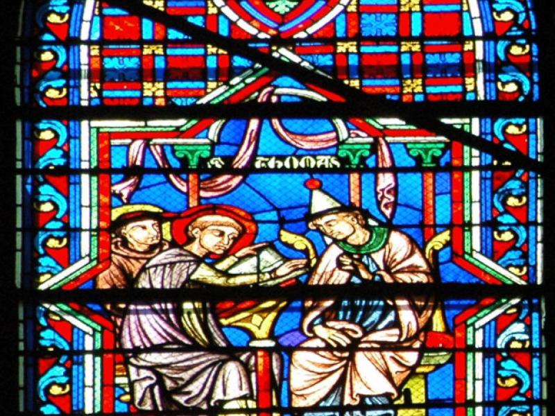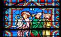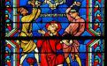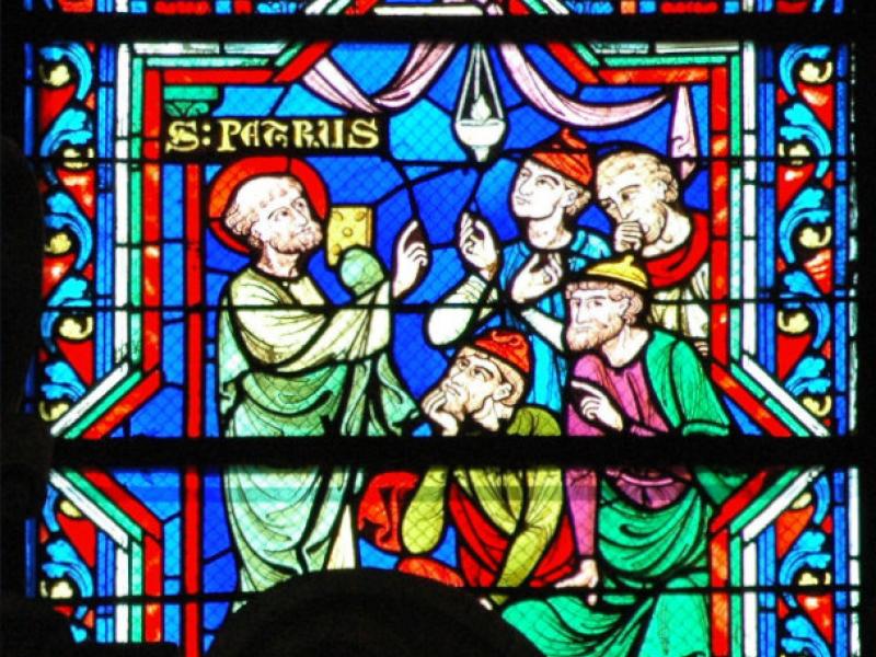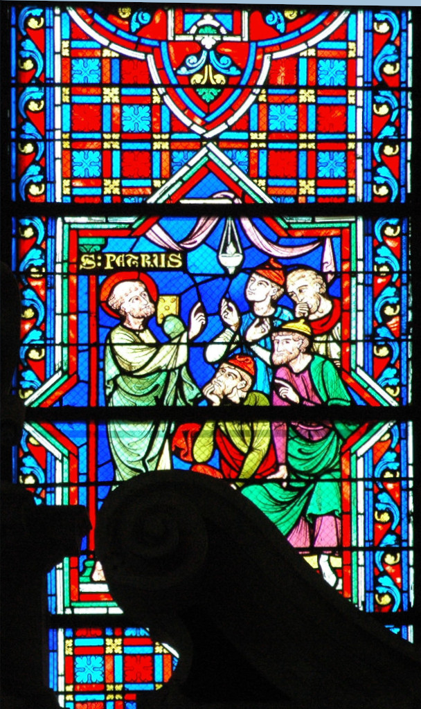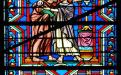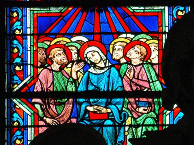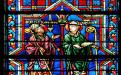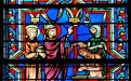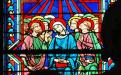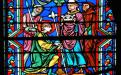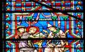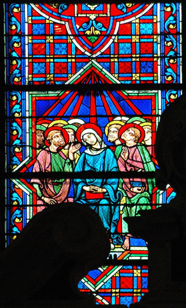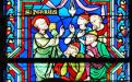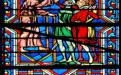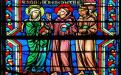 A droite, les panneaux de la fenêtre illustrent des scènes de la vie de l’Église ; la rosace représente la Jérusalem céleste :