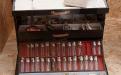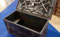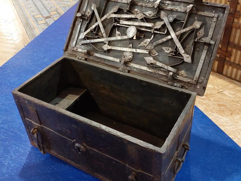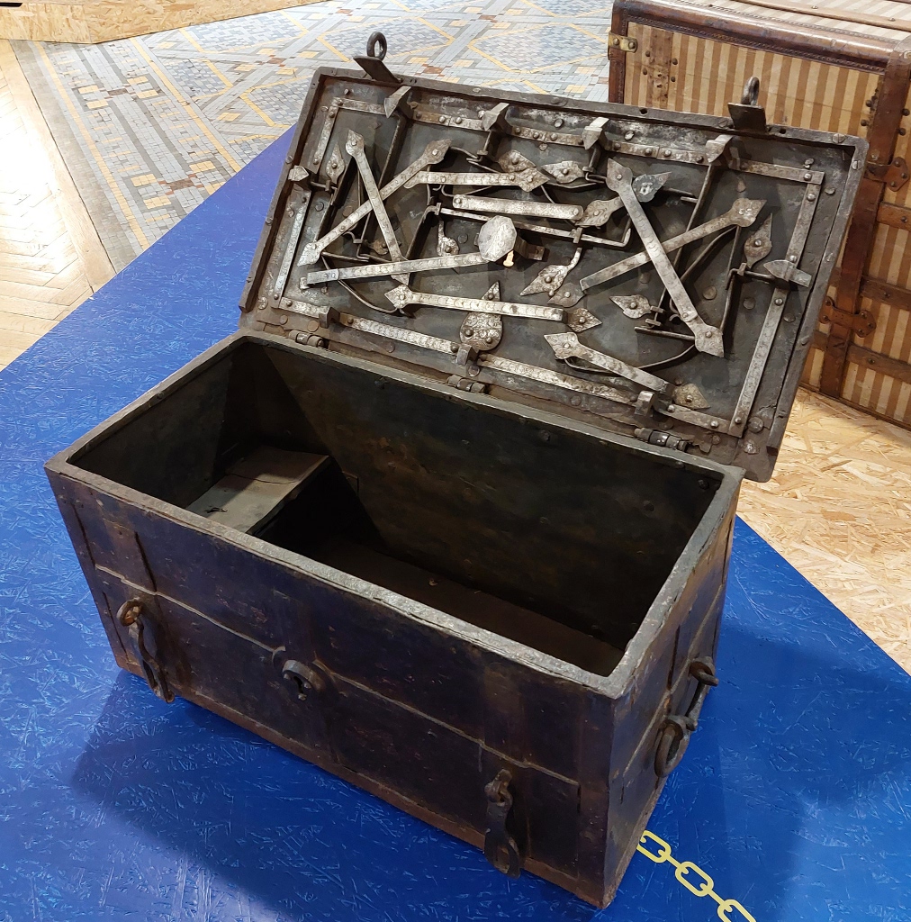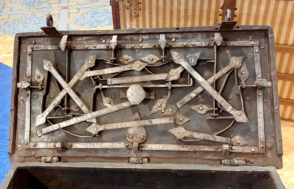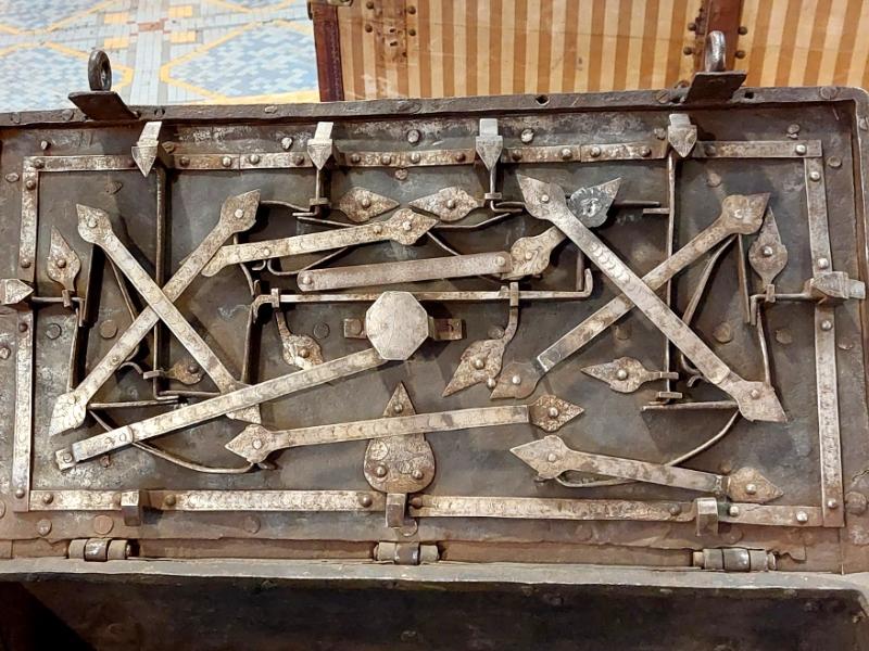 - 1. La serrure du coffre de Nuremberg présenté ici est un leurre. L'ouverture se fait grâce à un mécanisme à neuf pênes disposé sous le couvercle et que l'on actionne d'un seul tour de clef. Ces coffres étaient conçus pour contenir des valeurs.