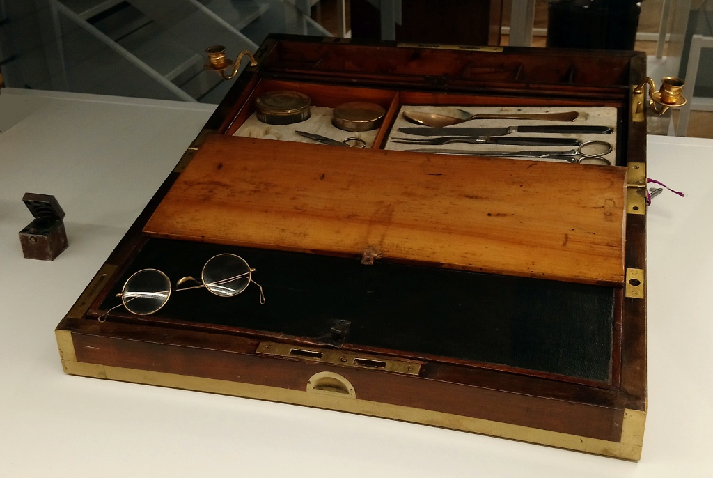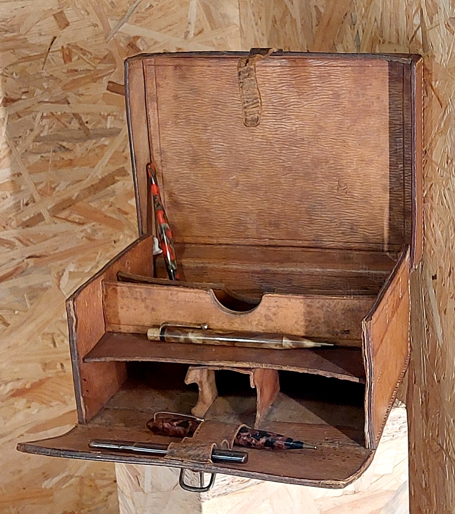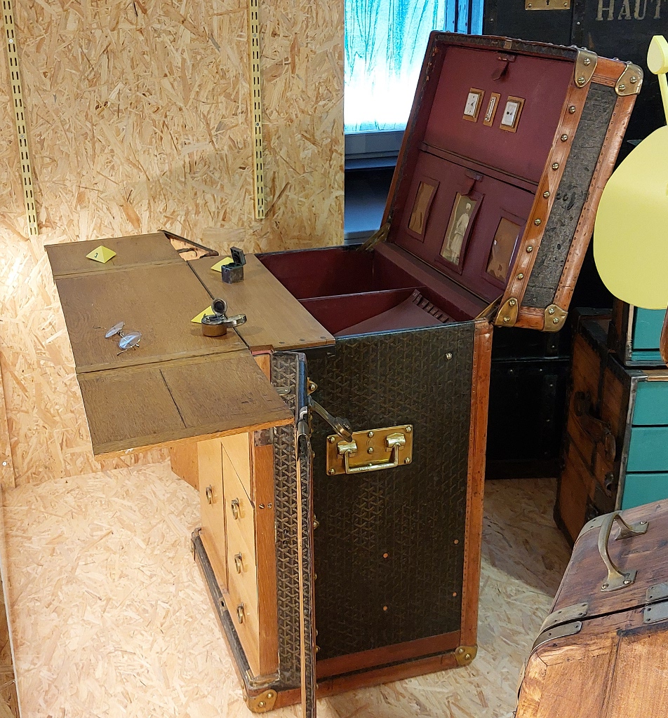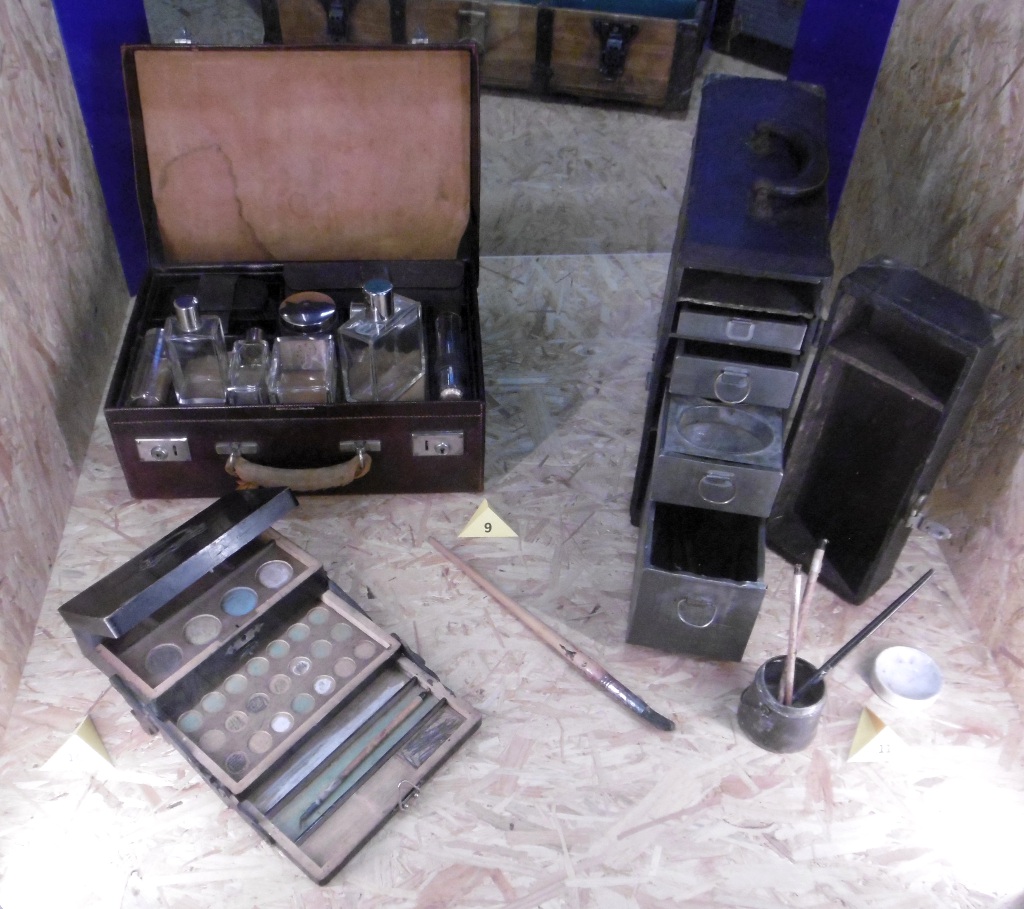 Les voyageurs sont nombreux aux XIXe et XXe siècles, plus encore que précédemment ; ils sont de toutes conditions, et beaucoup ont des bagages en rapport avec leurs occupations. On pense à ces artistes, des peintres surtout, qui entreprenaient le « Grand Tour » en Italie2. Le coffret à peinture qu’ils emportaient dans leurs randonnées contenait ce dont ils avaient besoin pour exercer leur art en plein air3. Ils pouvaient ainsi répondre à la demande des visiteurs fortunés, qui aimaient avoir chez eux une évocation des paysages qu’ils avaient appréciés. Les écrivains ne sont pas en reste : la malle-bureau de Conan Doyle comprend une table pliante, des tiroirs, des classeurs et une machine à écrire. La mode était alors au récit de voyage et aux lettres, qu’on rédigeait pour partager ses impressions. Il convenait donc d’emporter un nécessaire à écrire, dans lequel étaient rangés encrier, plumes, stylos, écritoire… Les malles des explorateurs, une activité en plein essor au XIXe s., étaient adaptées aux rudes conditions de leurs expéditions : bois de camphrier contre les termites, revêtement intérieur métallique contre l’humidité… On s’équipait de ce qui pourrait s’avérer utile, en gardant un certain standing cependant : lampes tempête, cantines, pharmacie, service à thé, etc.