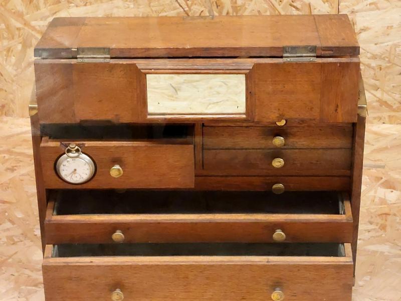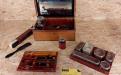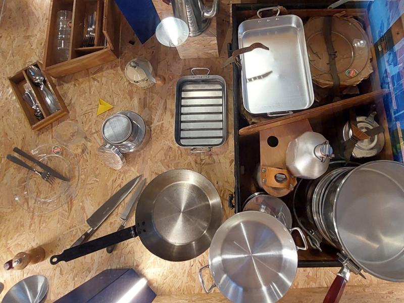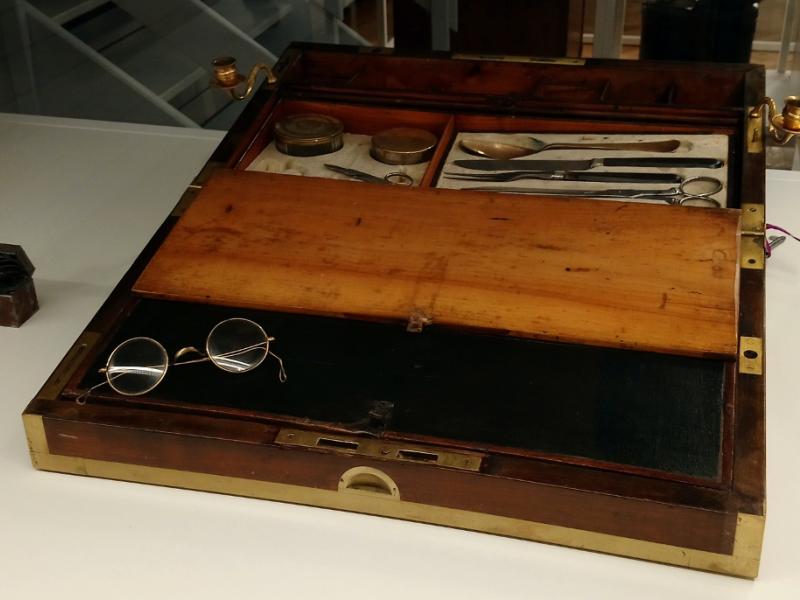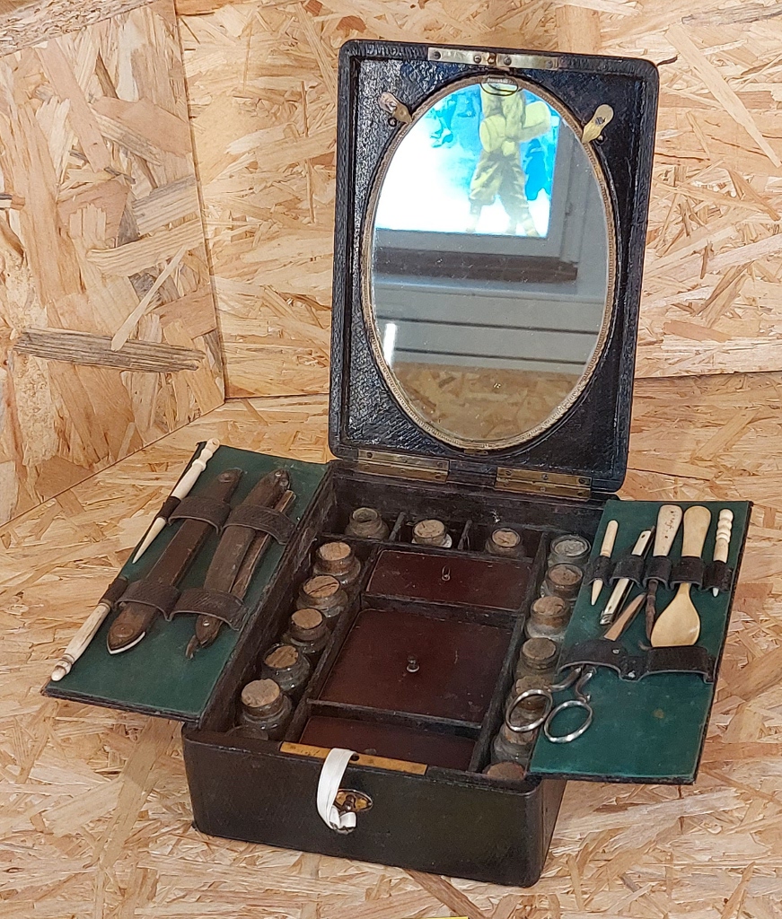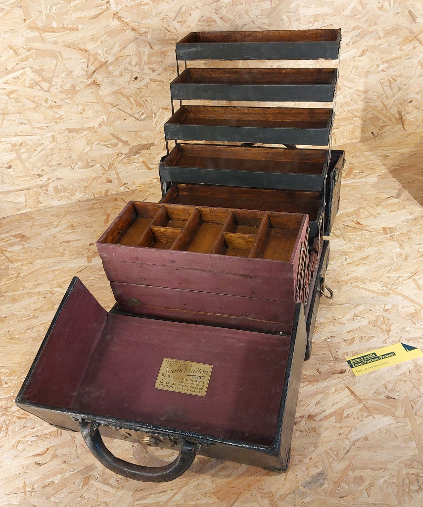 Les voyageurs sont nombreux aux XIXe et XXe siècles, plus encore que précédemment ; ils sont de toutes conditions, et beaucoup ont des bagages en rapport avec leurs occupations. On pense à ces artistes, des peintres surtout, qui entreprenaient le « Grand Tour » en Italie2. Le coffret à peinture qu’ils emportaient dans leurs randonnées contenait ce dont ils avaient besoin pour exercer leur art en plein air3. Ils pouvaient ainsi répondre à la demande des visiteurs fortunés, qui aimaient avoir chez eux une évocation des paysages qu’ils avaient appréciés. Les écrivains ne sont pas en reste : la malle-bureau de Conan Doyle comprend une table pliante, des tiroirs, des classeurs et une machine à écrire. La mode était alors au récit de voyage et aux lettres, qu’on rédigeait pour partager ses impressions. Il convenait donc d’emporter un nécessaire à écrire, dans lequel étaient rangés encrier, plumes, stylos, écritoire… Les malles des explorateurs, une activité en plein essor au XIXe s., étaient adaptées aux rudes conditions de leurs expéditions : bois de camphrier contre les termites, revêtement intérieur métallique contre l’humidité… On s’équipait de ce qui pourrait s’avérer utile, en gardant un certain standing cependant : lampes tempête, cantines, pharmacie, service à thé, etc.
