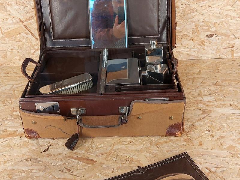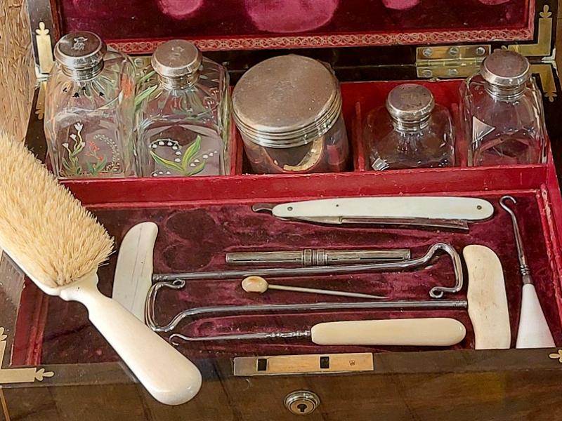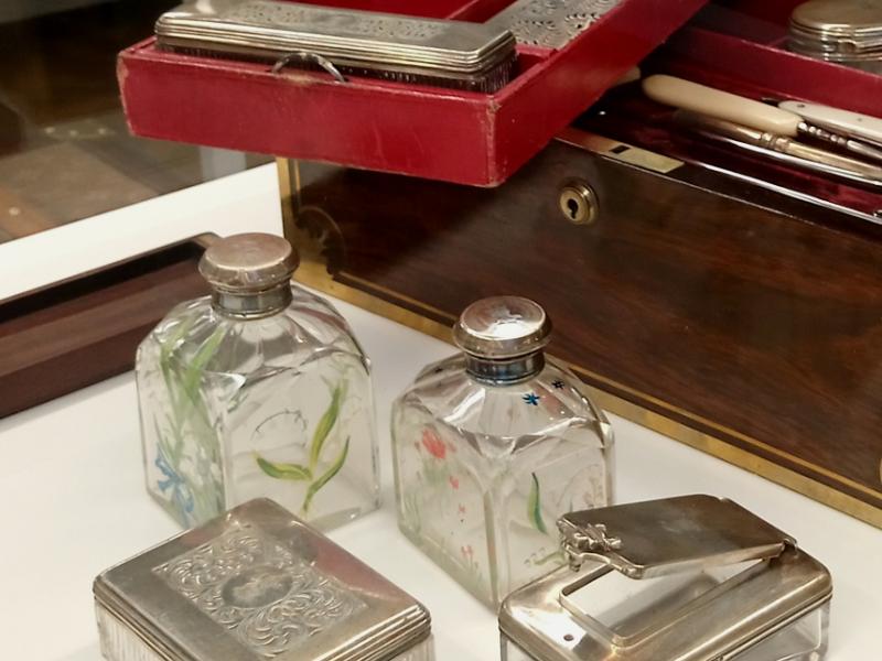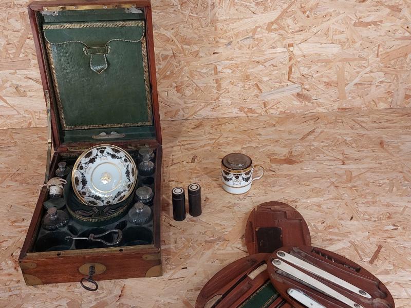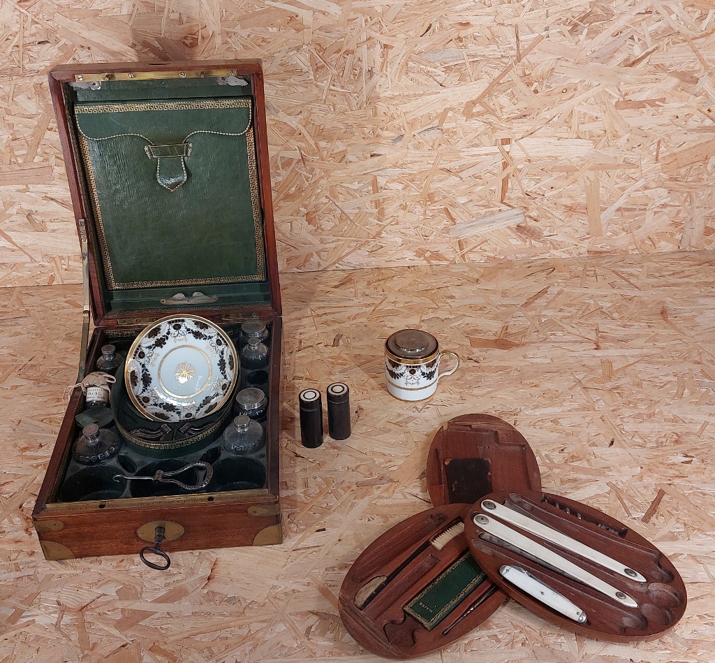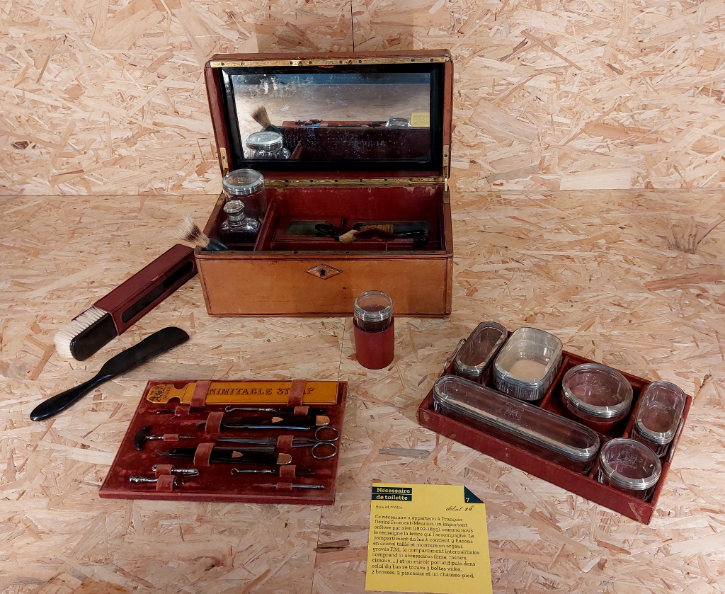 Autre élément incontournable, le « nécessaire de voyage » contient accessoires de toilette, outils de travail ou ustensiles destinés à la collation. Son usage se développe à la fin du XVIIIe s. Aucun personnage important ne saurait s’en passer. Le musée présente la valise de toilette d’Alphonse Daudet mais certaines sont mieux équipées encore et bien plus luxueuses : flacons de cristal à bouchon en argent, limes, rasoirs, ciseaux, peignes, brosses, chausse-pied et nécessaire à chaussures, et même de la vaisselle de qualité…
