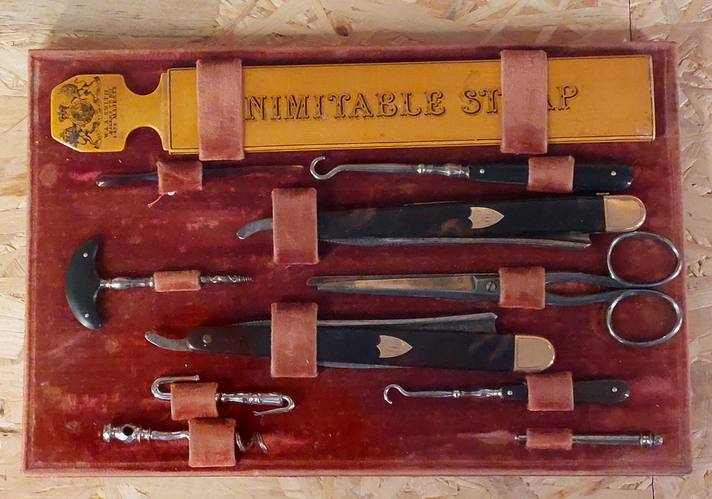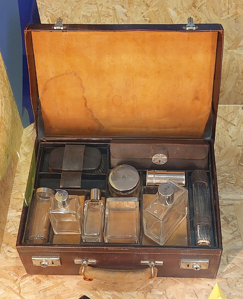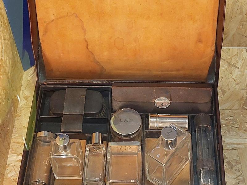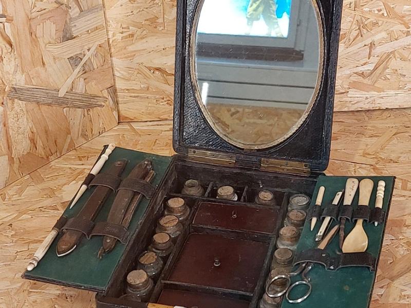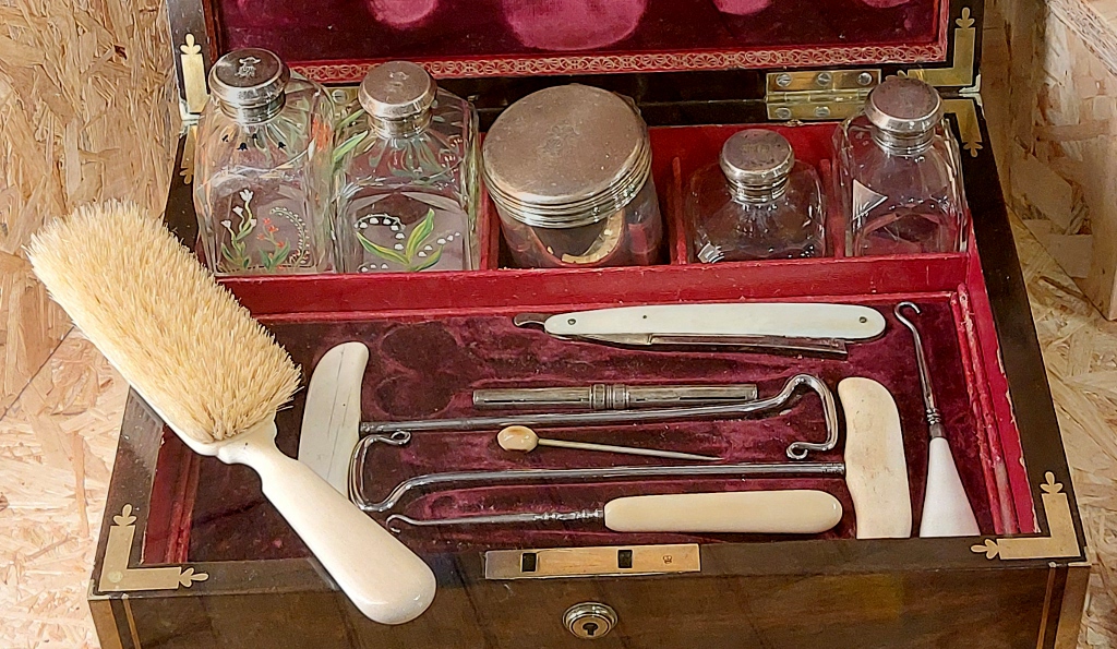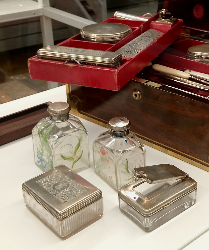 Autre élément incontournable, le « nécessaire de voyage » contient accessoires de toilette, outils de travail ou ustensiles destinés à la collation. Son usage se développe à la fin du XVIIIe s. Aucun personnage important ne saurait s’en passer. Le musée présente la valise de toilette d’Alphonse Daudet mais certaines sont mieux équipées encore et bien plus luxueuses : flacons de cristal à bouchon en argent, limes, rasoirs, ciseaux, peignes, brosses, chausse-pied et nécessaire à chaussures, et même de la vaisselle de qualité…