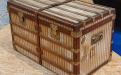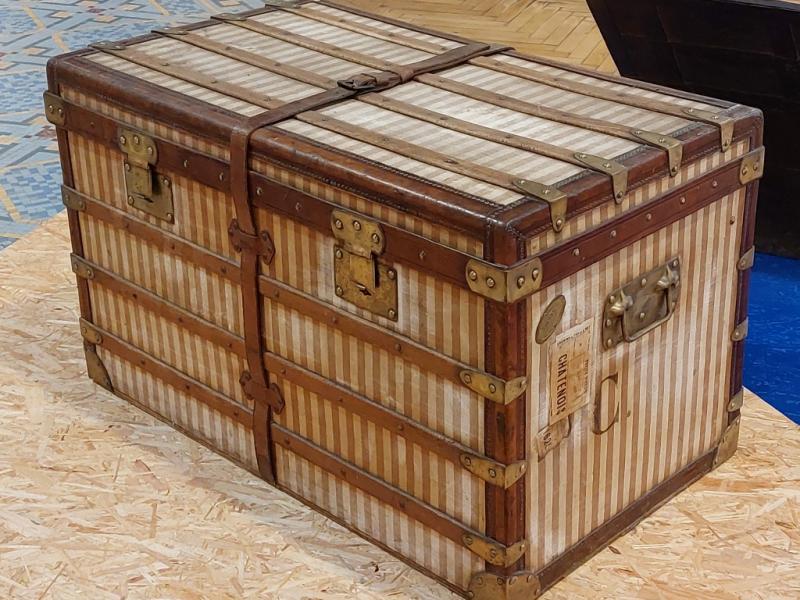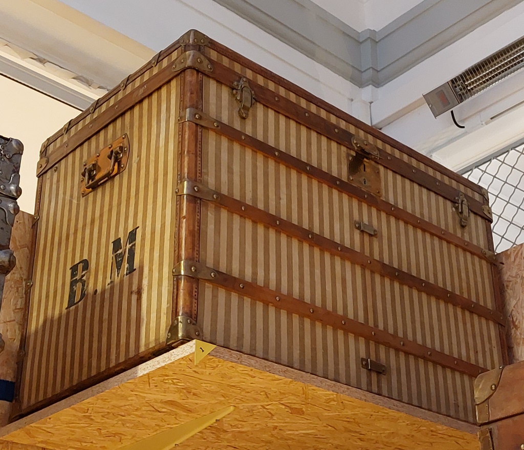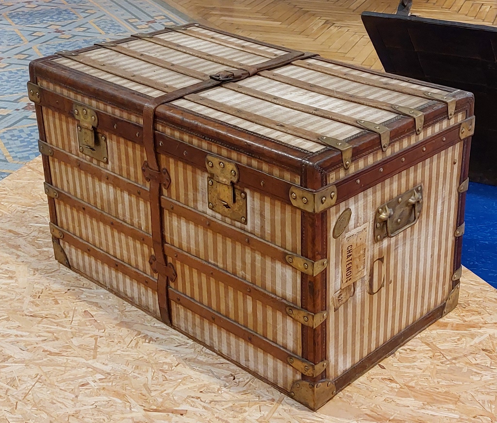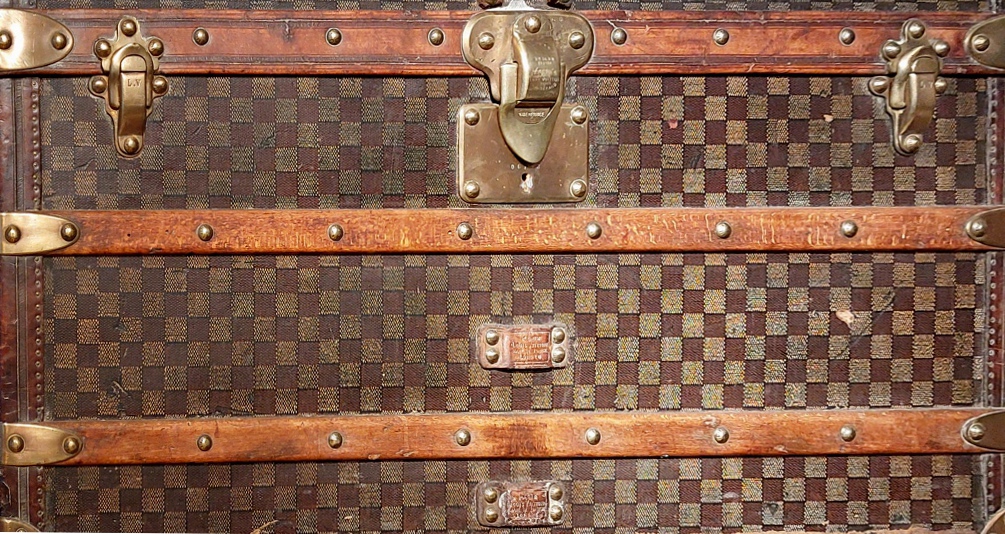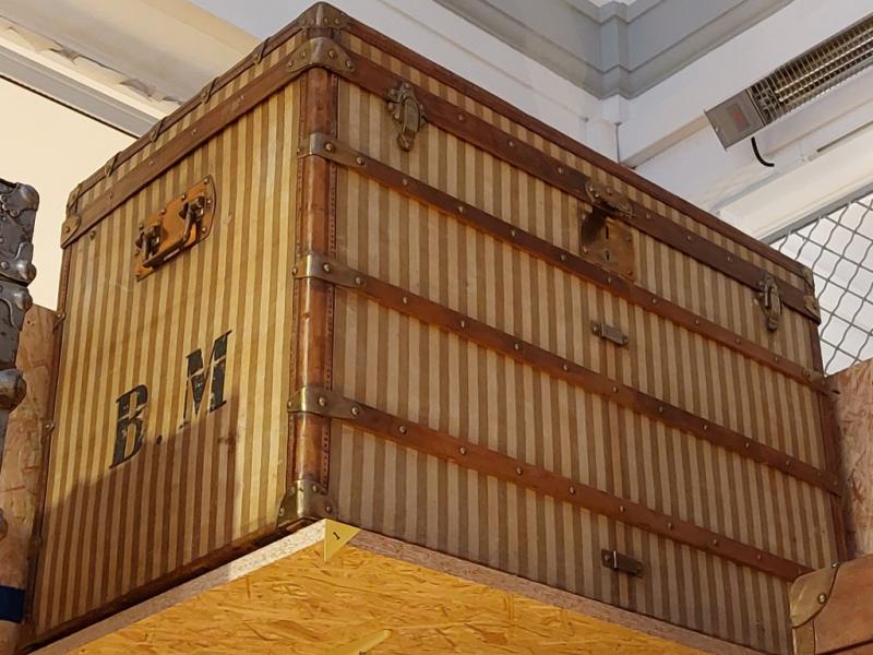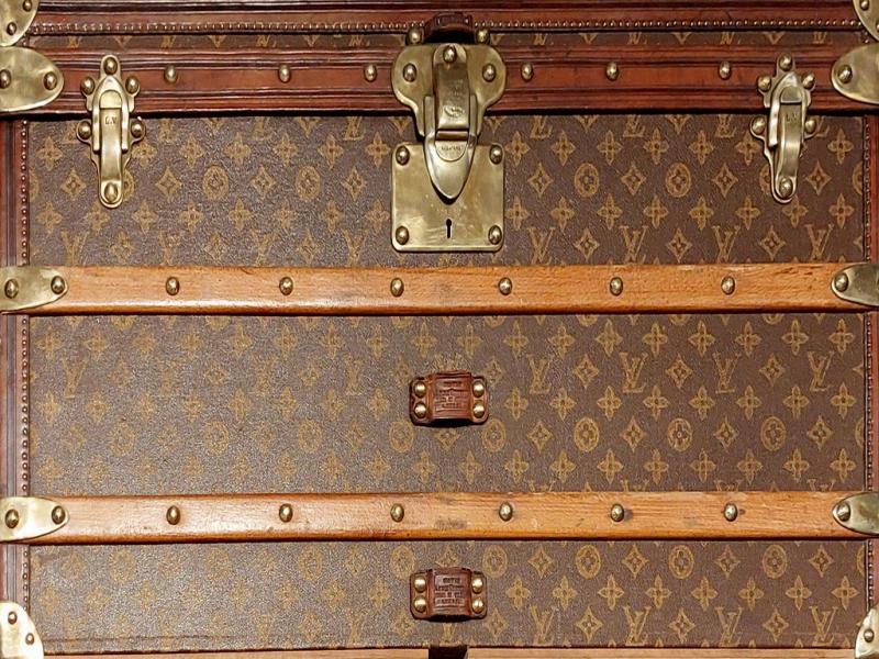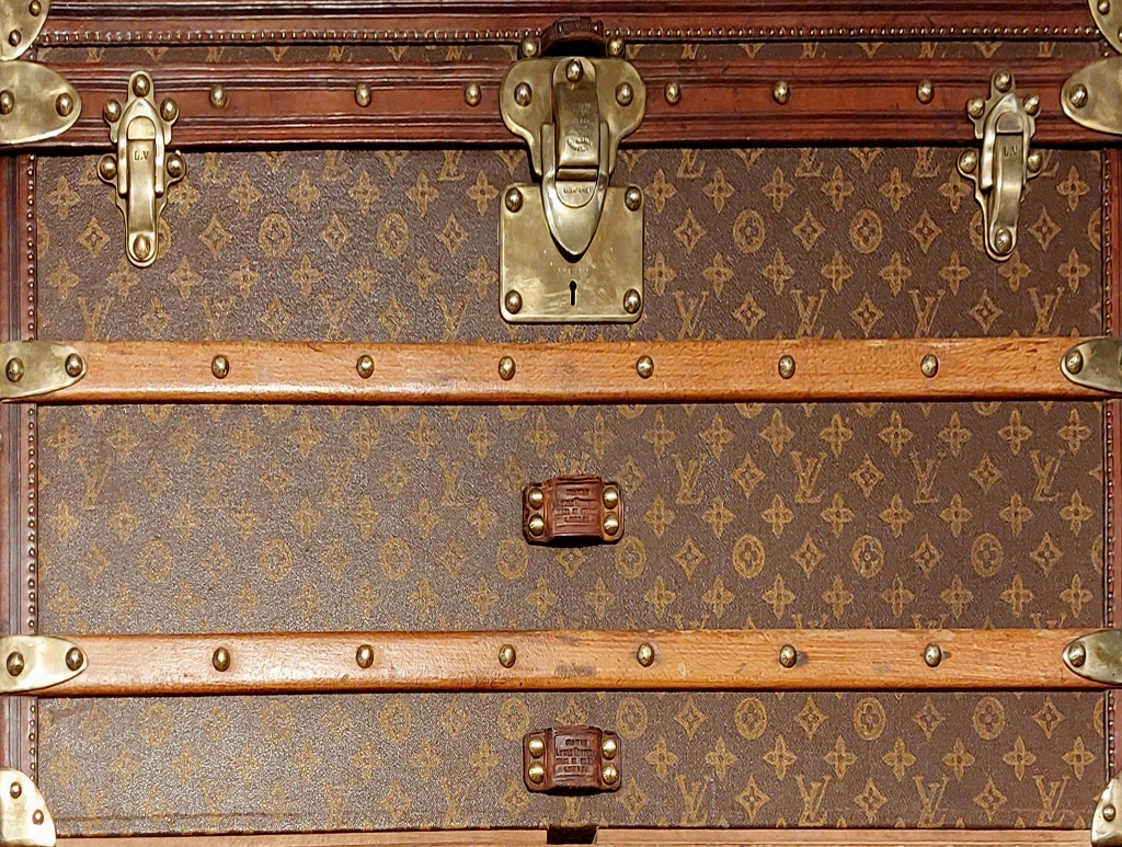 Cet artisanat réalisait du sur-mesure et répondait à toute demande, quelle qu’elle puisse être. Des fabricants réputés s’y sont illustrés avec des malles exceptionnelles commandées par des célébrités du temps. Ils ont aussi créé leurs propres toiles de revêtement, afin de rompre avec la couleur « gris Trianon »2, qui s’était largement répandue dans le domaine du bagage au cours du XIXe s. A partir de 1872, Louis Vuitton lance une toile à rayures rouges, brunes ou beiges. La firme modifia plusieurs fois son décor : en 1887 apparaît un motif à damier puis, en 1896, la toile « Monogram », avec les initiales LV entrelacées. Enfin, en 1904, Georges Vuitton sortit la « Vuittonite », imperméable et résistante. D’autres établissements de luxe suivirent l’exemple de cette grande maison : Moynat, par exemple, choisit à partir de 1880 un décor à damier et, trente ans plus tard, un motif en « M » ; Goyard créa vers 1900 la « Goyardine », une toile noire ornée d’un chevron. Rapidement imités eux aussi, ils durent se protéger des contrefaçons par des brevets.