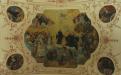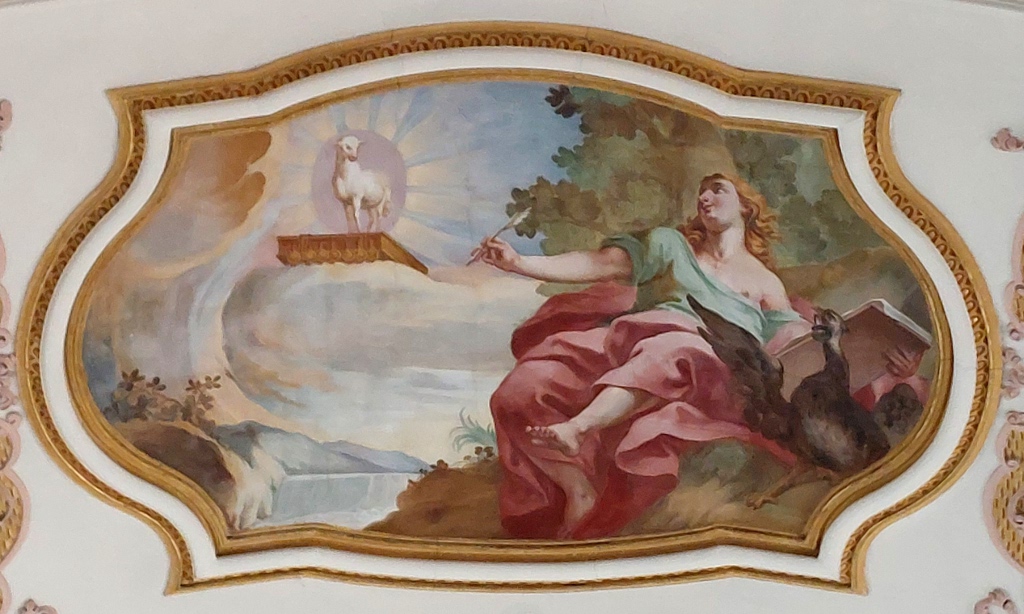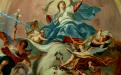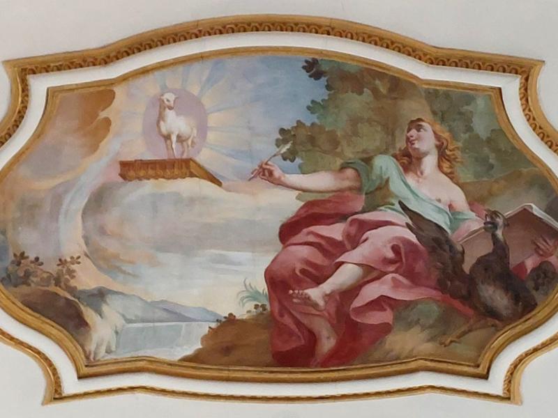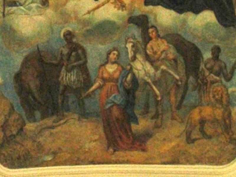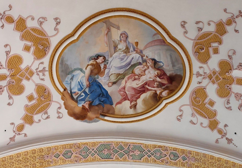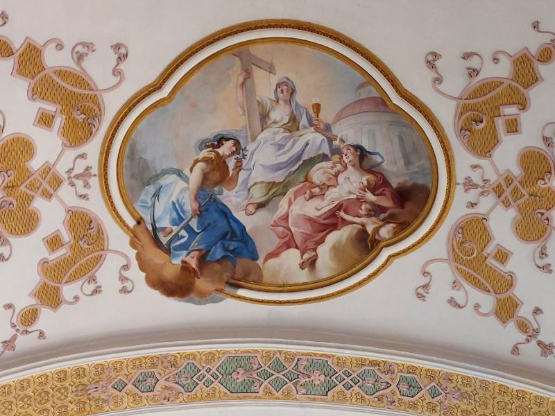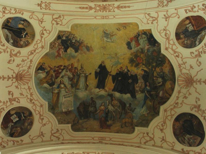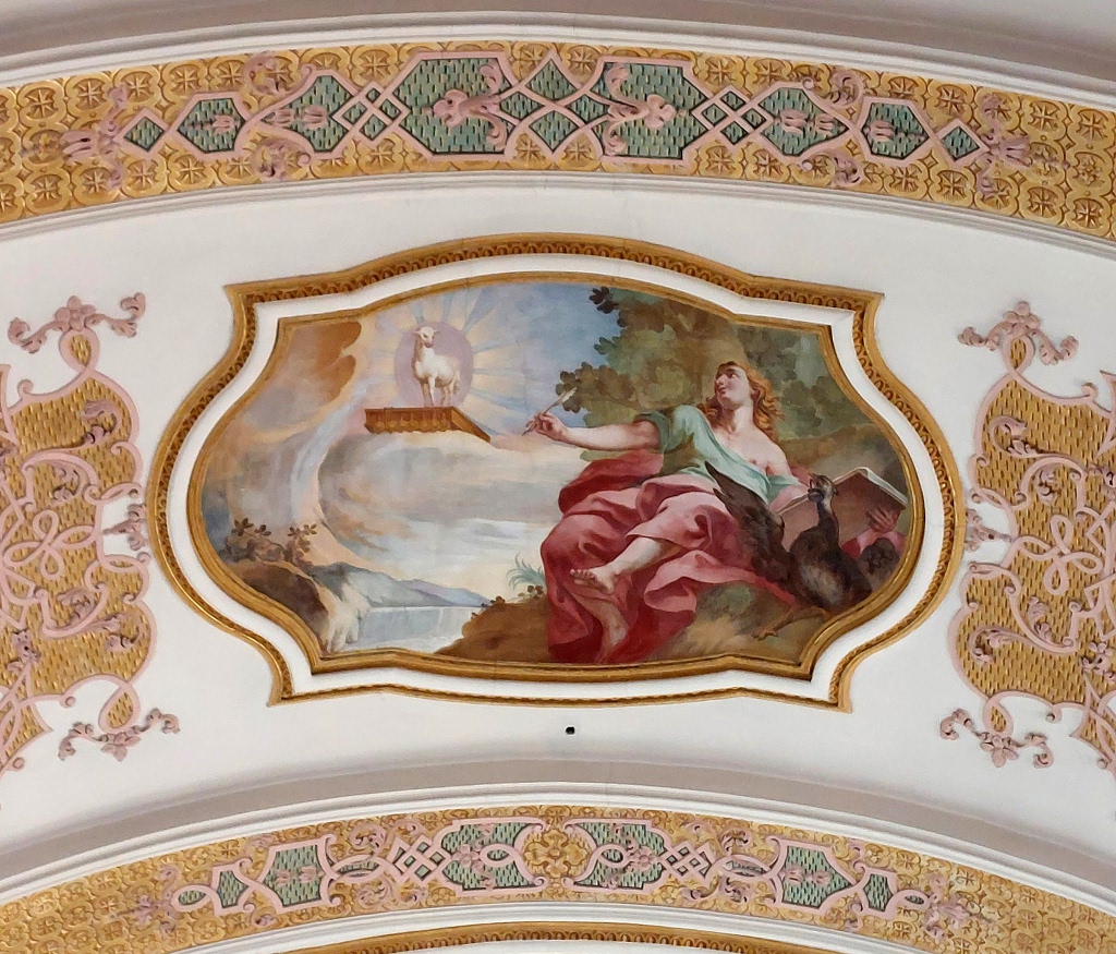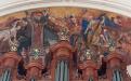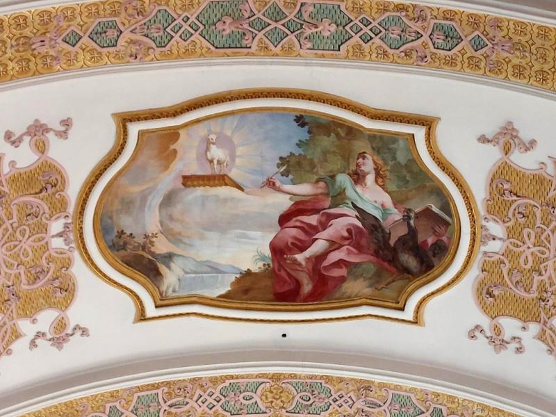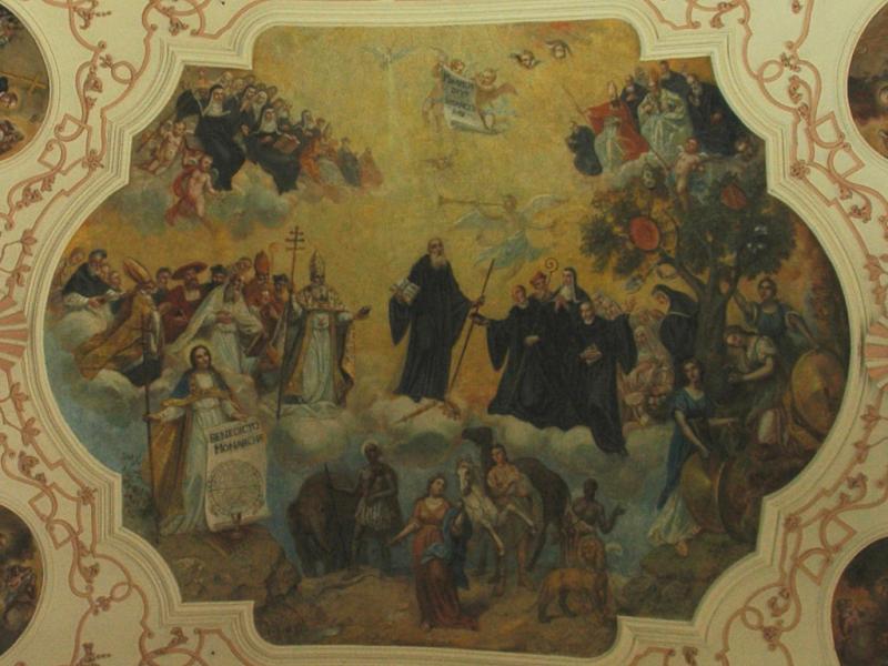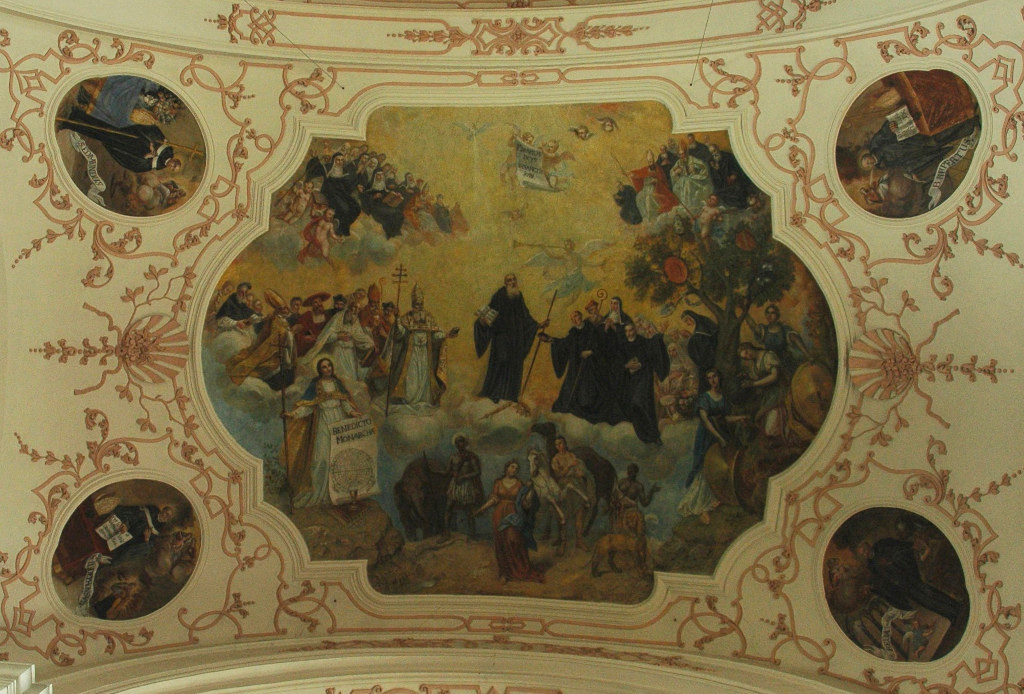 En une sorte d’apothéose, la gloire de l’ordre bénédictin apparaît en trois registres : en haut, moines et moniales, au milieu, personnalités éminentes de l’ordre, avec saint Benoît au centre. Les figures symboliques des continents sont en dessous. En réalité, peut-être vaudrait-il mieux parler de régions du monde selon les conceptions de l’Antiquité plutôt que de continents. Car si l’on peut reconnaître l’Inde, représentée par un Noir et un éléphant, l’Europe par une femme et un cheval, l’Asie par un homme et un chameau et l’Afrique par un Noir et un lion, on est surpris de ne pas voir figurer le Nouveau Monde, cette Amérique qui était déjà connue à l’époque de la réalisation des peintures d’Ebersmunster.