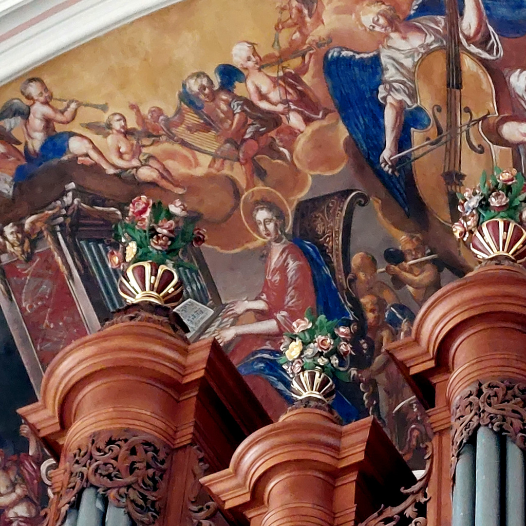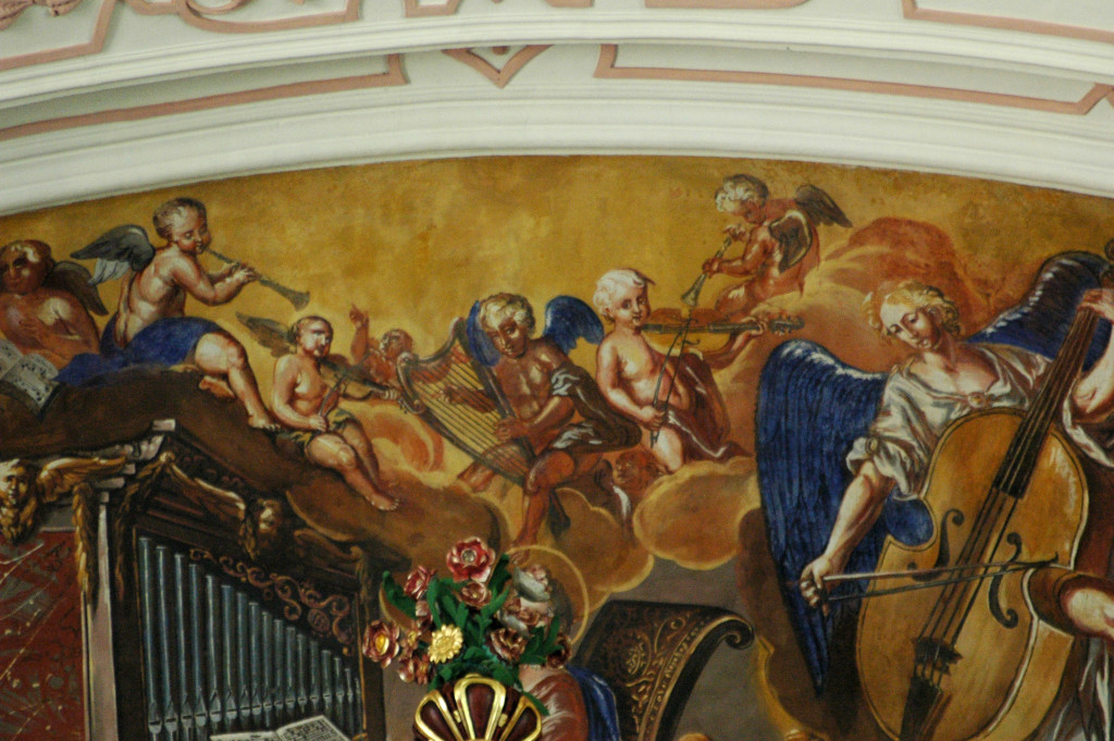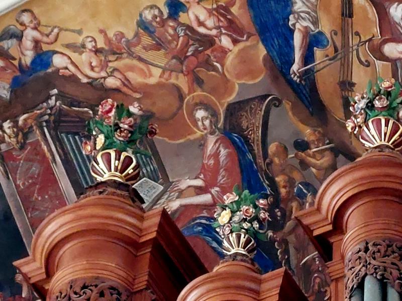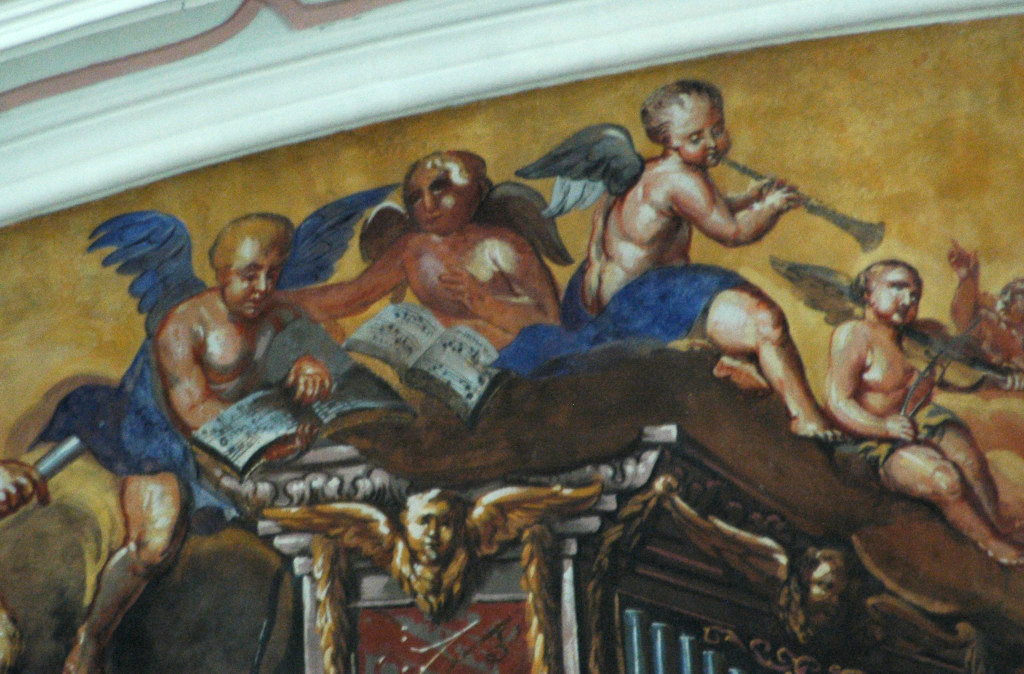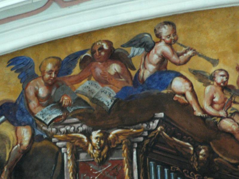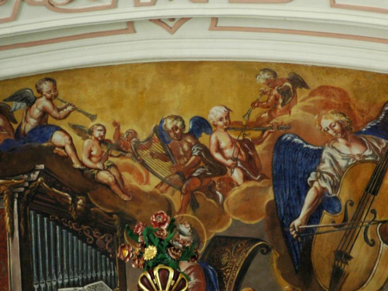 Au-dessus de l’orgue : Sainte Cécile jouant de l’orgue avec des anges musiciens.