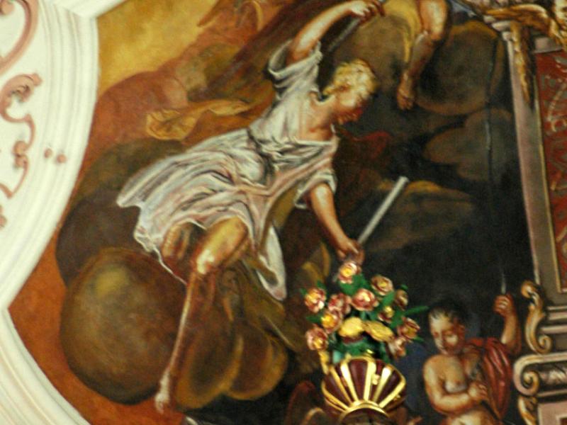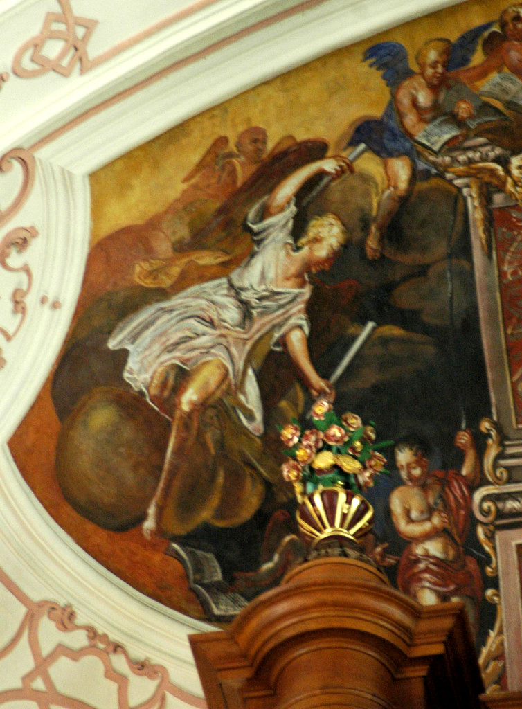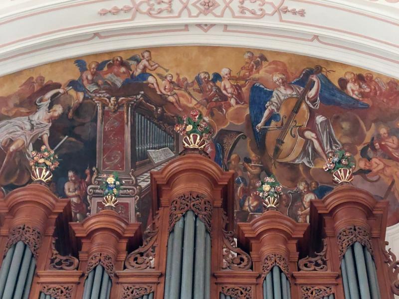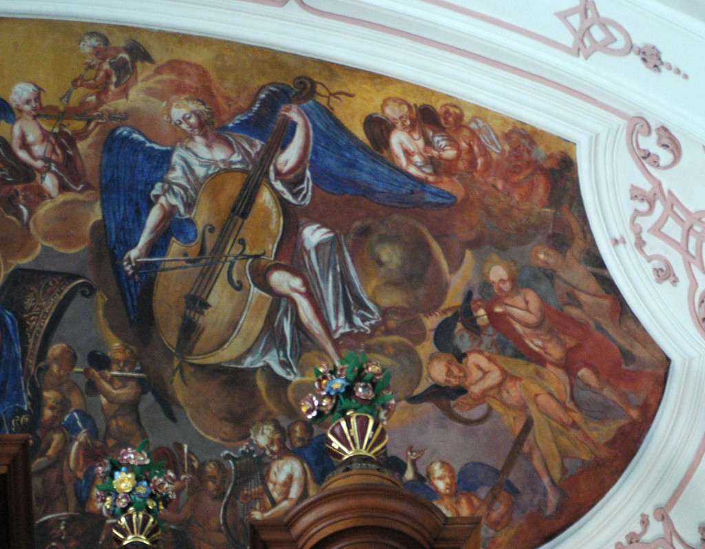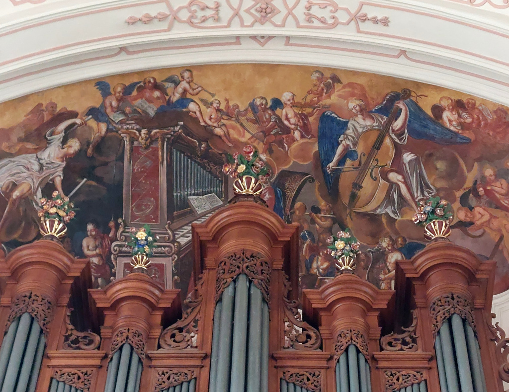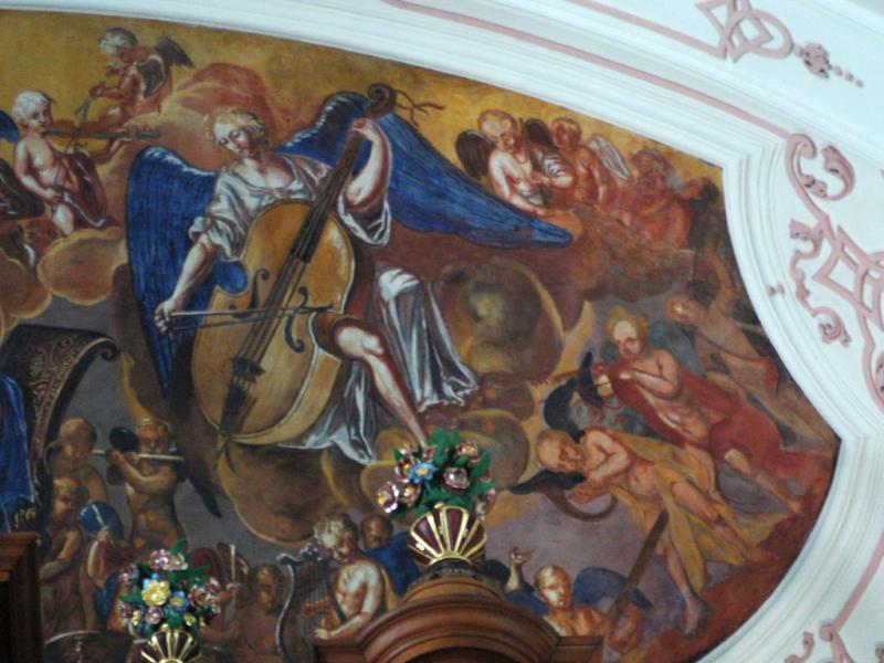 Au-dessus de l’orgue : Sainte Cécile jouant de l’orgue avec des anges musiciens.