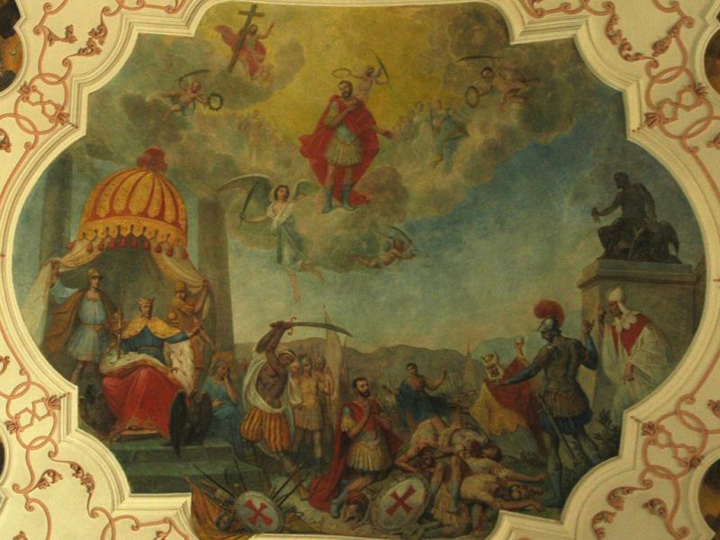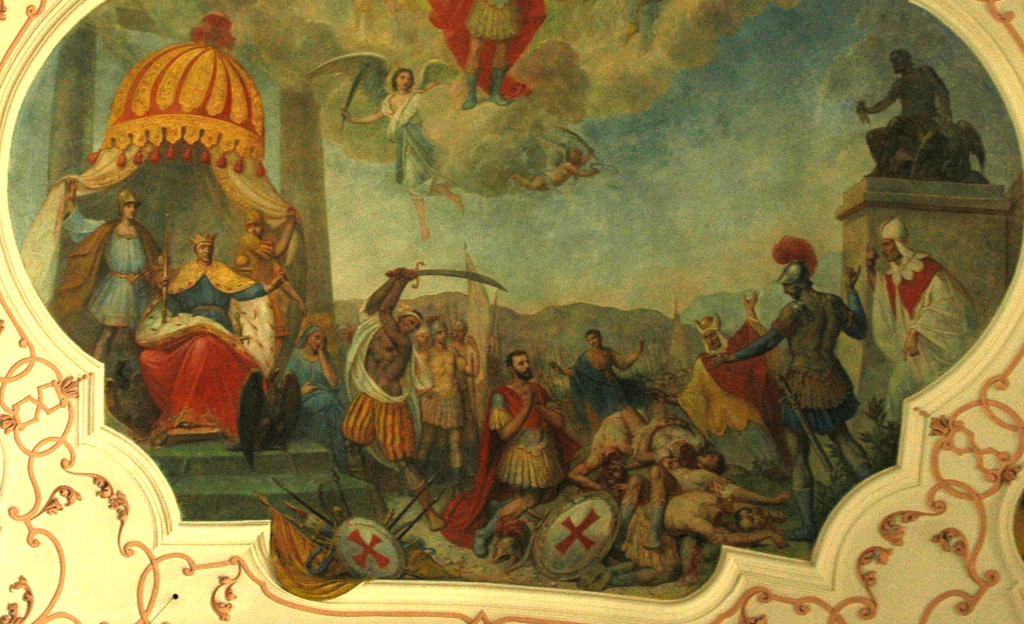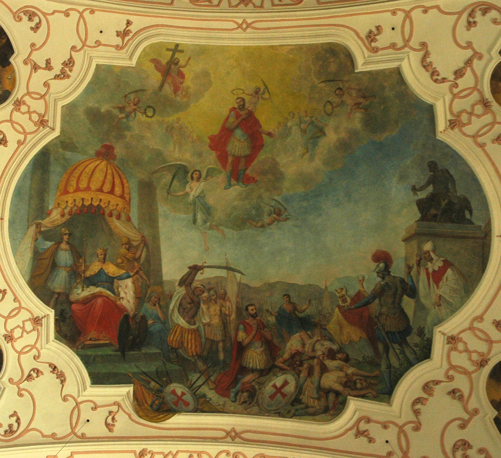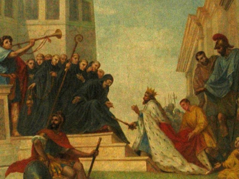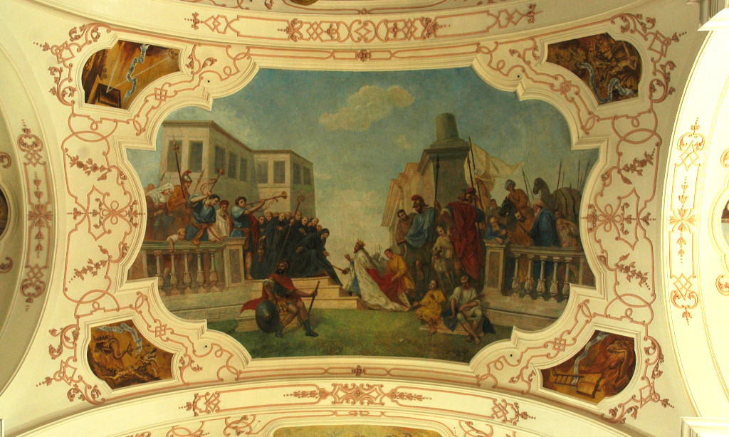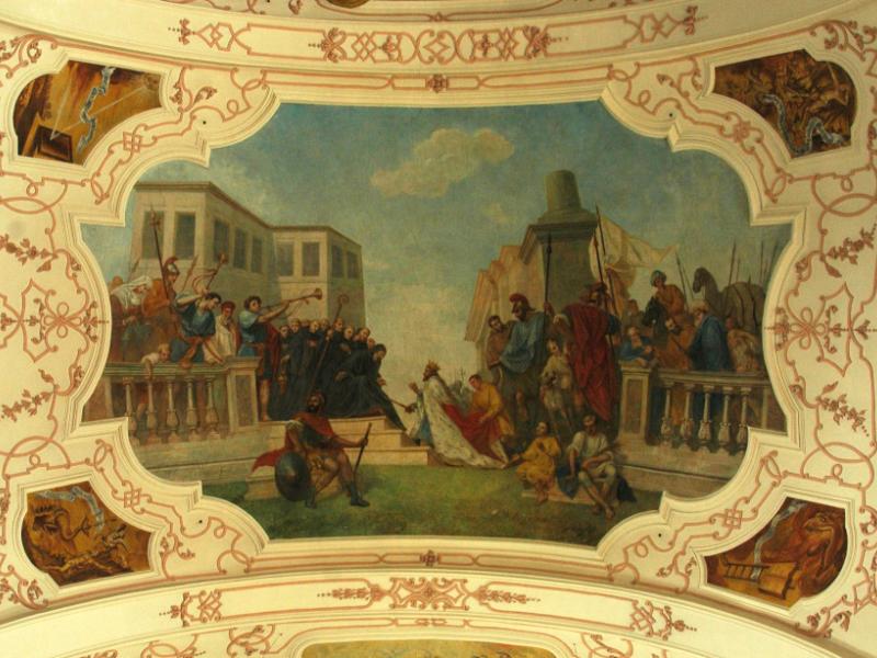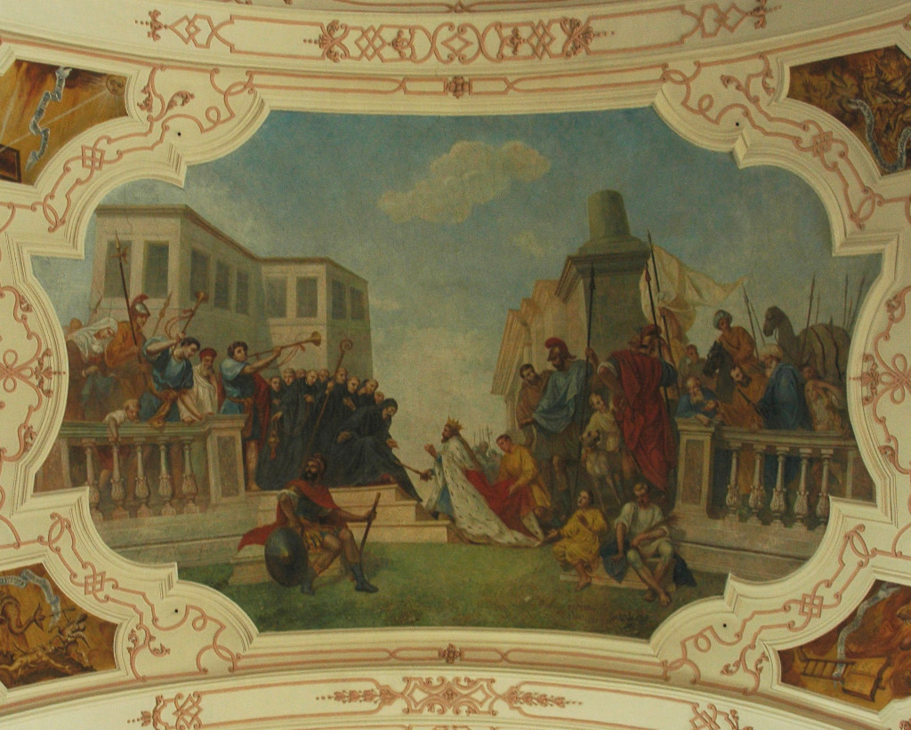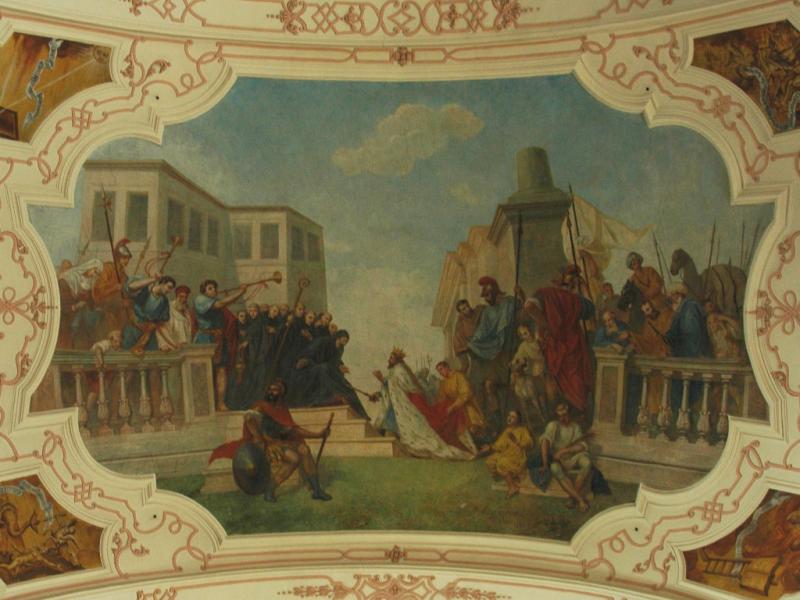 • 6. L’empereur byzantin Justinien voulait reprendre l’Italie, alors sous l’emprise des Ostrogoths ; son général Bélisaire prit leur capitale Ravenne et vainquit leur roi Vitigès en 540. Après la disparition de ses concurrents, Totila fut élu roi des Ostrogoths en 541. Il suivit une politique avisée : il se présentait comme le défenseur de la romanité face à l'oppression étrangère et libéra les esclaves des grands domaines. Il chercha aussi à se rapprocher de l’Église et, selon Grégoire le Grand, aurait rencontré saint Benoît au monastère du Mont-Cassin. Lors de cette entrevue, qui fait l’objet de la fresque d’Ebersmunster, l’abbé lui aurait reproché sa cruauté et lui aurait prédit sa défaite. En effet, après d’indéniables succès, Totila fut défait par la général byzantin Narsès en 552. La mort de leur roi ouvrit le déclin des Ostrogoths dans la péninsule.