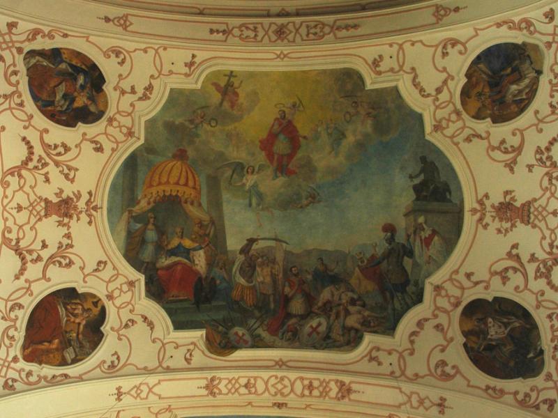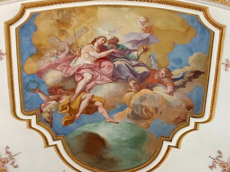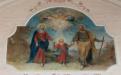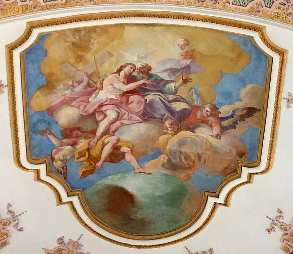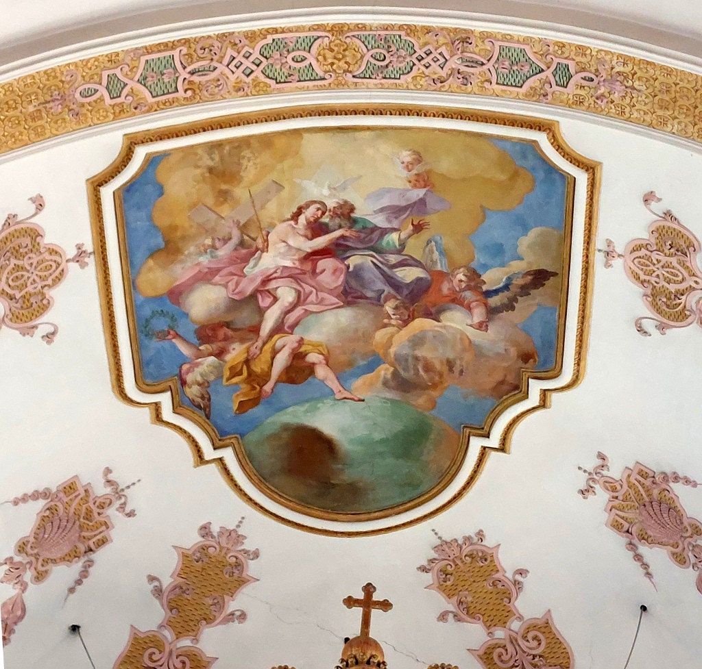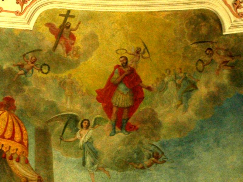 Comme nous l’avons dit, la partie supérieure de la fresque montre la montée aux Cieux de saint Maurice. Couvert d’un ample manteau pourpre, il se tient sur des nuées célestes, environné d’anges qui brandissent palmes et couronnes de fleurs. L’assemblée des saints fait cercle autour de lui et le Christ en gloire l’accueille, appuyé à sa croix.