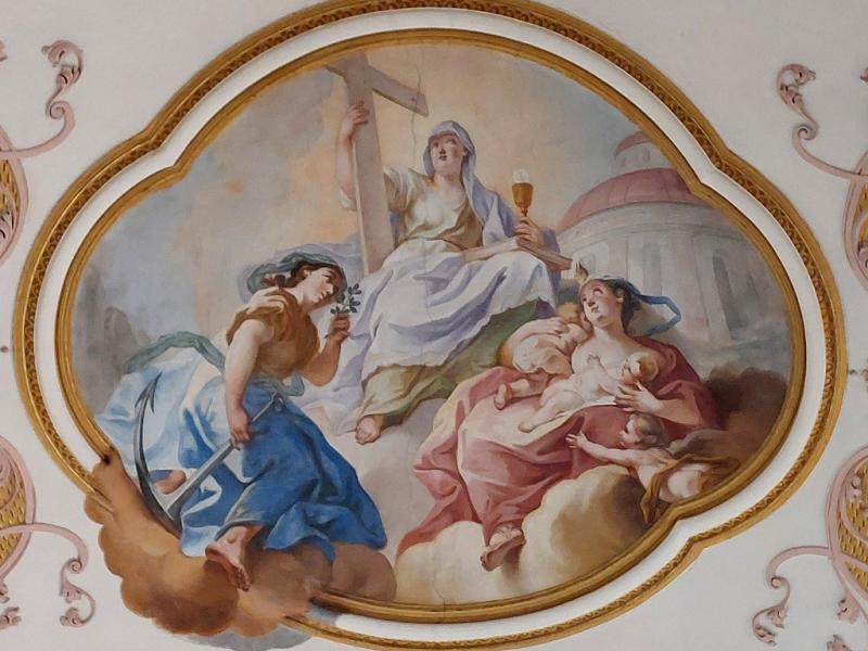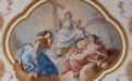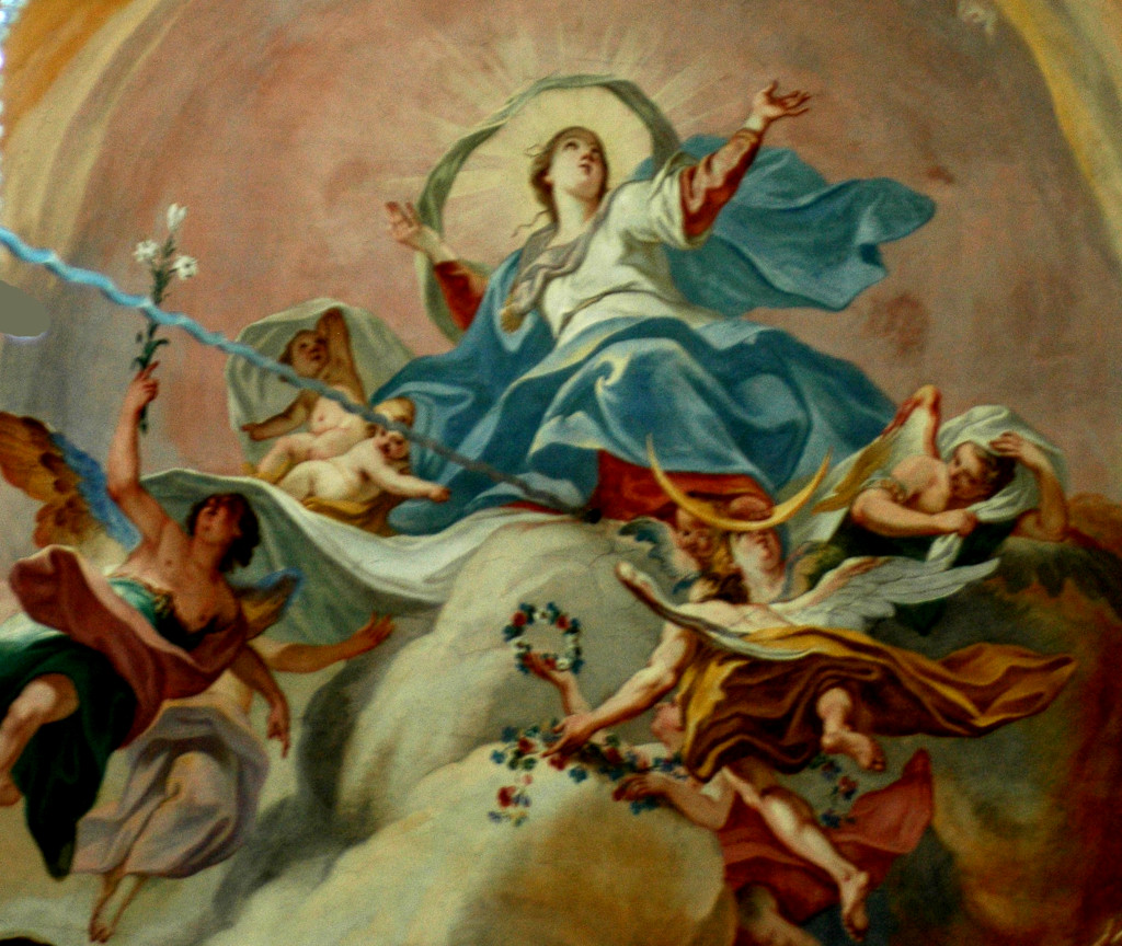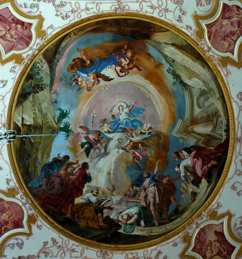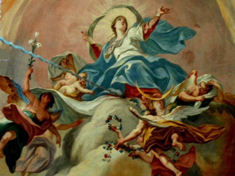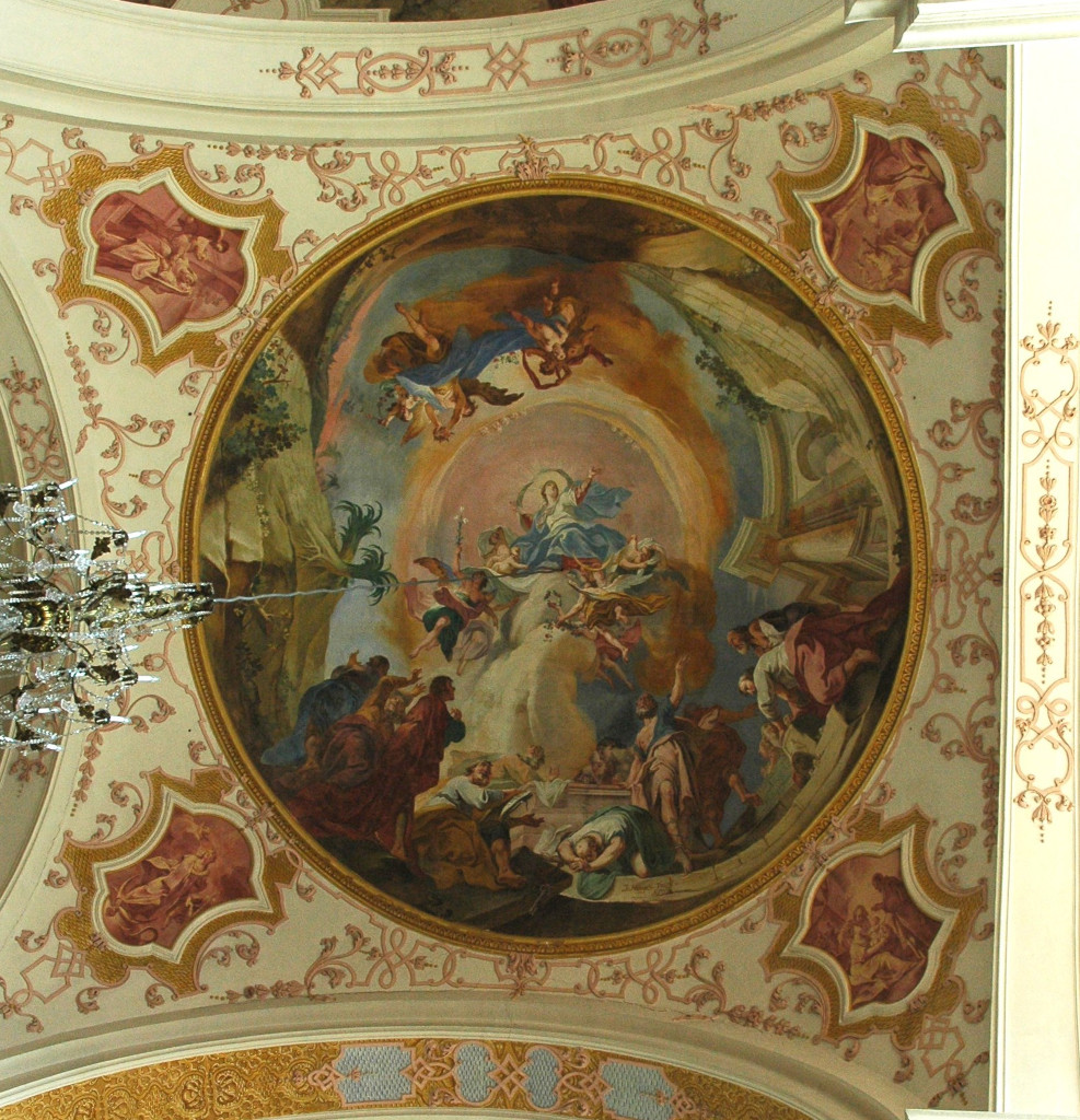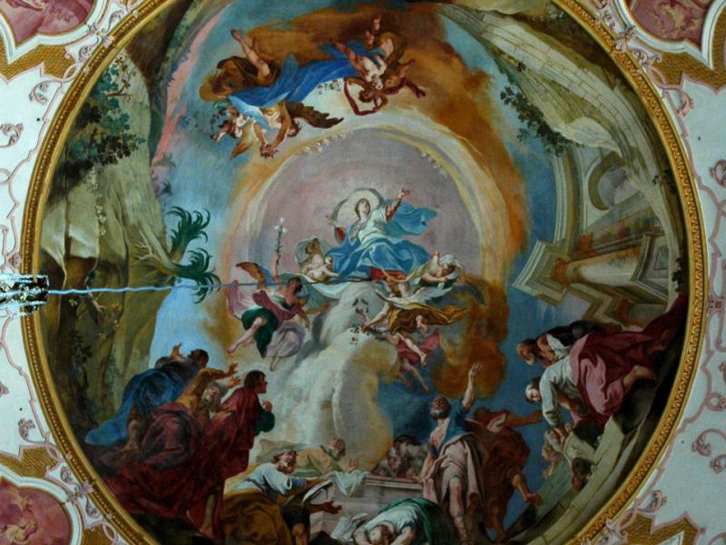 À la croisée et au chœur : la Vierge Marie est représentée dans l’exaltation de sa montée au Ciel. Cette Assomption , que l’on doit à Joseph Mages, est le chef-d’œuvre d’Ebersmunster. Ce peintre remarquable est aussi l’auteur des trois peintures qui se succèdent au plafond du chœur : La Foi, l’Espérance et la Charité, Vision de l’Agneau de l’Apocalypse et La Sainte-Trinité à l’abside. Son art délicat sait user, parfois avec audace, de la palette du style baroque : trompe-l’œil et perspectives, postures et mouvement, couleurs et drapés…