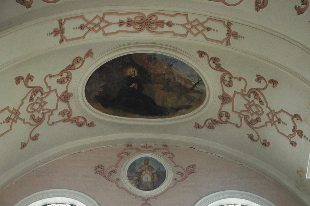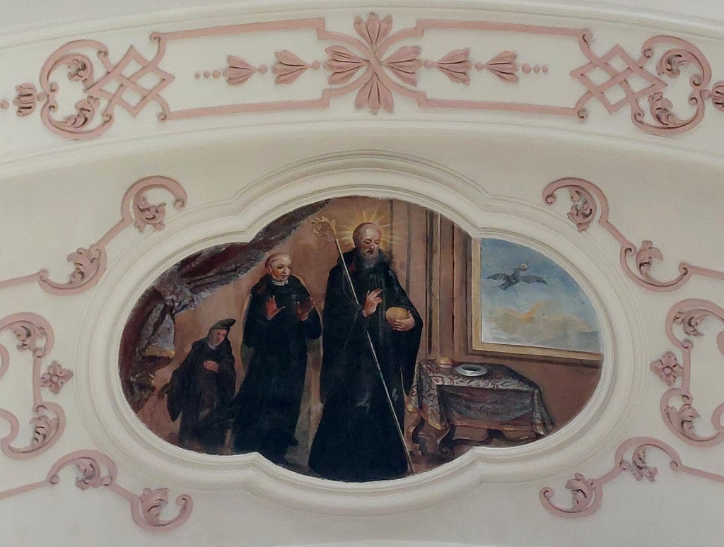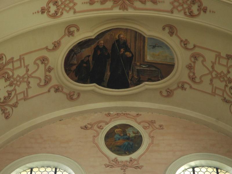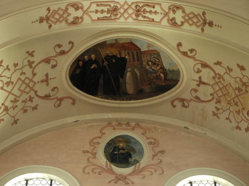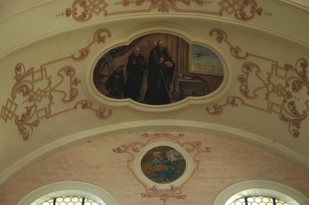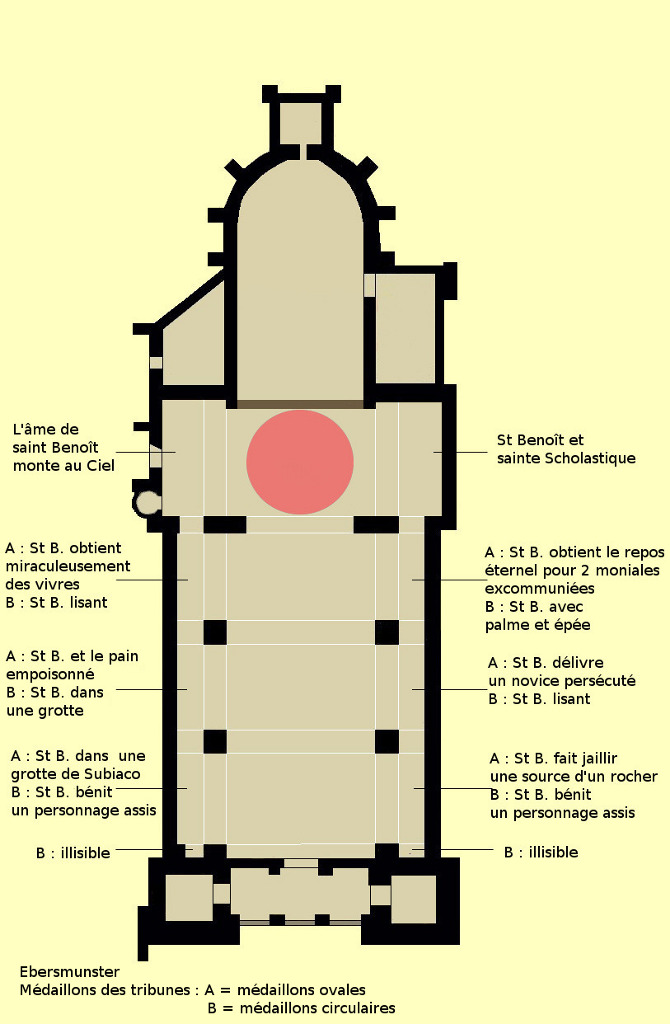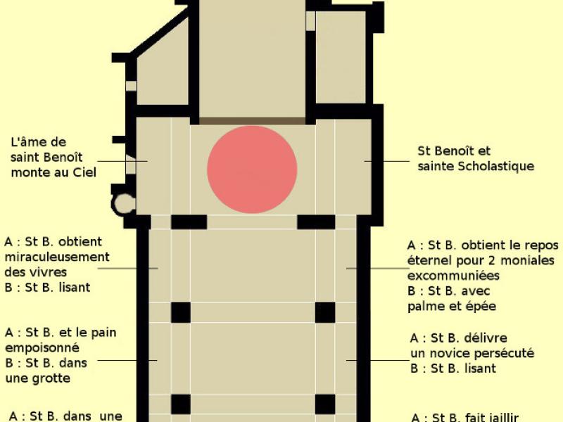Cet ensemble principal est complété par les médaillons des tribunes : ceux des voûtes sont de forme ovale et illustrent des scènes de la vie de saint Benoît ; d’autres, circulaires et situés entre les fenêtres, le représentent sous divers aspects1. Ces peintures sont réalisées dans un style assez plat.