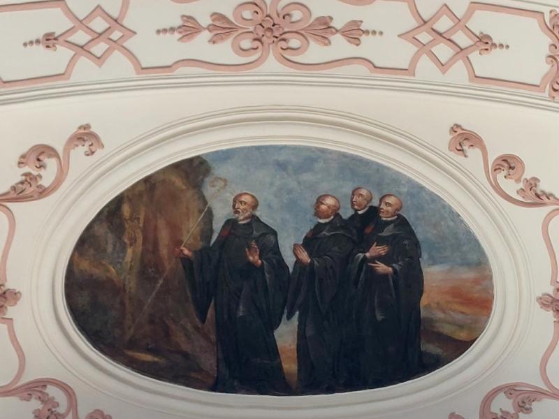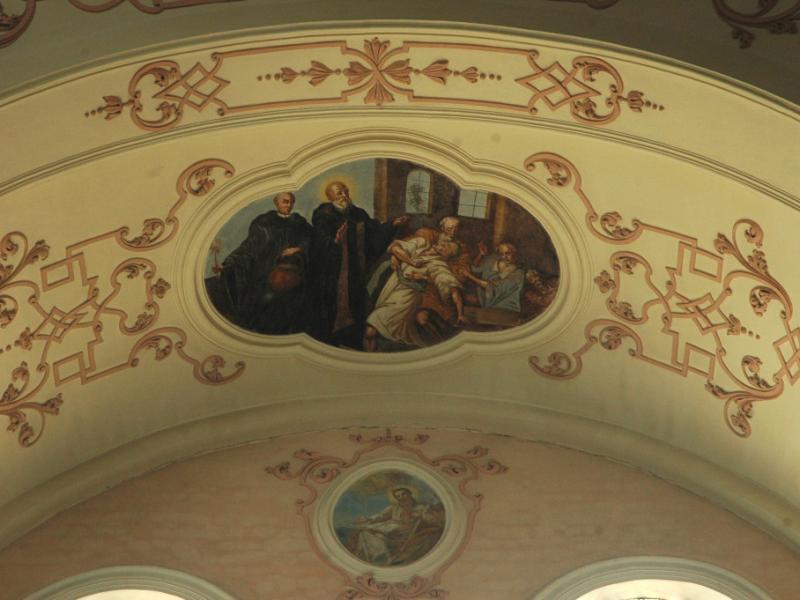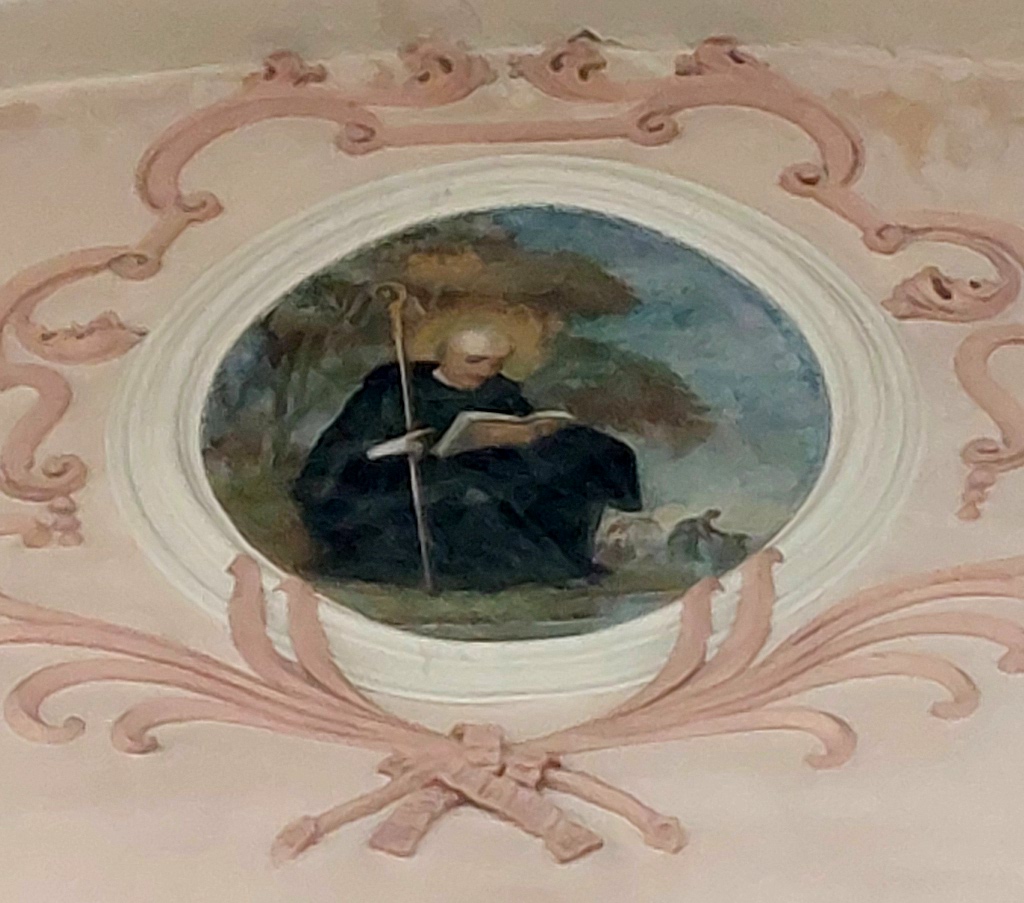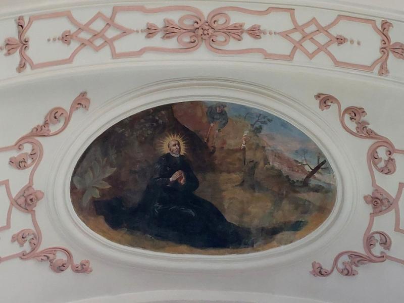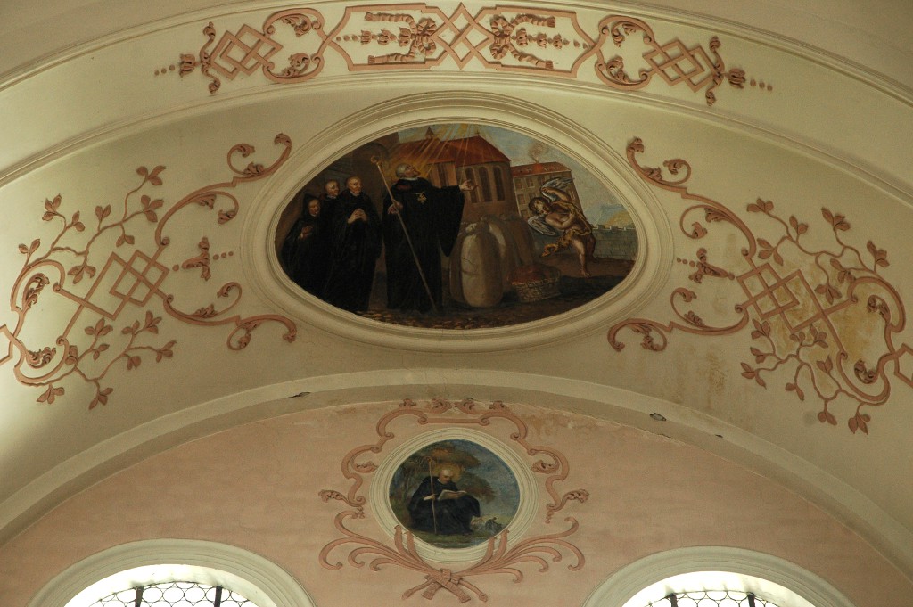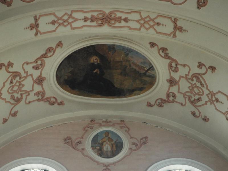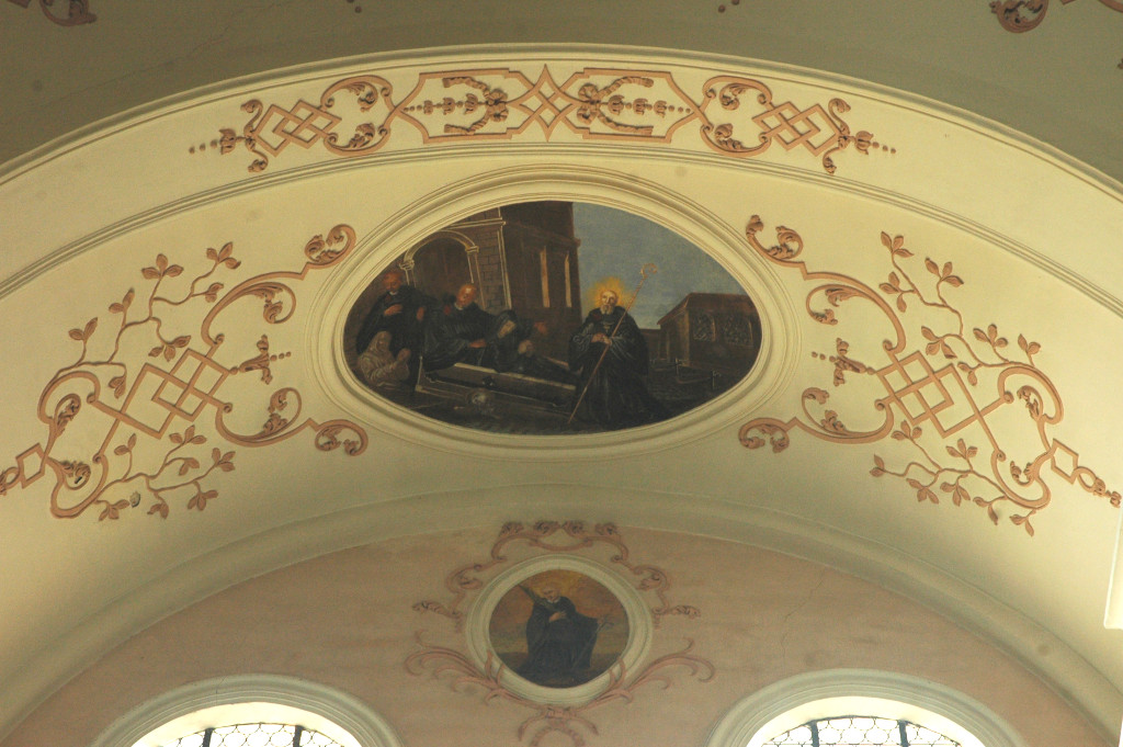Cet ensemble principal est complété par les médaillons des tribunes : ceux des voûtes sont de forme ovale et illustrent des scènes de la vie de saint Benoît ; d’autres, circulaires et situés entre les fenêtres, le représentent sous divers aspects1. Ces peintures sont réalisées dans un style assez plat.