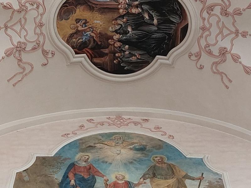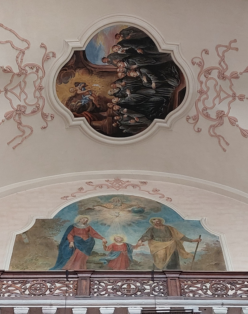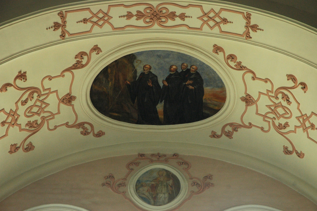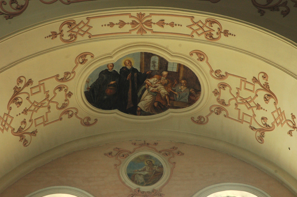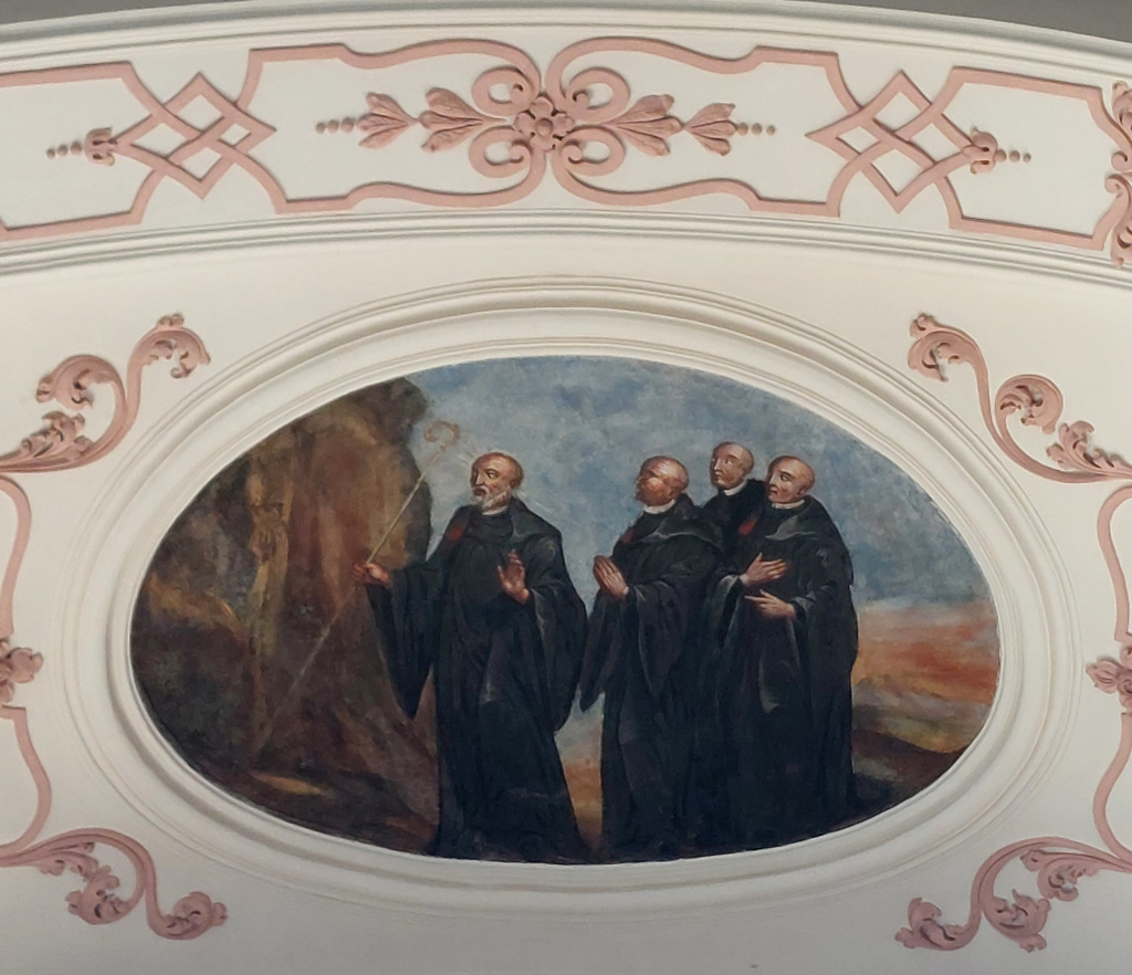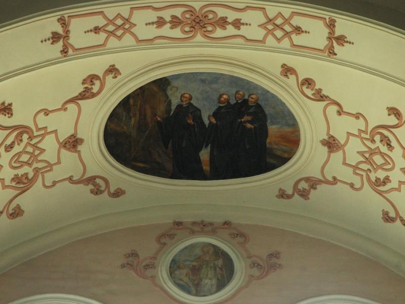 Cet ensemble principal est complété par les médaillons des tribunes : ceux des voûtes sont de forme ovale et illustrent des scènes de la vie de saint Benoît ; d’autres, circulaires et situés entre les fenêtres, le représentent sous divers aspects1. Ces peintures sont réalisées dans un style assez plat.