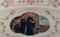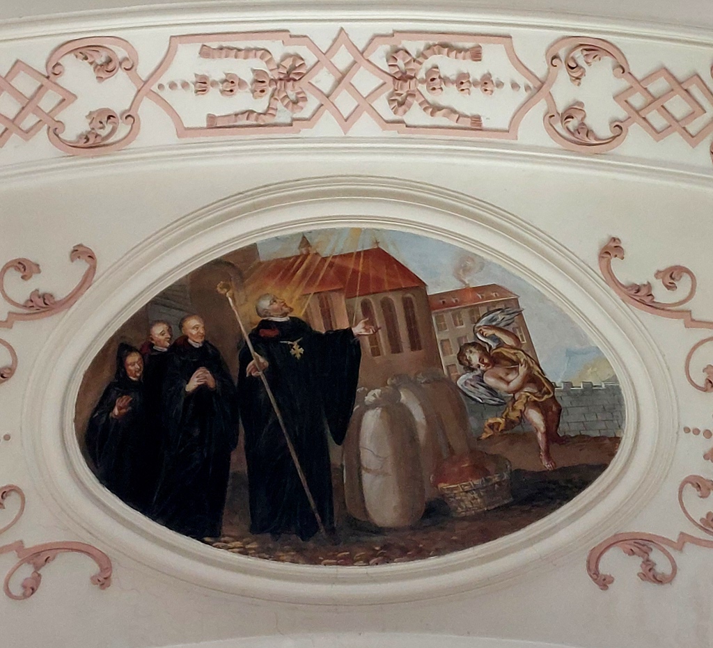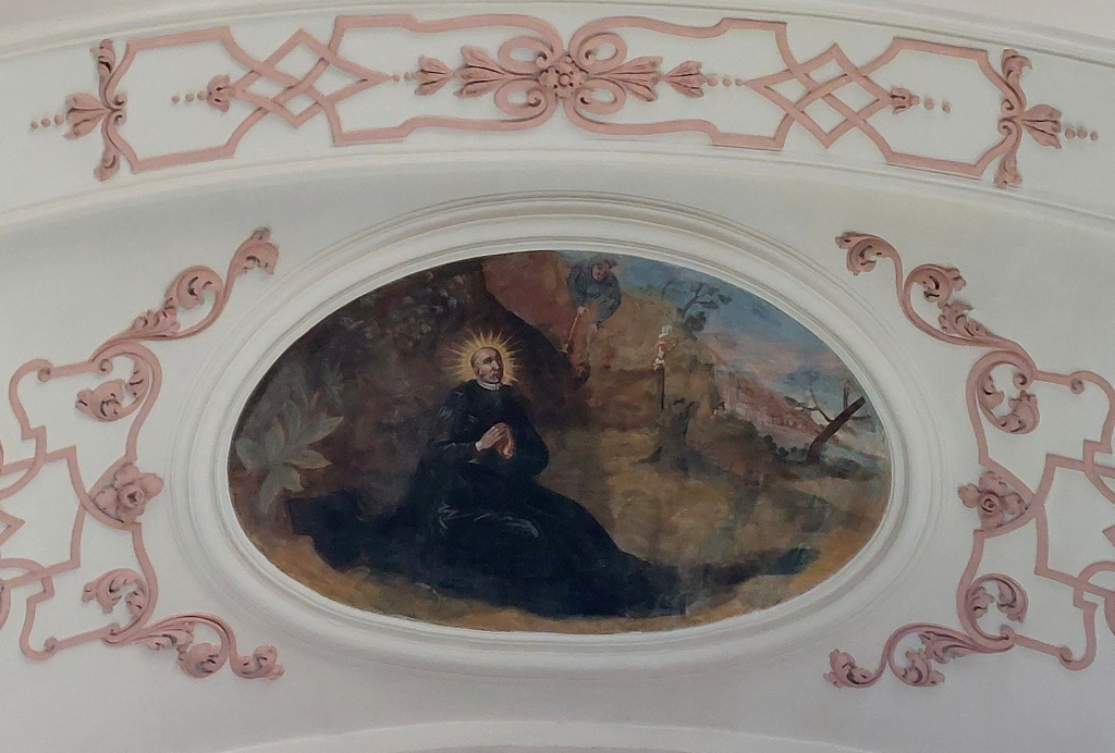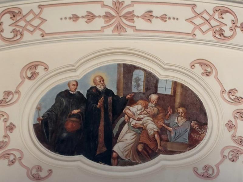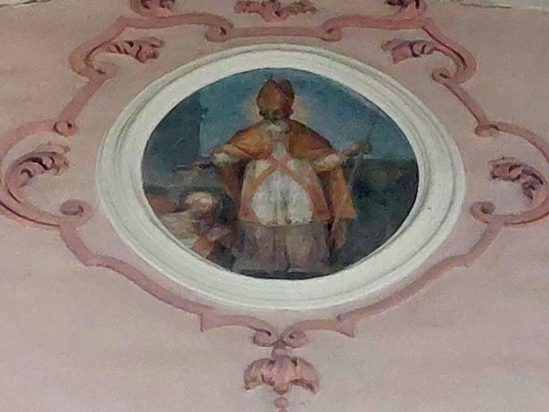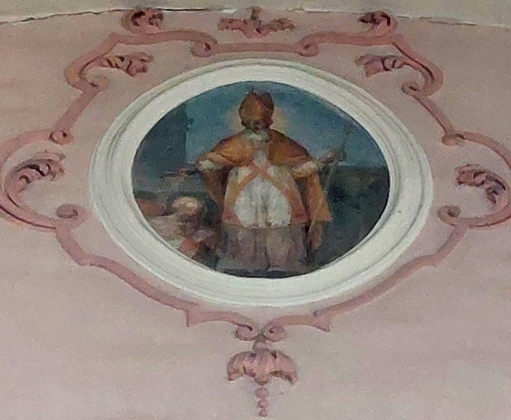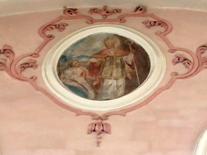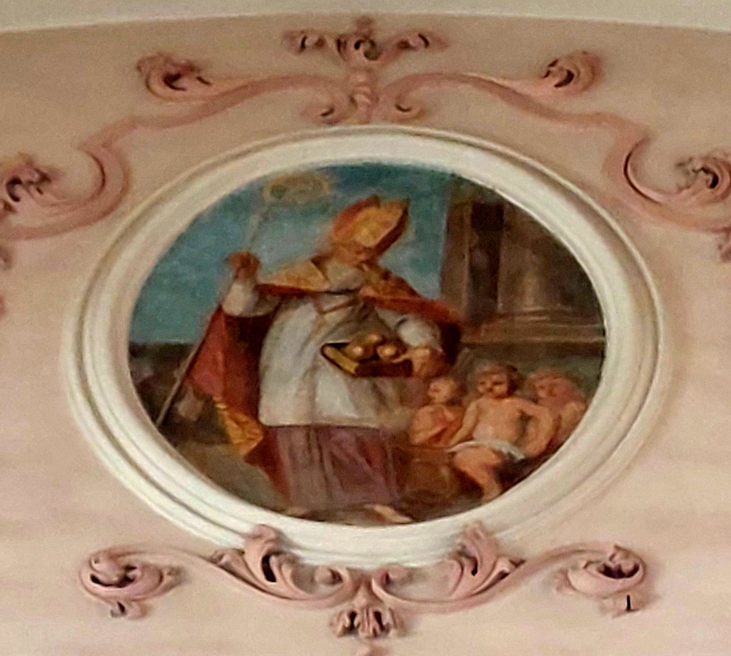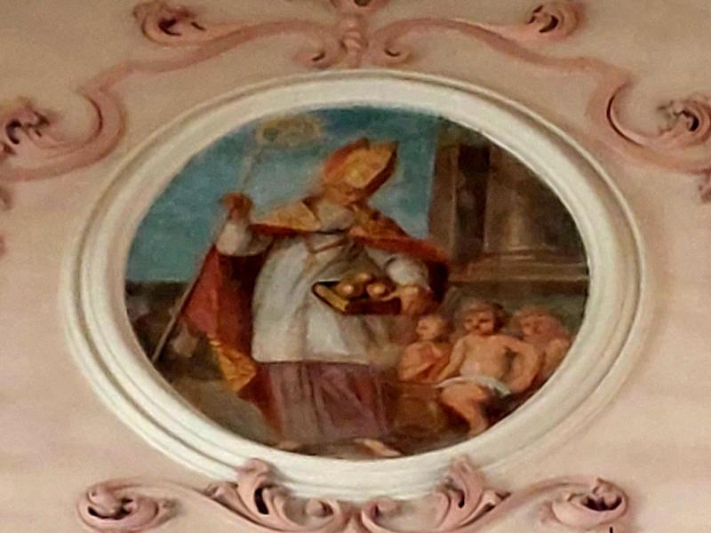 Entre les deux fenêtres, un médaillon circulaire représente saint Nicolas, avec les trois petits enfants qui sortent du saloir. C’est le seul médaillon circulaire qui ne se rapporte pas à saint Benoît : bien que cela soit surprenant, le doute n’est pourtant pas permis car saint Nicolas est évoqué ici par le même miracle que sur sa statue de l’autel secondaire tout proche.