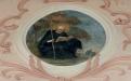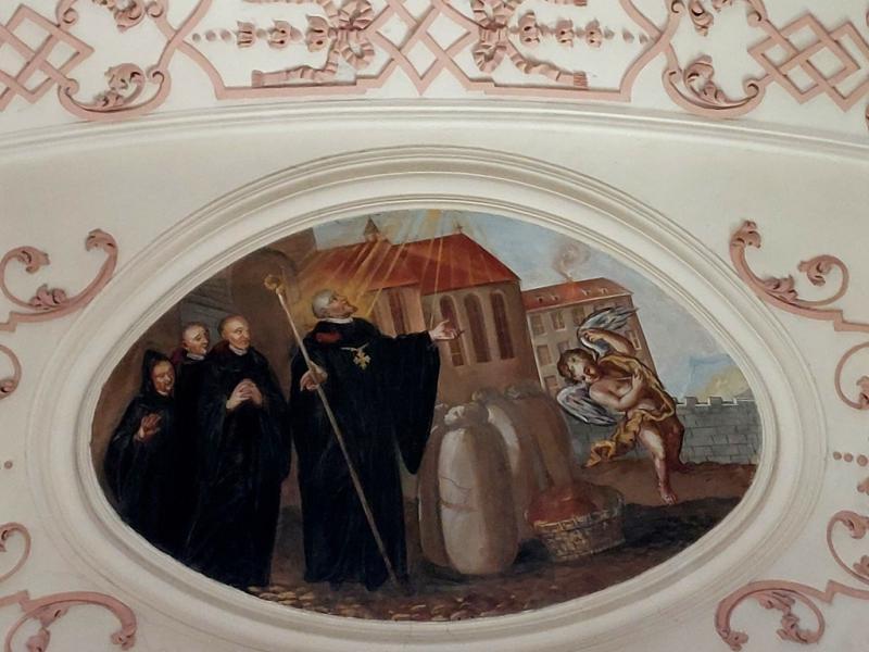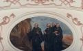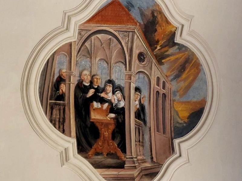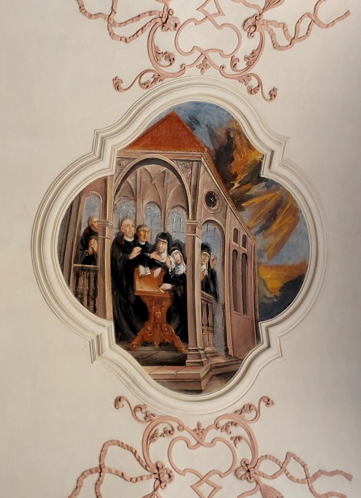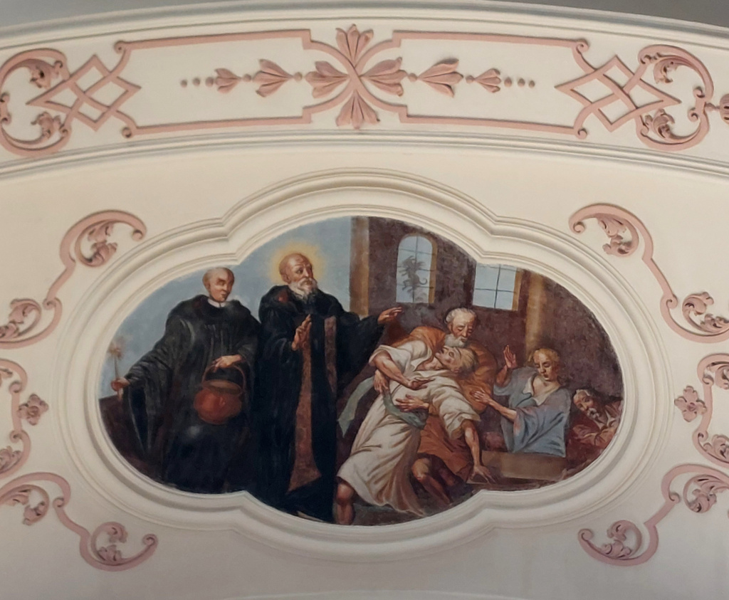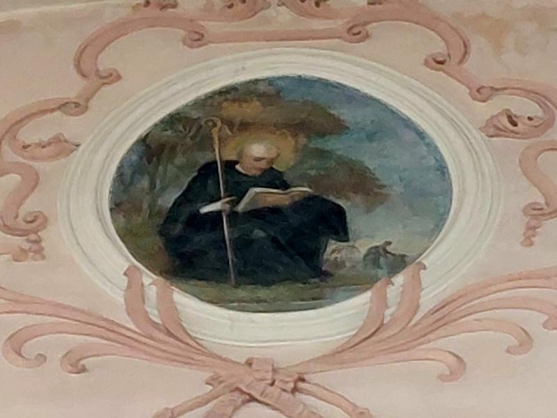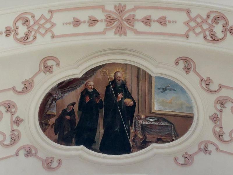 Le transept Sud est aussi orné d’un médaillon au plafond. D’une forme plus complexe, il représente saint Benoît et sa sœur. Selon l’hagiographie, afin de retenir son frère en visite et de poursuivre avec lui leur entretien spirituel, sainte Scholastique avait prié que des intempéries l’empêche de partir. On voit l’orage qui se déchaîne dans le lointain de la scène.