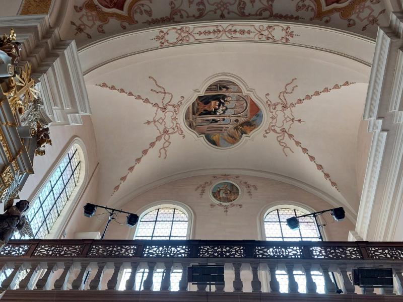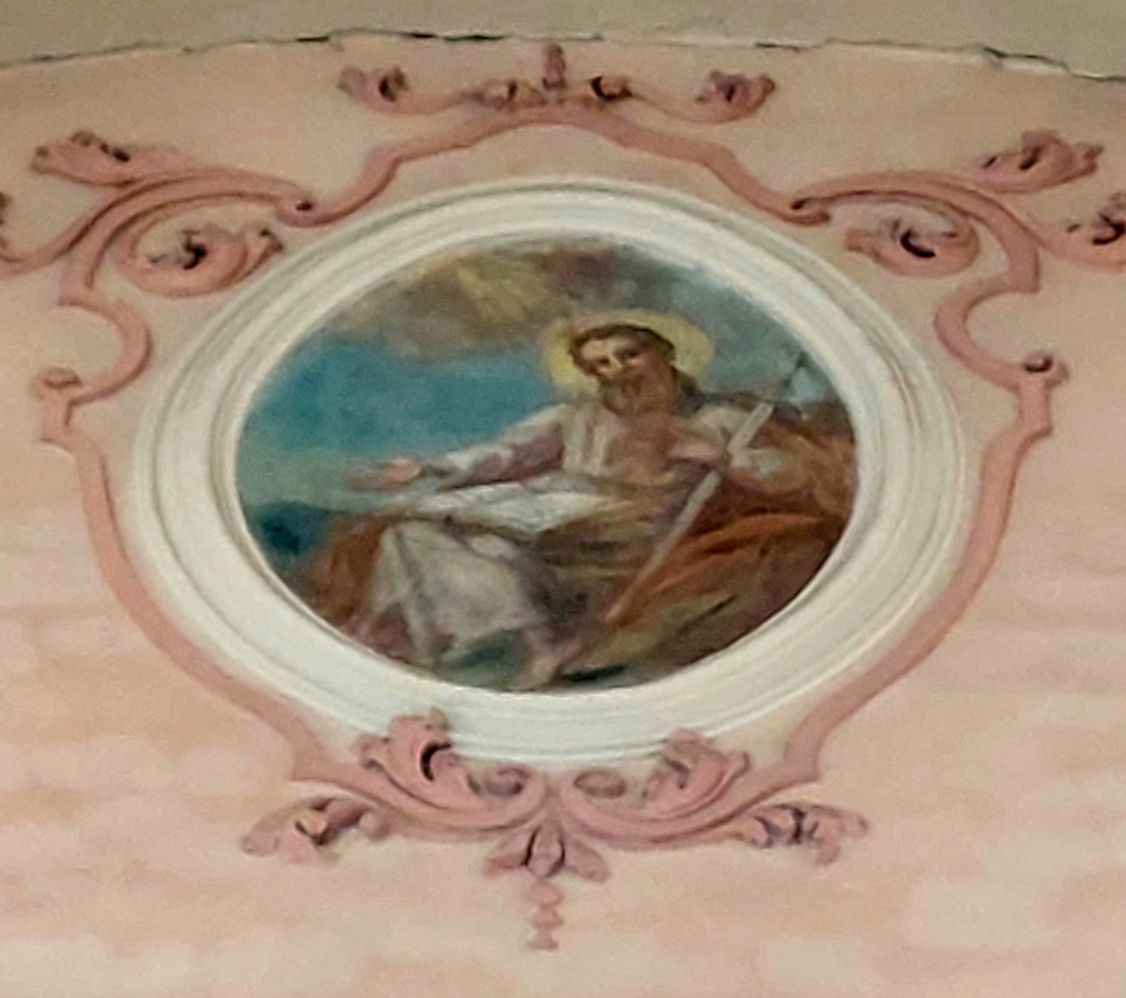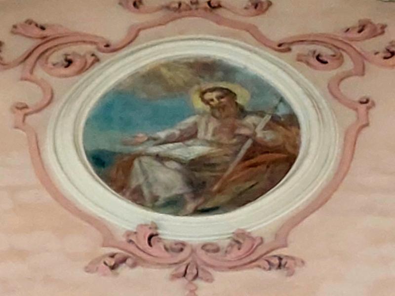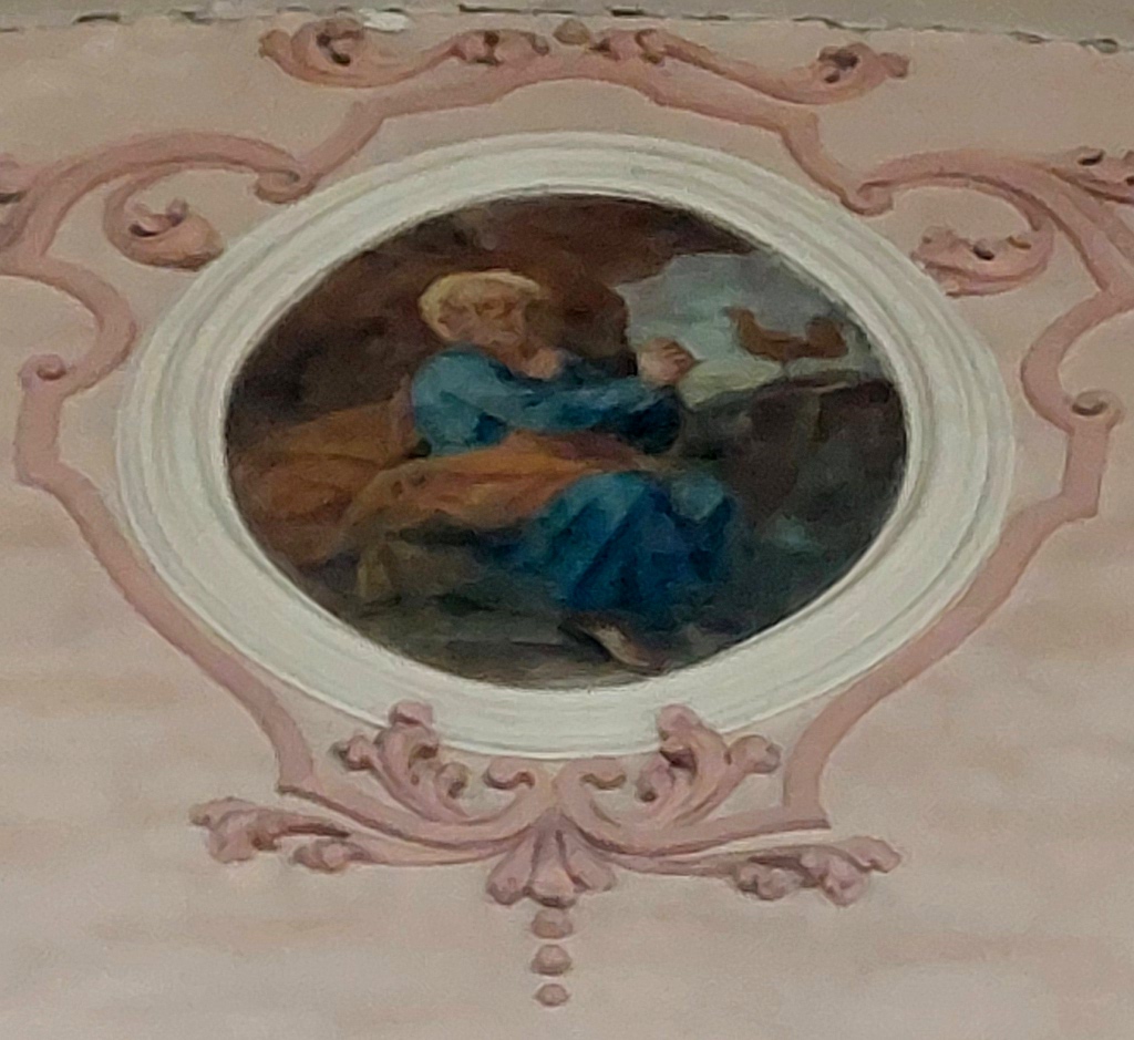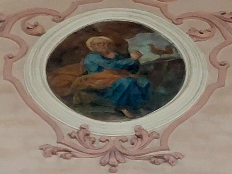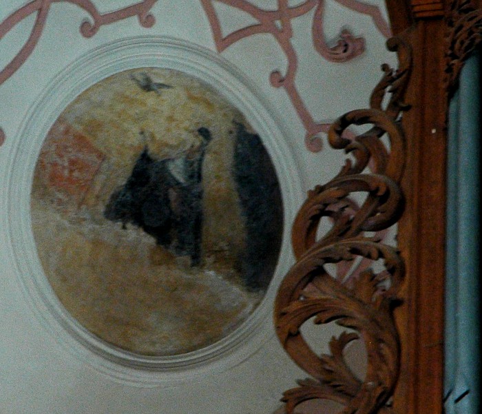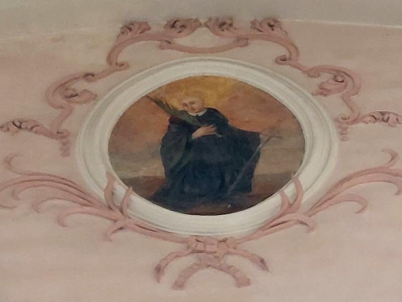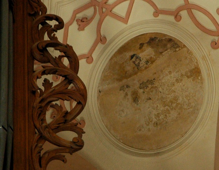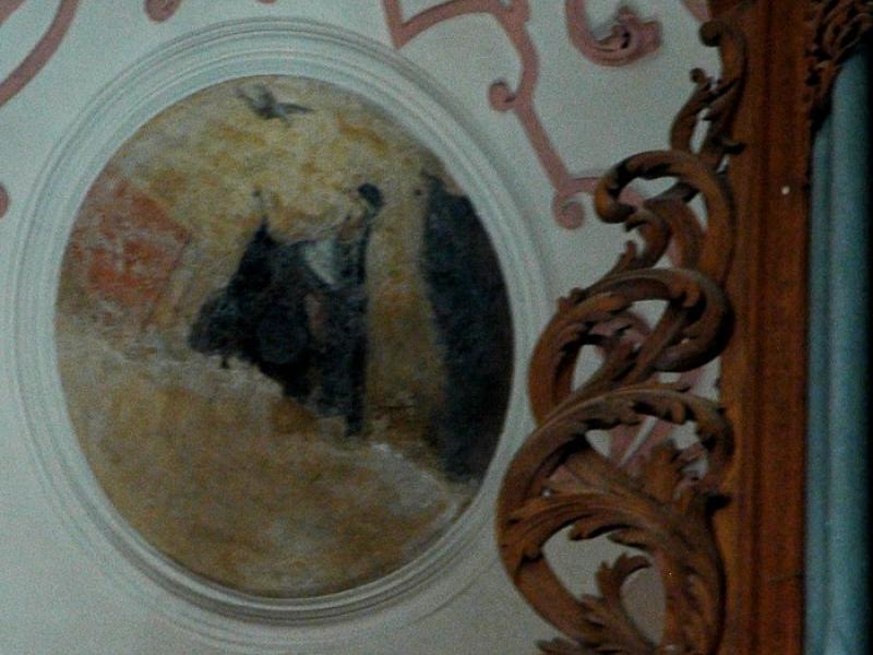 - 1. Ce sont ces dernières qui ont le plus souffert du badigeon de la Révolution et de la restauration du XIXe s. ; certaines sont devenues presque incompréhensibles. Les médaillons circulaires de part et d’autre de la scène de Ste Cécile jouant de l’orgue avec des anges musiciens sont même si abîmés qu’on n’en distingue plus rien.