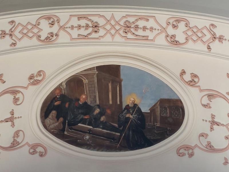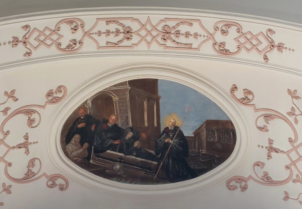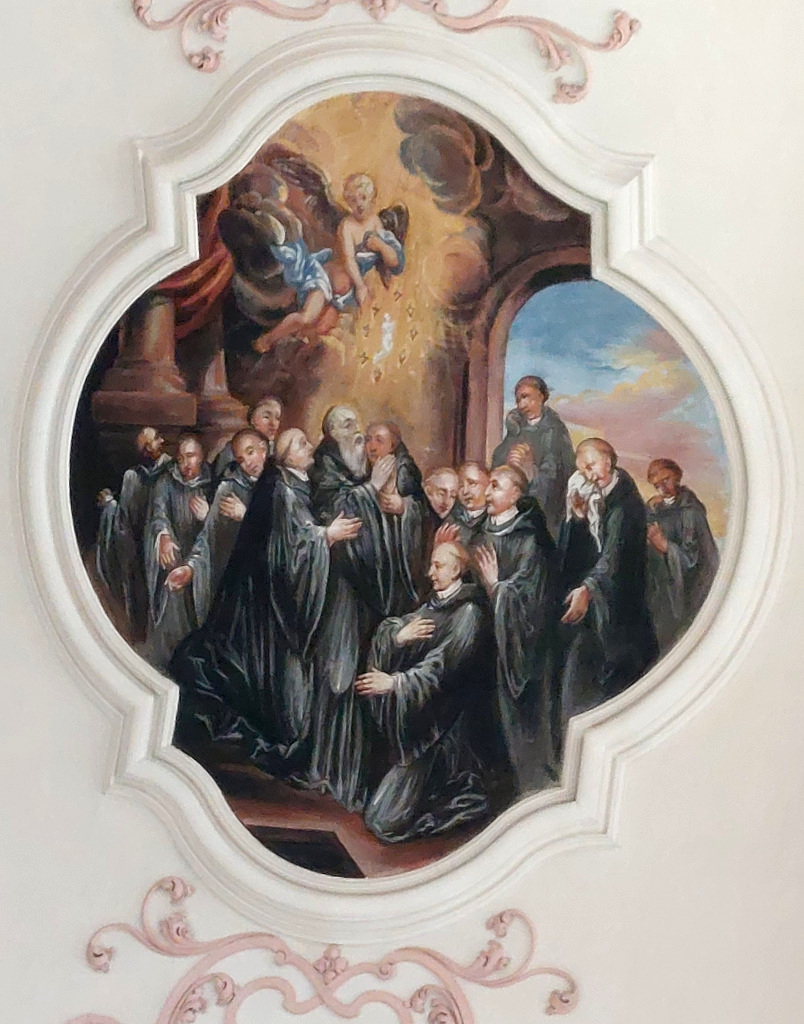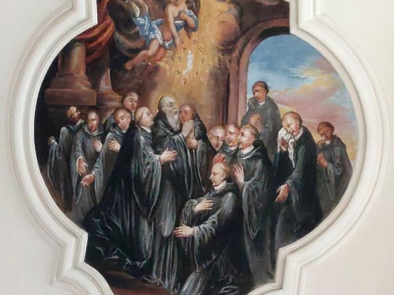 Le plafond du transept Nord est à son tour orné d’un médaillon qui répond à celui du transept Sud : d’une forme semblable, il représente la mort de saint Benoît, dont on voit la tombe entourée de moines éplorés, et la montée de son âme aux Cieux, accueillie par des anges sous la forme d’une petite figure blanche.