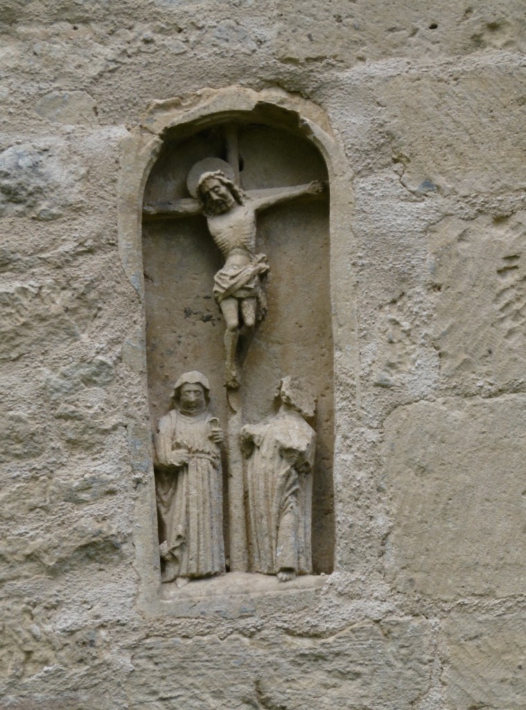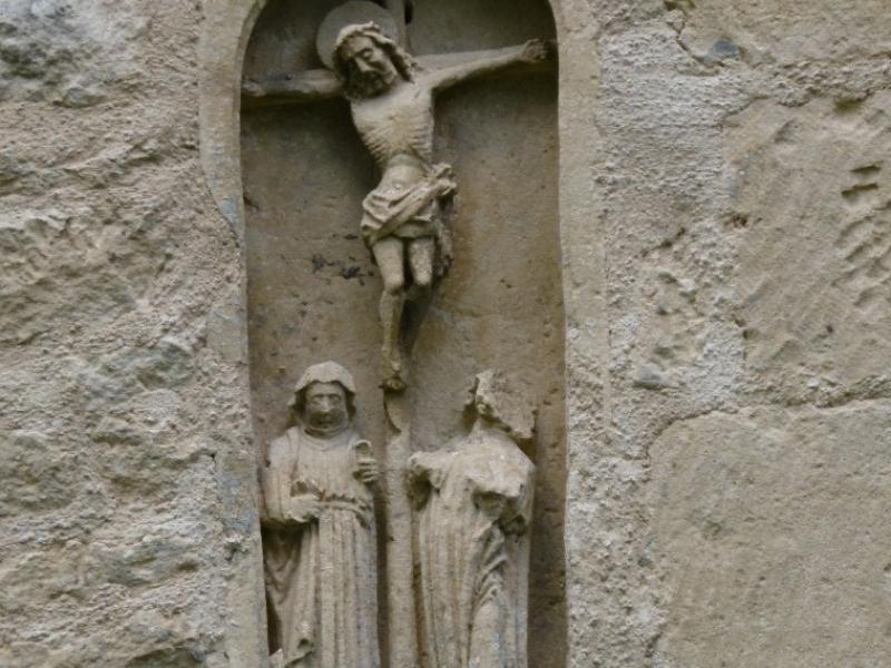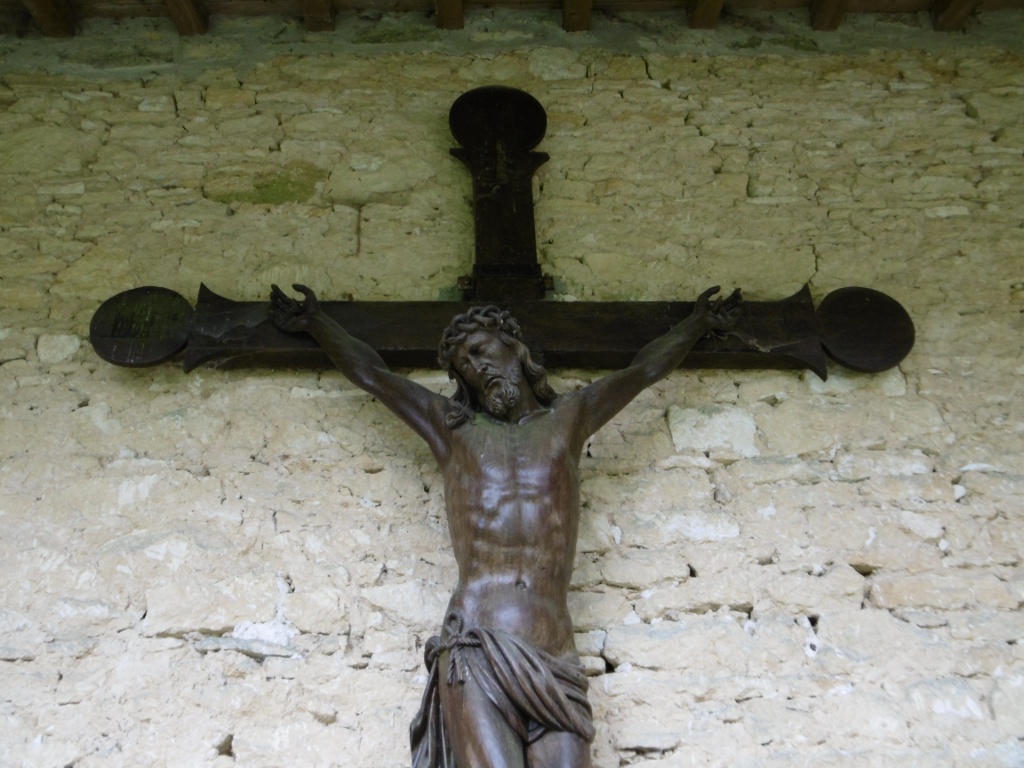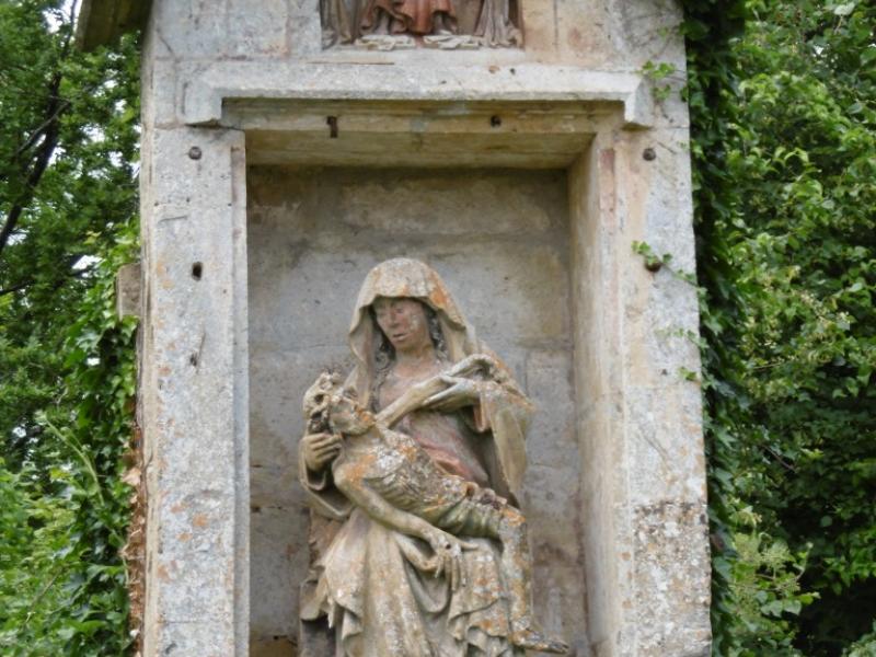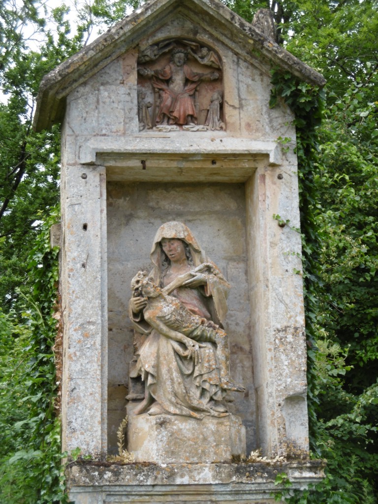 De l’autre côté de la vallée, le cimetière s’étend sur le mont St-Hilaire, sous la protection de l’église qui fut jusqu’au XIIIe s. le premier sanctuaire de Marville. Construite dans le style roman, l’église St-Hilaire ne comporte qu’une nef à charpente apparente et un chœur, plus étroit et voûté d’ogives. Au XVe s., on établit des autels latéraux dans des niches creusées dans le mur. L’autel du Saint-Esprit fut consacré en 1408 par Bertrand d’Arrancy et son épouse ; on y a placé une statue en bois de St Hilaire (XVIIIe s.). Un autre autel, précédé d’un ciborium1, présente une belle Vierge à la Rose (XIVe s.).