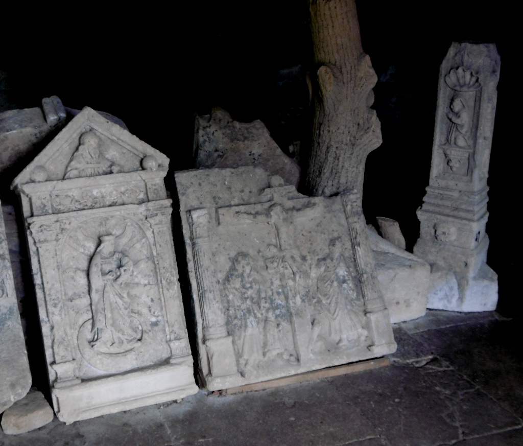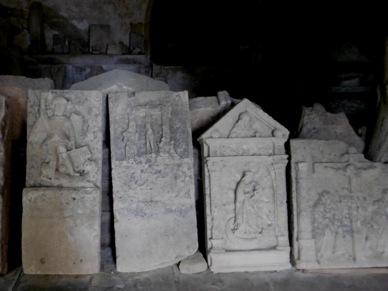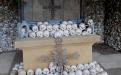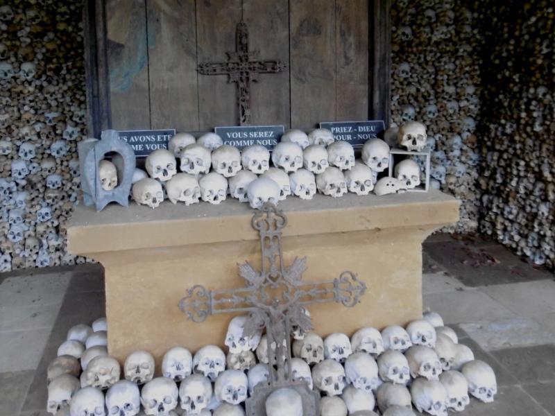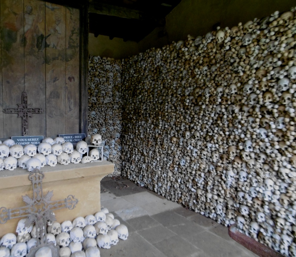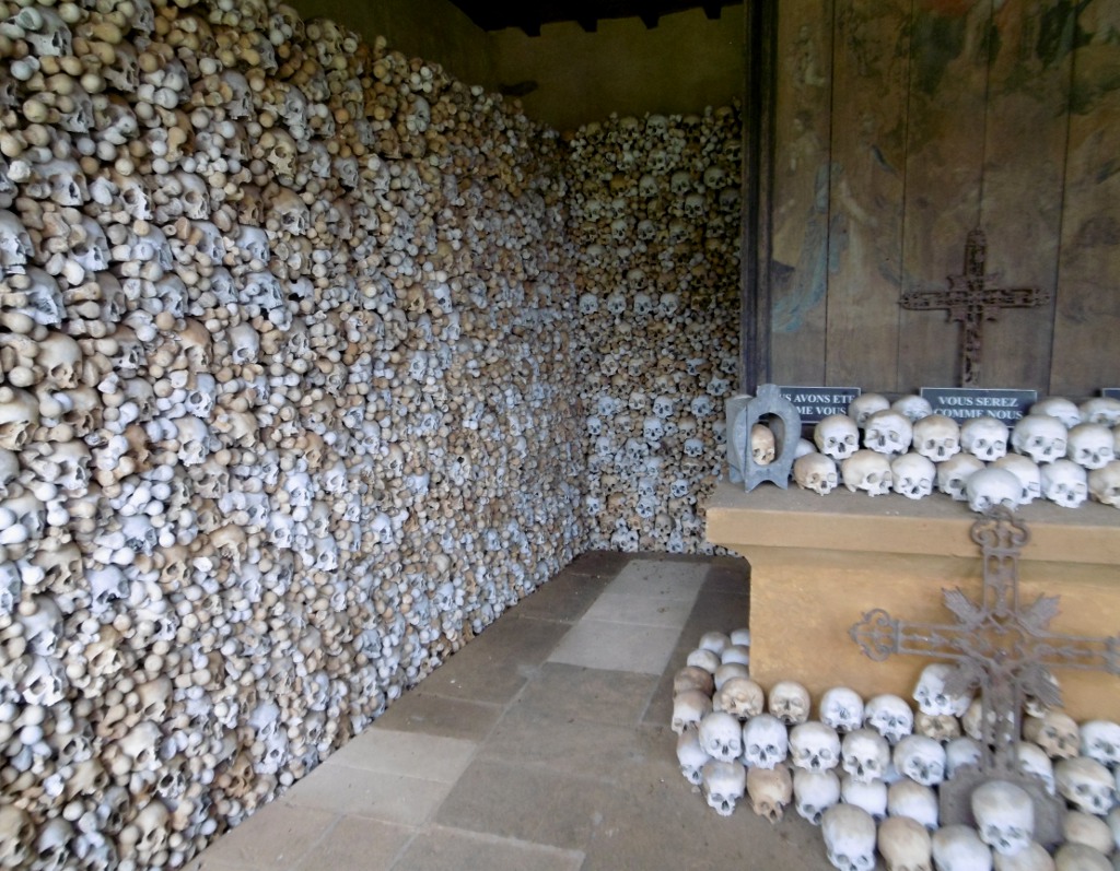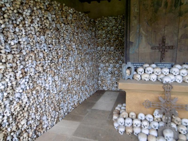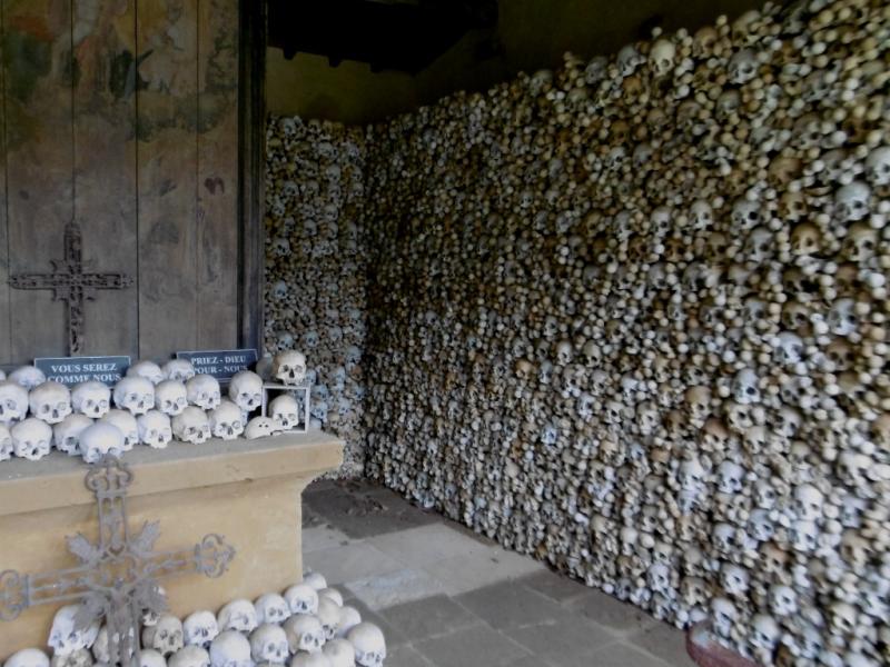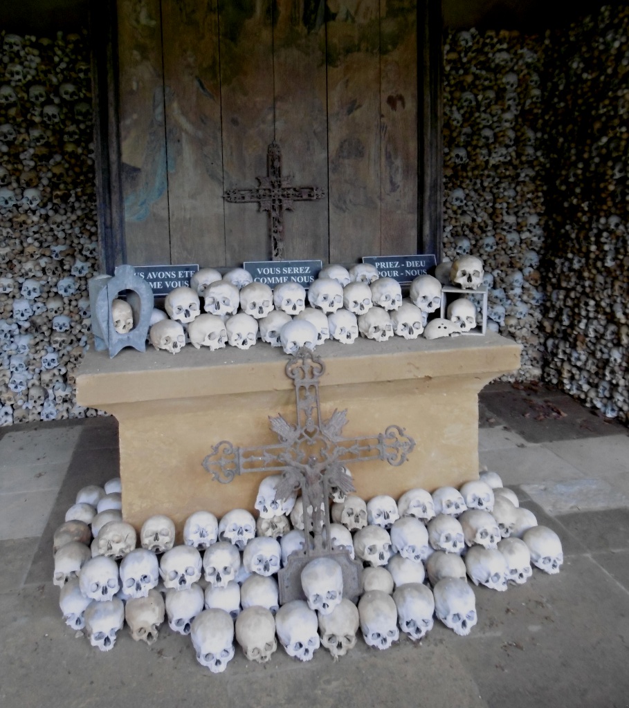 • 2. Selon un écriteau, l’ossuaire contiendrait 40 000 crânes, mais on n’en dénombra que 6 000 lors de la restauration du bâtiment (2015-2021). La confusion vient sans doute de ce qu’on avait compté tous les os, et pas seulement les crânes.