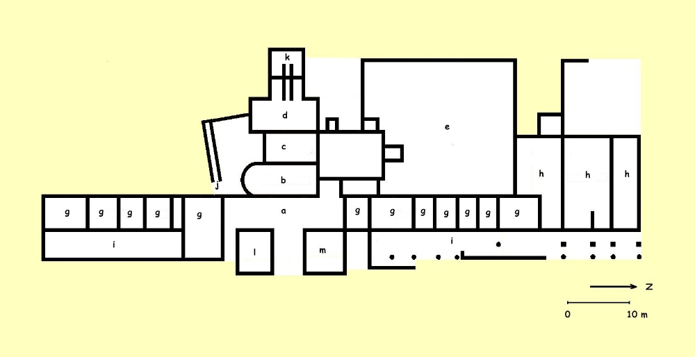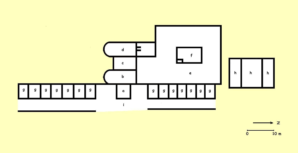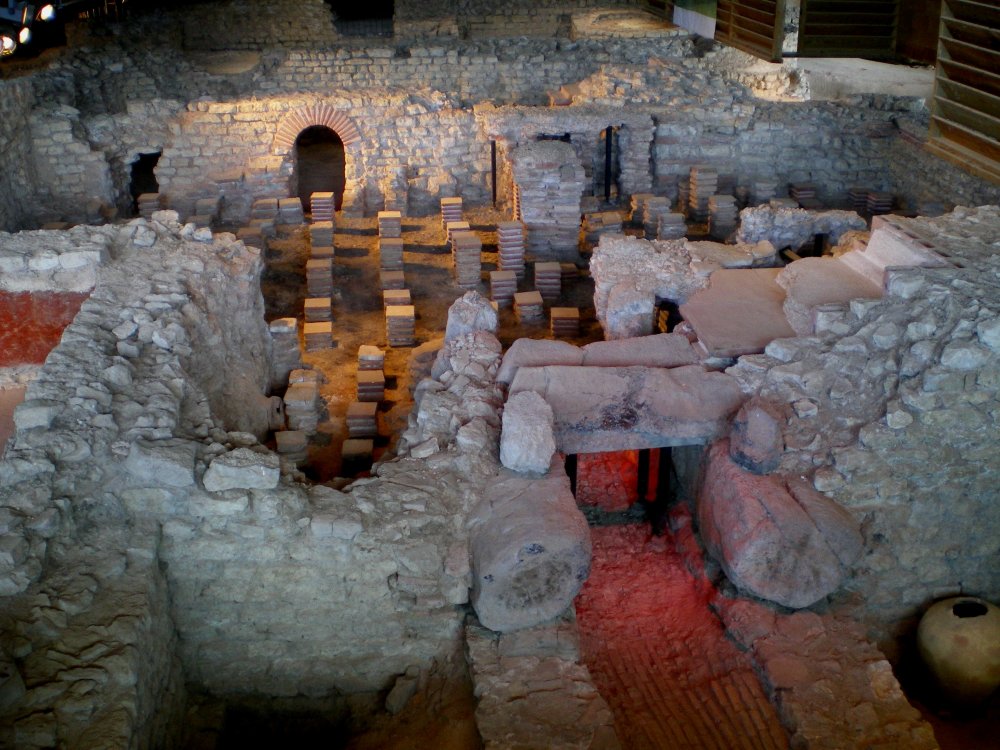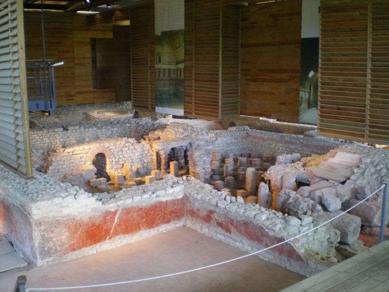 Plan du premier état des thermes. Croquis Marc Heilig À l'origine, ces thermes ne comprenaient guère que les éléments essentiels à ce genre d'établissement. L'entrée se faisait à l'est, par une salle qui devait aussi servir de vestiaires (a sur le plan). De là on pénétrait dans trois salles en enfilade correspondant à la progression des bains : une pièce froide (frigidarium, b), une tiède (tepidarium, c), puis une chaude (caldarium, d). Attenante à cet ensemble, une cour à ciel ouvert (e), avec bassin central (f), accueillait les amateurs d'exercices de sport. De chaque côté de l'entrée, une suite de boutiques courrait le long de la façade de l'édifice (g) ; d'autres, comprenant aussi des ateliers, occupaient un bâtiment séparé, au nord de la cour (h). Un portique s'étendait devant cet ensemble et lui donnait une certaine unité (i).